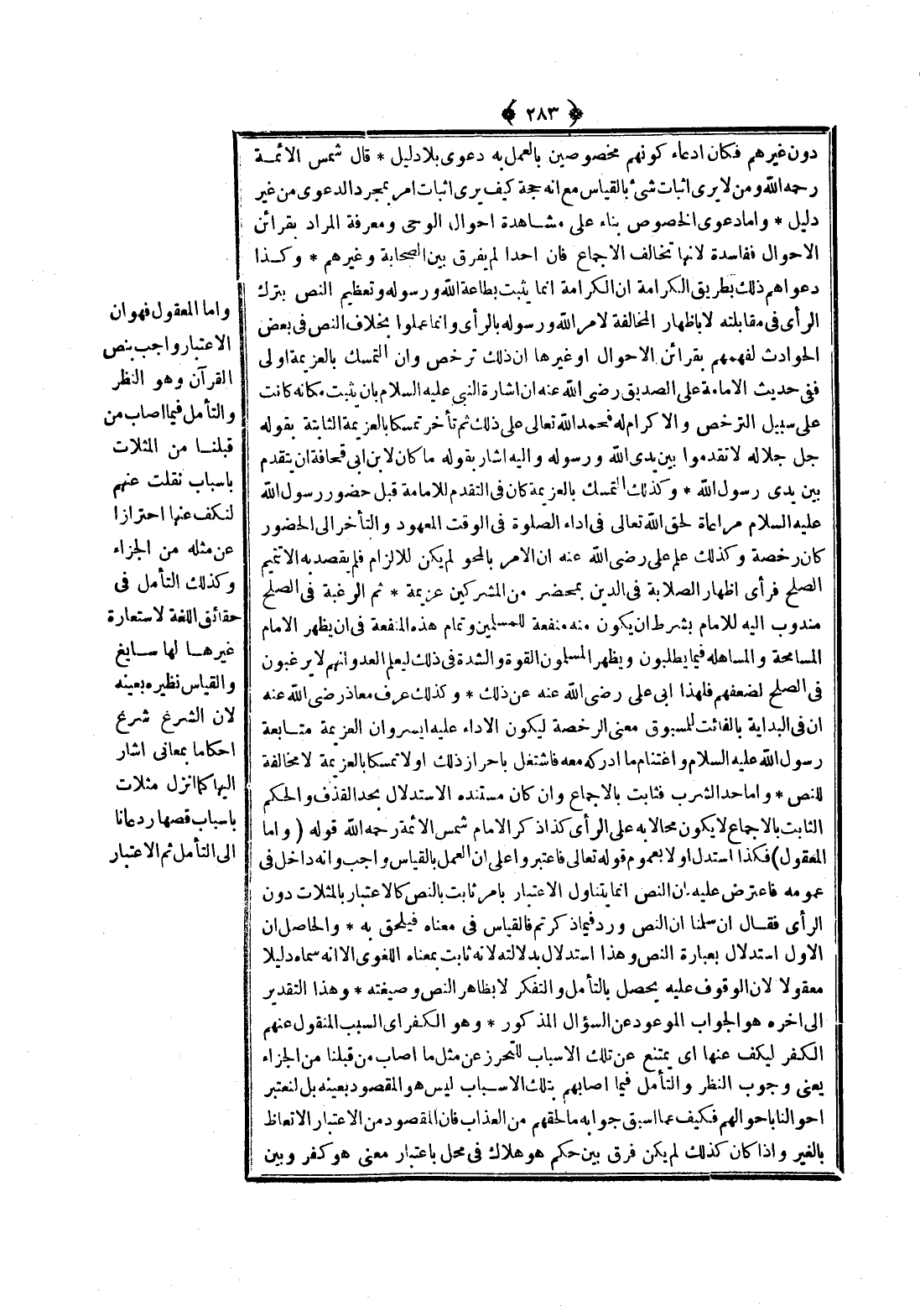 وَكَذَا دَعْوَاهُمْ ذَلِكَ بِطَرِيقِ الْكَرَامَةِ أَنَّ الْكَرَامَةَ إنَّمَا تَثْبُتُ بِطَاعَةِ اللَّهِ وَرَسُولِهِ وَتَعْظِيمِ النَّصِّ بِتَرْكِ الرَّأْيِ فِي مُقَابَلَتِهِ لَا بِإِظْهَارِ الْمُخَالَفَةِ لِأَمْرِ اللَّهِ وَرَسُولِهِ بِالرَّأْيِ وَإِنَّمَا عَمِلُوا بِخِلَافِ النَّصِّ فِي بَعْضِ الْحَوَادِثِ لِفَهْمِهِمْ بِقَرَائِنِ الْأَحْوَالِ أَوْ غَيْرِهَا أَنَّ ذَلِكَ تَرَخُّصٌ، وَأَنَّ التَّمَسُّكَ بِالْعَزِيمَةِ أَوْلَى، فَفِي حَدِيثِ الْإِمَامَةِ عَلَى الصِّدِّيقِ - رَضِيَ اللَّهُ عَنْهُ - أَنَّ إشَارَةَ النَّبِيِّ - عَلَيْهِ السَّلَامُ - بِأَنْ يَثْبُتَ مَكَانَهُ كَانَتْ عَلَى سَبِيلِ التَّرَخُّصِ وَالْإِكْرَامِ لَهُ فَحَمِدَ اللَّهَ تَعَالَى عَلَى ذَلِكَ، ثُمَّ تَأَخَّرَ تَمَسُّكًا بِالْعَزِيمَةِ الثَّابِتَةِ بِقَوْلِهِ جَلَّ جَلَالُهُ «لَا تُقَدِّمُوا بَيْنَ يَدَيْ اللَّهِ وَرَسُولِهِ» وَإِلَيْهِ أَشَارَ بِقَوْلِهِ مَا كَانَ لِابْنِ أَبِي قُحَافَةَ أَنْ يَتَقَدَّمَ بَيْنَ يَدَيْ رَسُولِ اللَّهِ، وَكَذَلِكَ التَّمَسُّكُ بِالْعَزِيمَةِ كَانَ فِي التَّقَدُّمِ لِلْإِمَامَةِ قَبْلَ حُضُورِ رَسُولِ اللَّهِ - عَلَيْهِ السَّلَامُ - مُرَاعَاةً لِحَقِّ اللَّهِ تَعَالَى فِي أَدَاءِ الصَّلَاةِ فِي الْوَقْتِ الْمَعْهُودِ وَالتَّأَخُّرُ إلَى الْحُضُورِ كَانَ رُخْصَةً.