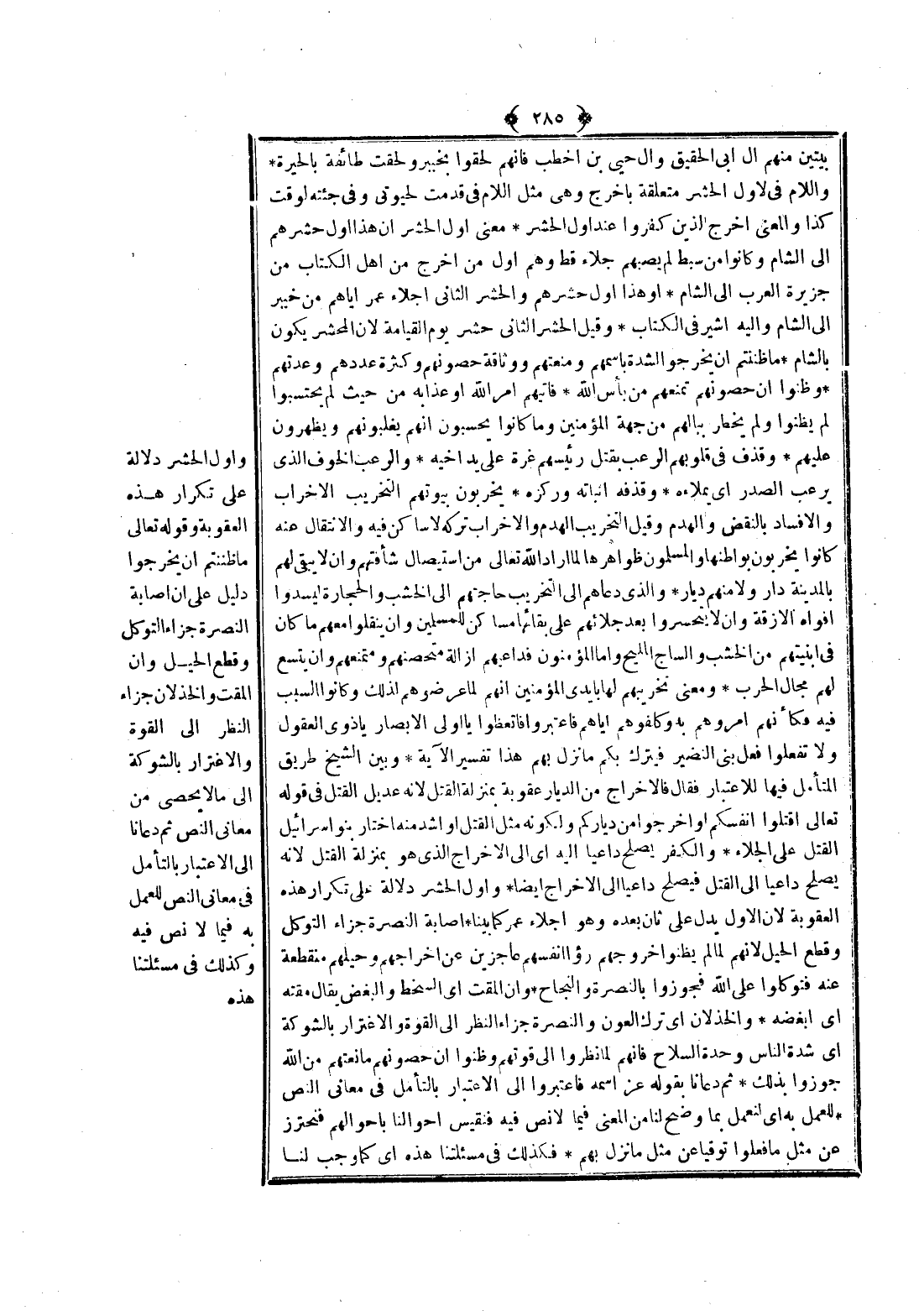 وَأَوَّلُ الْحَشْرِ دَلَالَةٌ عَلَى تَكْرَارِ هَذِهِ الْعُقُوبَةِ. وقَوْله تَعَالَى {مَا ظَنَنْتُمْ أَنْ يَخْرُجُوا} [الحشر: 2] دَلِيلٌ عَلَى أَنَّ إصَابَةَ النُّصْرَةِ جَزَاءُ التَّوَكُّلِ وَقَطْعُ الْحِيَلِ وَأَنَّ الْمَقْتَ وَالْخِذْلَانَ جَزَاءُ النَّظَرِ إلَى الْقُوَّةِ وَالِاغْتِرَارِ بِالشَّوْكَةِ إلَى مَا لَا يُحْصَى مِنْ مَعَانِي النَّصِّ ثُمَّ دَعَانَا إلَى الِاعْتِبَارِ بِالتَّأَمُّلِ فِي مَعَانِي النَّصِّ لِلْعَمَلِ بِهِ فِيمَا لَا نَصَّ فِيهِ، وَكَذَلِكَ فِي مَسْأَلَتِنَا هَذِهِ