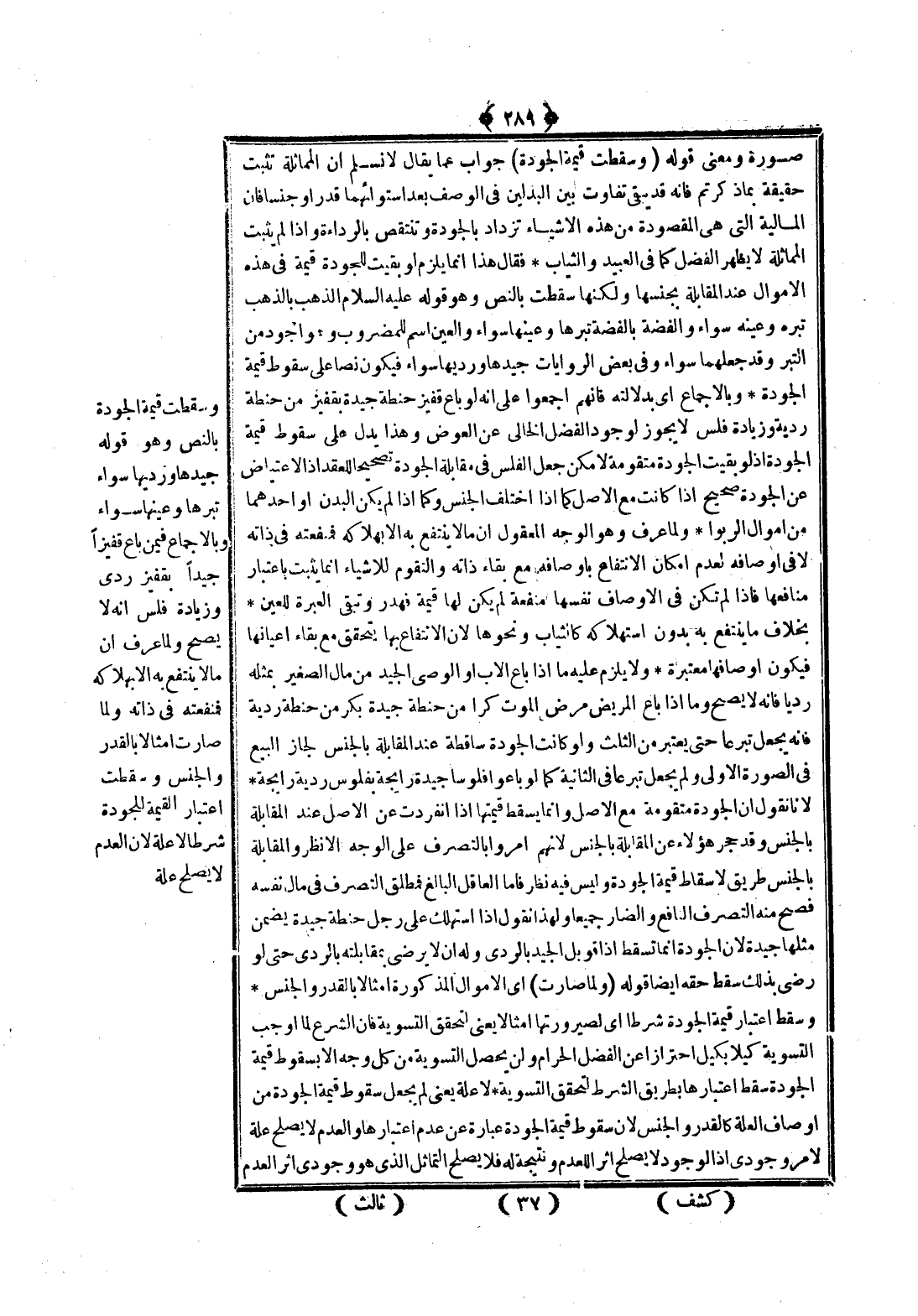 قَوْلُهُ (وَلَمَّا صَارَتْ) أَيْ الْأَمْوَالُ الْمَذْكُورَةُ أَمْثَالًا بِالْقَدْرِ وَالْجِنْسِ وَسَقَطَ اعْتِبَارُ قِيمَةِ الْجَوْدَةِ شَرْطًا أَيْ لِصَيْرُورَتِهَا أَمْثَالًا يَعْنِي لِتَحَقُّقِ التَّسْوِيَةِ؛ فَإِنَّ الشَّرْعَ لَمَّا أَوْجَبَ التَّسْوِيَةَ كَيْلًا بِكَيْلٍ احْتِرَازًا عَنْ الْفَضْلِ الْحَرَامِ وَلَنْ يَحْصُلَ التَّسْوِيَةُ مِنْ كُلِّ وَجْهٍ إلَّا بِسُقُوطِ قِيمَةِ الْجَوْدَةِ سَقَطَ اعْتِبَارُهَا بِطَرِيقِ الشَّرْطِ لِتَحَقُّقِ التَّسْوِيَةِ لَا عِلَّةً يَعْنِي لَمْ يَجْعَلْ سُقُوطَ قِيمَةِ الْجَوْدَةِ مِنْ أَوْصَافِ الْعِلَّةِ كَالْقَدْرِ وَالْجِنْسِ لِأَنَّ سُقُوطَ قِيمَةِ الْجَوْدَةِ عِبَارَةٌ عَنْ عَدَمِ اعْتِبَارِهَا وَالْعَدَمُ لَا يَصْلُحُ عِلَّةً لِأَمْرٍ وُجُودِيٍّ إذْ الْوُجُودُ لَا يَصْلُحُ أَثَرًا لِلْعَدَمِ وَنَتِيجَةً لَهُ فَلَا يَصْلُحُ التَّمَاثُلُ الَّذِي هُوَ وُجُودِيٌّ أَثَرًا لِعَدَمِ