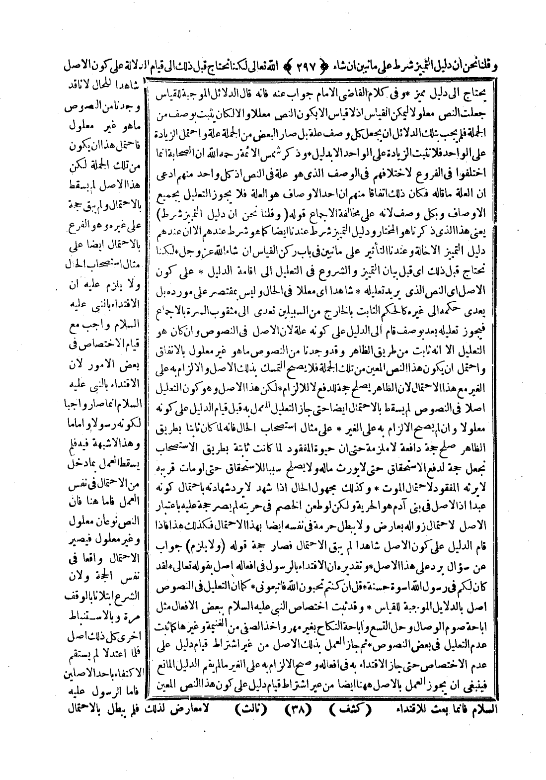فَأَمَّا هُنَا فَإِنَّ النَّصَّ نَوْعَانِ مَعْلُولٌ وَغَيْرُ مَعْلُولٍ فَيَصِيرُ الِاحْتِمَالُ وَاقِعًا فِي نَفْسِ الْحُجَّةِ، وَلِأَنَّ الشَّرْعَ ابْتَلَانَا بِالْمَوْقِفِ مَرَّةً وَبِالِاسْتِنْبَاطِ أُخْرَى كُلُّ ذَلِكَ أَصْلٌ فَلَمَّا اعْتَدَلَا لَمْ يَسْتَقِمْ الِاكْتِفَاءُ بِأَحَدِ الْأَصْلَيْنِ، فَأَمَّا الرَّسُولُ - عَلَيْهِ السَّلَامُ - فَإِنَّمَا بُعِثَ لِلِاقْتِدَاءِ لَا مُعَارِضَ لِذَلِكَ فَلَمْ يَبْطُلْ بِالِاحْتِمَالِ