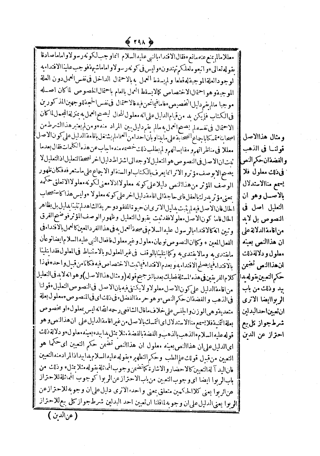 وَمِثَالُ هَذَا الْأَصْلِ قَوْلُنَا فِي الذَّهَبِ وَالْفِضَّةِ: إنَّ حُكْمَ النَّصِّ فِي ذَلِكَ مَعْلُولٌ فَلَا يُسْمَعُ مِنَّا الِاسْتِدْلَال بِالْأَصْلِ وَهُوَ أَنَّ التَّعْلِيلَ أَصْلٌ فِي النُّصُوصِ بَلْ لَا بُدَّ مِنْ إقَامَةِ الدَّلَالَةِ عَلَى أَنَّ هَذَا النَّصَّ بِعَيْنِهِ مَعْلُولٌ، وَدَلَالَةُ ذَلِكَ أَنَّ هَذَا النَّصَّ تَضَمَّنَ حُكْمَ التَّعْيِينِ بِقَوْلِهِ يَدًا بِيَدٍ، وَذَلِكَ مِنْ بَابِ الرِّبَا أَيْضًا أَلَا تَرَى أَنَّ تَعْيِينَ أَحَدِ الْبَدَلَيْنِ شَرْطَ جَوَازِ كُلِّ بَيْعٍ احْتِرَازٌ عَنْ الدَّيْنِ