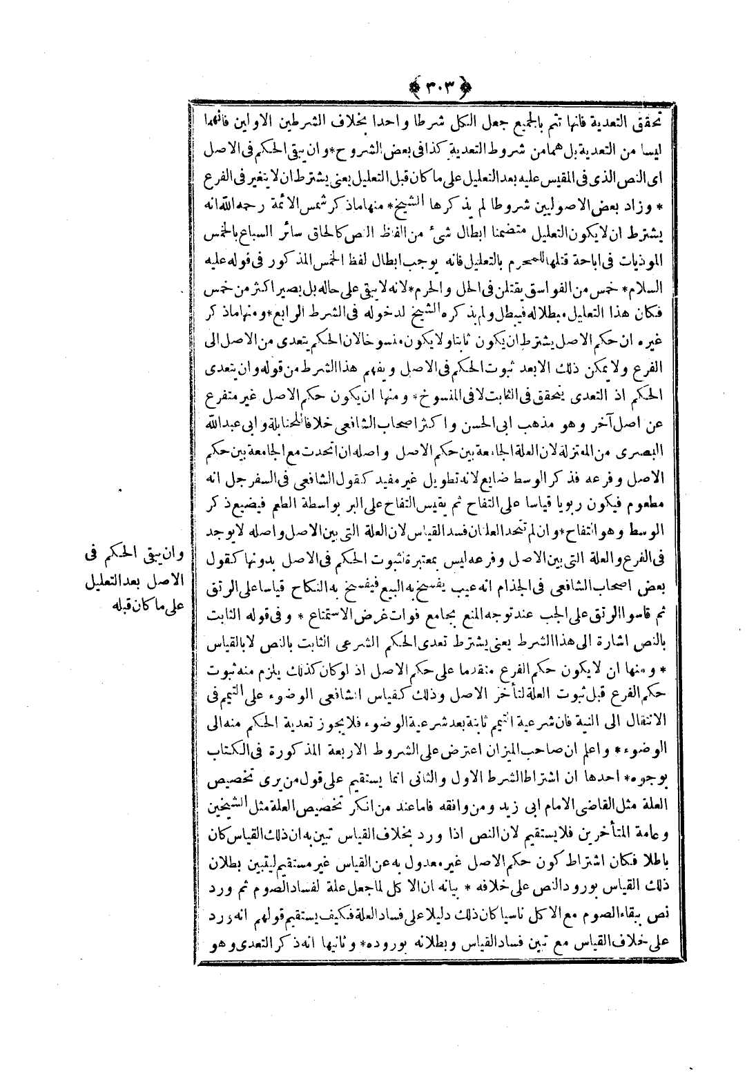 ـــــــــــــــــــــــــــــQتَحَقُّقِ التَّعْدِيَةِ فَإِنَّهَا تَتِمُّ بِالْجَمِيعِ، جَعَلَ الْكُلَّ شَرْطًا وَاحِدًا بِخِلَافِ الشَّرْطَيْنِ الْأَوَّلَيْنِ فَإِنَّهُمَا لَيْسَا مِنْ التَّعْدِيَةِ بَلْ هُمَا مِنْ شُرُوطِ التَّعْدِيَةِ كَذَا فِي بَعْضِ الشُّرُوحِ وَأَنْ يَبْقَى الْحُكْمُ فِي الْأَصْلِ أَيْ النَّصِّ الَّذِي فِي الْمَقِيسِ عَلَيْهِ بَعْدَ التَّعْلِيلِ عَلَى مَا كَانَ قَبْلَ التَّعْلِيلِ يَعْنِي يُشْتَرَطُ أَنْ لَا يَتَغَيَّرَ فِي الْفَرْعِ وَزَادَ بَعْضُ الْأُصُولِيِّينَ شُرُوطًا لَمْ يَذْكُرْهَا الشَّيْخُ وَمِنْهَا مَا ذَكَرَ شَمْسُ الْأَئِمَّةِ - رَحِمَهُ اللَّهُ - أَنَّهُ يُشْتَرَطُ أَنْ لَا يَكُونَ التَّعْلِيلُ مُتَضَمِّنًا إبْطَالَ شَيْءٍ مِنْ أَلْفَاظِ النَّصِّ كَإِلْحَاقِ سَائِرِ السِّبَاعِ بِالْخَمْسِ الْمُؤْذِيَاتِ فِي إبَاحَةِ قَتْلِهَا لِلْمُحْرِمِ بِالتَّعْلِيلِ فَإِنَّهُ يُوجِبُ إبْطَالَ لَفْظِ الْخَمْسِ الْمَذْكُورِ فِي قَوْلِهِ - عَلَيْهِ السَّلَامُ - «خَمْسٌ مِنْ الْفَوَاسِقِ يُقْتَلْنَ فِي الْحِلِّ وَالْحَرَمِ» ؛ لِأَنَّهُ لَا يَبْقَى عَلَى حَالِهِ بَلْ يَصِيرُ أَكْثَرَ مِنْ خَمْسٍ، فَكَانَ هَذَا التَّعْلِيلُ مُبْطِلًا لَهُ فَيَبْطُلُ، وَلَمْ يَذْكُرْهُ الشَّيْخُ لِدُخُولِهِ فِي الشَّرْطِ الرَّابِعِ وَمِنْهَا مَا ذَكَرَ غَيْرُهُ أَنَّ حُكْمَ الْأَصْلِ يُشْتَرَطُ أَنْ يَكُونَ ثَابِتًا، وَلَا يَكُونُ مَنْسُوخًا؛ لِأَنَّ الْحُكْمَ يَتَعَدَّى مِنْ الْأَصْلِ إلَى الْفَرْعِ وَلَا يُمْكِنُ ذَلِكَ إلَّا بَعْدَ ثُبُوتِ الْحُكْمِ فِي الْأَصْلِ، وَيُفْهَمُ هَذَا الشَّرْطُ مِنْ قَوْلِهِ: وَأَنْ يَتَعَدَّى الْحُكْمُ إذْ التَّعَدِّي يَتَحَقَّقُ فِي الثَّابِتِ لَا فِي الْمَنْسُوخِ.