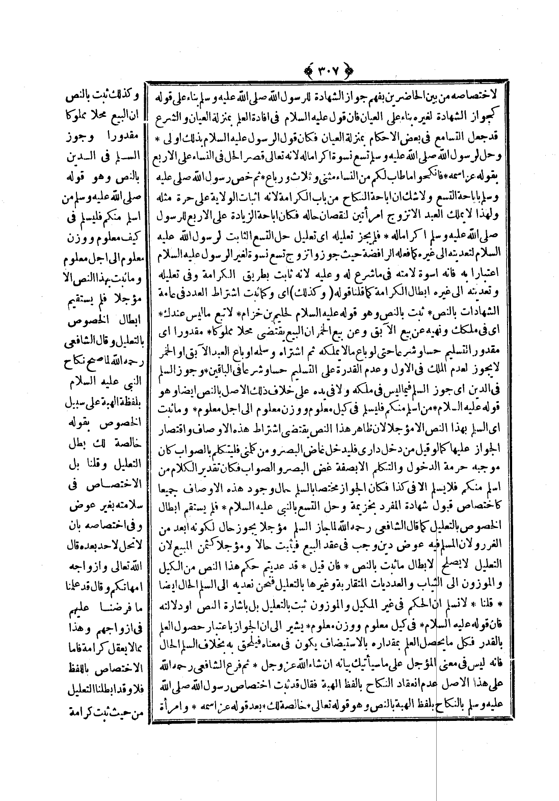 وَكَذَلِكَ ثَبَتَ بِالنَّصِّ أَنَّ لِلْبَيْعِ مَحَلًّا مَمْلُوكًا مَقْدُورًا، وَجُوِّزَ السَّلَمُ فِي الدَّيْنِ بِالنَّصِّ، وَهُوَ قَوْلُهُ - صَلَّى اللَّهُ عَلَيْهِ وَسَلَّمَ - «مَنْ أَسْلَمَ مِنْكُمْ فَلْيُسْلِمْ فِي كَيْلٍ مَعْلُومٍ وَوَزْنٍ مَعْلُومٍ إلَى أَجَلٍ مَعْلُومٍ» وَمَا ثَبَتَ بِهَذَا النَّصِّ إلَّا مُؤَجَّلًا فَلَمْ يَسْتَقِمْ إبْطَالُ الْخُصُوصِ بِالتَّعْلِيلِ، وَقَالَ الشَّافِعِيُّ - رَحِمَهُ اللَّهُ -: لَمَّا صَحَّ نِكَاحُ النَّبِيِّ - عَلَيْهِ السَّلَامُ - بِلَفْظَةِ الْهِبَةِ عَلَى سَبِيلِ الْخُصُوصِ بِقَوْلِهِ: {خَالِصَةً لَكَ} [الأحزاب: 50] بَطَلَ التَّعْلِيلُ، وَقُلْنَا بَلْ الِاخْتِصَاصُ فِي سَلَامَتِهِ بِغَيْرِ عِوَضٍ، وَفِي اخْتِصَاصِهِ بِأَنْ لَا تَحِلَّ لِأَحَدٍ بَعْدَهُ قَالَ اللَّهُ تَعَالَى {وَأَزْوَاجُهُ أُمَّهَاتُهُمْ} [الأحزاب: 6] ، وَقَالَ {قَدْ عَلِمْنَا مَا فَرَضْنَا عَلَيْهِمْ فِي أَزْوَاجِهِمْ} [الأحزاب: 50] وَهَذَا مِمَّا لَا يَعْقِلُ كَرَامَةً فَأَمَّا الِاخْتِصَاصُ بِاللَّفْظِ فَلَا وَقَدْ أَبْطَلْنَا التَّعْلِيلَ مِنْ حَيْثُ ثَبَتَ كَرَامَةً