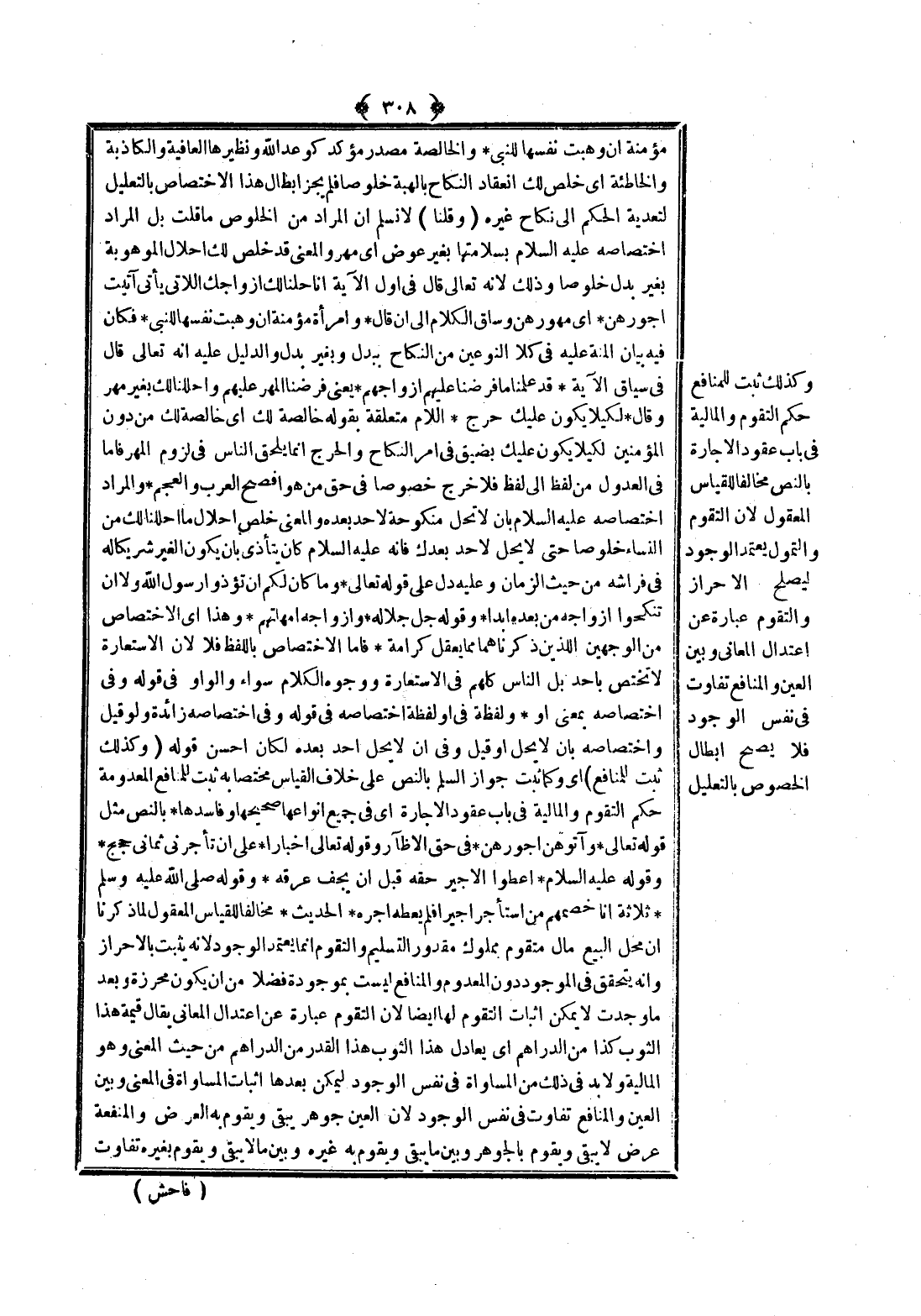 ـــــــــــــــــــــــــــــQ {وَامْرَأَةً مُؤْمِنَةً إِنْ وَهَبَتْ نَفْسَهَا لِلنَّبِيِّ} [الأحزاب: 50] وَالْخَالِصَةُ مَصْدَرٌ مُؤَكَّدٌ كَ وَعْدَ اللَّهِ وَنَظِيرُهَا الْعَافِيَةُ وَالْكَاذِبَةُ وَالْخَاطِئَةُ أَيْ خَلَصَ لَك انْعِقَادُ النِّكَاحِ بِالْهِبَةِ خُلُوصًا فَلَمْ يَجُزْ إبْطَالُ هَذَا الِاخْتِصَاصِ بِالتَّعْلِيلِ لِتَعْدِيَةِ الْحُكْمِ إلَى نِكَاحِ غَيْرِهِ، (وَقُلْنَا) : لَا نُسَلِّمُ أَنَّ الْمُرَادَ مِنْ الْخُلُوصِ مَا قُلْت بَلْ الْمُرَادُ اخْتِصَاصُهُ - عَلَيْهِ السَّلَامُ - بِسَلَامَتِهَا بِغَيْرِ عِوَضٍ أَيْ مَهْرٍ، وَالْمَعْنَى قَدْ خَلَصَ لَك إحْلَالُ الْمَوْهُوبَةِ بِغَيْرِ بَدَلٍ خُلُوصًا.