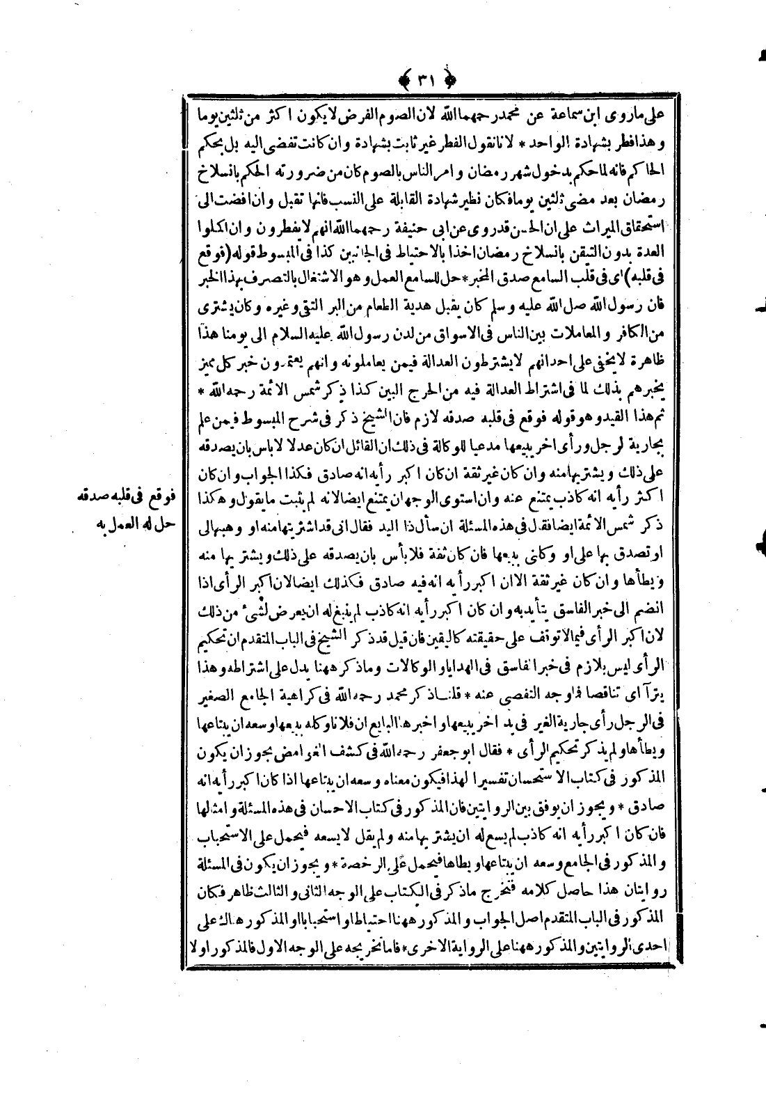 قَوْلُهُ (فَوَقَعَ فِي قَلْبِهِ) أَيْ فِي قَلْبِ السَّامِعِ صِدْقُ الْمُخْبِرِ حَلَّ لِلسَّامِعِ الْعَمَلُ، وَهُوَ الِاشْتِغَالُ بِالتَّصَرُّفِ بِهَذَا الْخَبَرِ؛ فَإِنَّ «رَسُولَ اللَّهِ - صَلَّى اللَّهُ عَلَيْهِ وَسَلَّمَ - كَانَ يَقْبَلُ هَدِيَّةَ الطَّعَامِ مِنْ الْبَرِّ التَّقِيِّ وَغَيْرِهِ وَكَانَ يَشْتَرِي مِنْ الْكَافِرِ» وَالْمُعَامَلَاتُ بَيْنَ النَّاسِ فِي الْأَسْوَاقِ مِنْ لَدُنْ رَسُولِ اللَّهِ - عَلَيْهِ السَّلَامُ - إلَى يَوْمِنَا هَذَا ظَاهِرَةٌ لَا يَخْفَى عَلَى أَحَدٍ أَنَّهُمْ لَا يَشْتَرِطُونَ الْعَدَالَةَ فِيمَنْ يُعَامِلُونَهُ وَأَنَّهُمْ يَعْتَمِدُونَ خَبَرَ كُلِّ مُمَيِّزٍ يُخْبِرُهُمْ بِذَلِكَ لِمَا فِي اشْتِرَاطِ الْعَدَالَةِ فِيهِ مِنْ الْحَرَجِ الْبَيِّنِ كَذَا ذَكَرَ شَمْسُ الْأَئِمَّةِ - رَحِمَهُ اللَّهُ - ثُمَّ هَذَا الْقَيْدُ، وَهُوَ قَوْلُهُ فَوَقَعَ فِي قَلْبِهِ صِدْقُهُ لَازِمٌ؛ فَإِنَّ الشَّيْخَ ذَكَرَ فِي شَرْحِ الْمَبْسُوطِ فِيمَنْ عَلِمَ بِجَارِيَةٍ لِرَجُلٍ وَرَأَى آخَرَ يَبِيعُهَا مُدَّعِيًا لِلْوَكَالَةِ فِي ذَلِكَ أَنَّ الْقَائِلَ إنْ كَانَ عَدْلًا لَا بَأْسَ بِأَنْ يُصَدِّقَهُ عَلَى ذَلِكَ وَيَشْتَرِيَهَا مِنْهُ، وَإِنْ كَانَ غَيْرَ ثِقَةٍ إنْ كَانَ أَكْبَرَ رَأْيِهِ أَنَّهُ صَادِقٌ، فَكَذَا الْجَوَابُ وَإِنْ كَانَ أَكْثَرُ رَأْيِهِ أَنَّهُ كَاذِبٌ يُمْتَنَعُ عَنْهُ وَإِنْ اسْتَوَى الْوَجْهَانِ يُمْتَنَعُ أَيْضًا؛ لِأَنَّهُ لَمْ يُثْبِتْ مَا يَقُولُ، وَهَكَذَا ذَكَرَ شَمْسُ الْأَئِمَّةِ أَيْضًا فَقِيلَ فِي هَذِهِ الْمَسْأَلَةِ إنْ سَأَلَ ذَا الْيَدِ فَقَالَ إنِّي قَدْ اشْتَرَيْتهَا مِنْهُ أَوْ وَهَبَهَا لِي أَوْ تَصَدَّقَ بِهَا عَلَيَّ أَوْ وَكَّلَنِي بِبَيْعِهَا فَإِنْ كَانَ ثِقَةً فَلَا بَأْسَ بِأَنْ يُصَدِّقَهُ عَلَى ذَلِكَ وَيَشْتَرِيَهَا مِنْهُ وَيَطَأَهَا وَإِنْ كَانَ غَيْرَ ثِقَةٍ إلَّا أَنَّ أَكْبَرَ رَأْيِهِ أَنَّهُ فِيهِ صَادِقٌ فَكَذَلِكَ أَيْضًا؛ لِأَنَّ أَكْبَرَ الرَّأْيِ إذَا انْضَمَّ إلَى خَبَرِ الْفَاسِقِ يَتَأَيَّدُ بِهِ وَإِنْ كَانَ أَكْبَرُ رَأْيِهِ أَنَّهُ كَاذِبٌ لَمْ يَنْبَغِ لَهُ أَنْ يَعْرِضَ لِشَيْءٍ مِنْ ذَلِكَ؛ لِأَنَّ أَكْبَرَ الرَّأْيِ فِيمَا لَا تَوَقُّفَ عَلَى حَقِيقَتِهِ كَالْيَقِينِ فَإِنْ قِيلَ قَدْ ذَكَرَ الشَّيْخُ فِي الْبَابِ الْمُتَقَدِّمِ أَنَّ تَحْكِيمَ الرَّأْيِ لَيْسَ بِلَازِمٍ فِي خَبَرِ الْفَاسِقِ فِي الْهَدَايَا وَالْوَكَالَاتِ وَمَا ذُكِرَ هَاهُنَا يَدُلُّ عَلَى اشْتِرَاطِهِ وَهَذَا يَتَرَاءَى لِي تَنَاقُصًا فَمَا وَجْهُ التَّقَصِّي عَنْهُ.