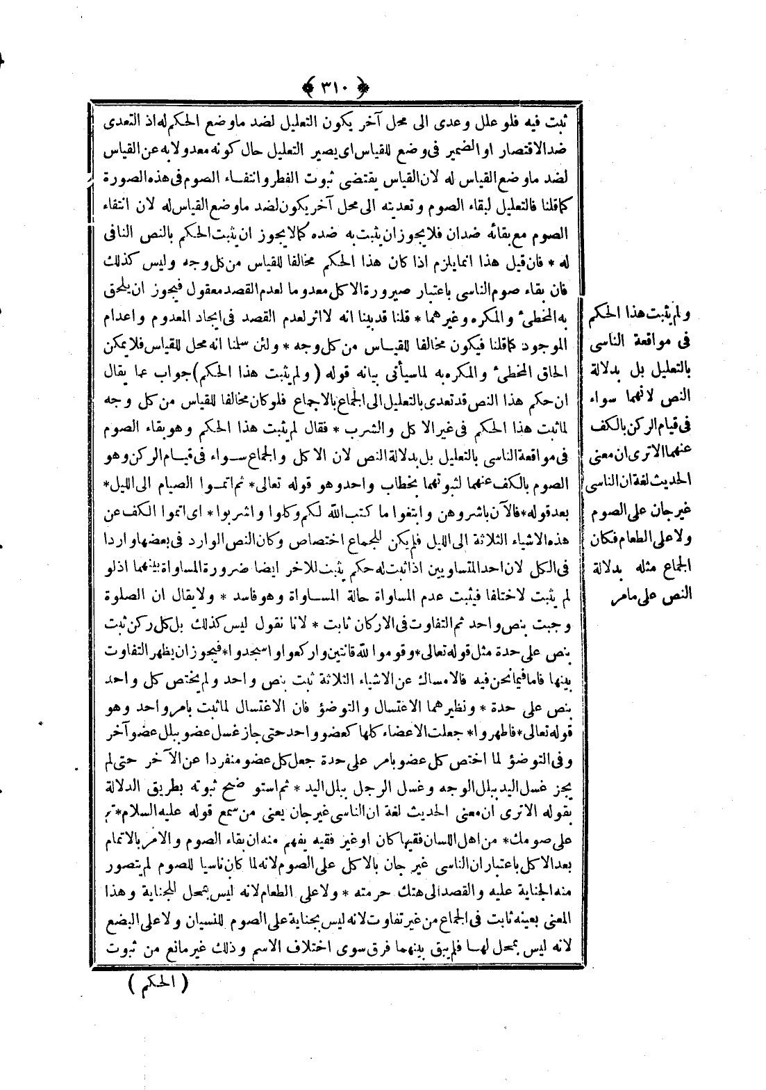 قَوْلُهُ: (وَلَمْ يَثْبُتْ هَذَا الْحُكْمُ) جَوَابٌ عَمَّا يُقَالُ: إنَّ حُكْمَ هَذَا النَّصِّ قَدْ تَعَدَّى بِالتَّعْلِيلِ إلَى الْجِمَاعِ بِالْإِجْمَاعِ فَلَوْ كَانَ مُخَالِفًا لِلْقِيَاسِ مِنْ كُلِّ وَجْهٍ لَمَا ثَبَتَ هَذَا الْحُكْمُ فِي غَيْرِ الْأَكْلِ وَالشُّرْبِ فَقَالَ: لَمْ يَثْبُتْ هَذَا الْحُكْمُ وَهُوَ بَقَاءُ الصَّوْمِ فِي مُوَاقَعَةِ النَّاسِي بِالتَّعْلِيلِ بَلْ بِدَلَالَةِ النَّصِّ؛ لِأَنَّ الْأَكْلَ وَالْجِمَاعَ سَوَاءٌ فِي قِيَامِ الرُّكْنِ وَهُوَ الصَّوْمُ بِالْكَفِّ عَنْهُمَا لِثُبُوتِهِمَا بِخِطَابٍ وَاحِدٍ وَهُوَ قَوْله تَعَالَى {ثُمَّ أَتِمُّوا الصِّيَامَ إِلَى اللَّيْلِ} [البقرة: 187] بَعْدَ قَوْلِهِ {فَالآنَ بَاشِرُوهُنَّ وَابْتَغُوا مَا كَتَبَ اللَّهُ لَكُمْ وَكُلُوا وَاشْرَبُوا} [البقرة: 187] أَيْ أَتِمُّوا الْكَفَّ عَنْ هَذِهِ الْأَشْيَاءِ الثَّلَاثَةِ إلَى اللَّيْلِ فَلَمْ يَكُنْ لِلْجِمَاعِ اخْتِصَاصٌ، وَكَانَ النَّصُّ الْوَارِدُ فِي بَعْضِهَا وَارِدًا فِي الْكُلِّ؛ لِأَنَّ أَحَدَ الْمُتَسَاوِيَيْنِ إذَا ثَبَتَ لَهُ حُكْمٌ يَثْبُتُ لِلْآخَرِ أَيْضًا ضَرُورَةَ الْمُسَاوَاةِ بَيْنَهُمَا؛ إذْ لَوْ لَمْ يَثْبُتْ لَاخْتَلَفَا فَيَثْبُتُ عَدَمُ الْمُسَاوَاةِ حَالَةَ الْمُسَاوَاةِ، وَهُوَ فَاسِدٌ.