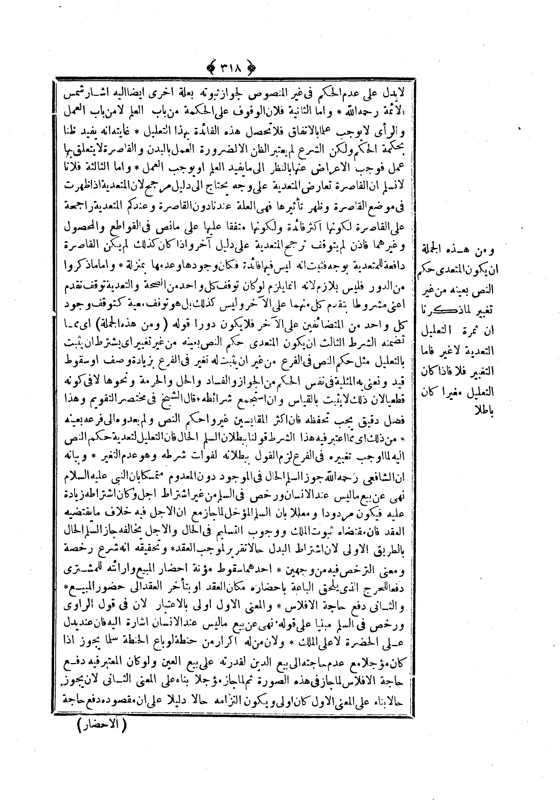 قَوْلُهُ: (وَمِنْ هَذِهِ الْجُمْلَةِ) أَيْ مِمَّا تَضَمَّنَهُ الشَّرْطُ الثَّالِثُ: أَنْ يَكُونَ الْمُتَعَدِّي حُكْمَ النَّصِّ بِعَيْنِهِ مِنْ غَيْرِ تَغْيِيرٍ أَيْ يُشْتَرَطُ أَنْ يَثْبُتَ بِالتَّعْلِيلِ مِثْلَ حُكْمِ النَّصِّ فِي الْفَرْعِ مِنْ غَيْرِ أَنْ يَثْبُتَ لَهُ تَغَيُّرٌ فِي الْفَرْعِ بِزِيَادَةِ وَصْفٍ أَوْ سُقُوطِ قَيْدٍ، وَنَعْنِي بِهِ الْمِثْلِيَّةَ فِي نَفْسِ الْحُكْمِ مِنْ الْجَوَازِ وَالْفَسَادِ وَالْحِلِّ وَالْحُرْمَةِ وَنَحْوِهَا لَا فِي كَوْنِهِ قَطْعِيًّا؛ لِأَنَّ ذَلِكَ لَا يَثْبُتُ بِالْقِيَاسِ، وَإِنْ اسْتَجْمَعَ شَرَائِطَهُ قَالَ الشَّيْخُ فِي مُخْتَصَرِ التَّقْوِيمِ: وَهَذَا فَصْلٌ دَقِيقٌ يَجِبُ تَحَفُّظُهُ فَإِنَّ أَكْثَرَ الْمُقَايِسِينَ غَيَّرُوا حُكْمَ النَّصِّ وَلَمْ يَعُدُّوهُ إلَى فَرْعِهِ بِعَيْنِهِ مِنْ ذَلِكَ أَيْ مِمَّا اُعْتُبِرَ فِيهِ هَذَا الشَّرْطُ قَوْلُنَا: بُطْلَانُ السَّلَمِ الْحَالِّ فَإِنَّ التَّعْلِيلَ لِتَعْدِيَةِ حُكْمِ النَّصِّ إلَيْهِ لَمَّا أَوْجَبَ تَغْيِيرَهُ فِي الْفَرْعِ لَزِمَ الْقَوْلُ بِبُطْلَانِهِ لِفَوَاتِ شَرْطِهِ وَهُوَ عَدَمُ التَّغَيُّرِ.