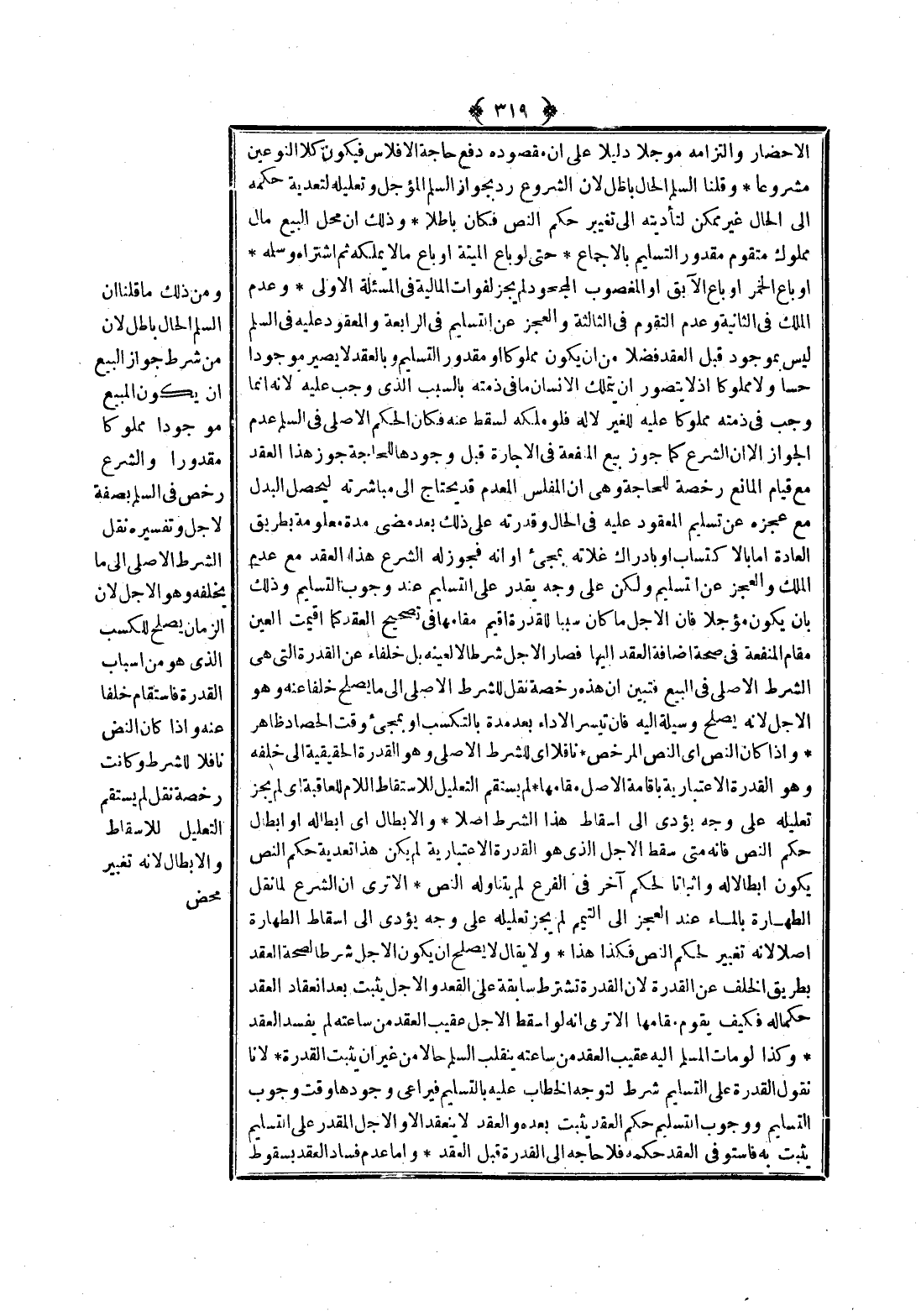 وَذَلِكَ بِأَنْ يَكُونَ مُؤَجَّلًا فَإِنَّ الْأَجَلَ لَمَّا كَانَ سَبَبًا لِلْقُدْرَةِ أُقِيمَ مَقَامَهَا فِي تَصْحِيحِ الْعَقْدِ كَمَا أُقِيمَتْ الْعَيْنُ مَقَامَ الْمَنْفَعَةِ فِي صِحَّةِ إضَافَةِ الْعَقْدِ إلَيْهَا فَصَارَ الْأَجَلُ شَرْطًا لَا لِعَيْنِهِ بَلْ خَلَفًا عَنْ الْقُدْرَةِ الَّتِي هِيَ الشَّرْطُ الْأَصْلِيُّ فِي الْبَيْعِ فَتَبَيَّنَ أَنَّ هَذِهِ رُخْصَةُ نَقْلٍ لِلشَّرْطِ الْأَصْلِيِّ إلَى مَا يَصْلُحُ خَلَفًا عَنْهُ، وَهُوَ الْأَجَلُ؛ لِأَنَّهُ يَصْلُحُ وَسِيلَةً إلَيْهِ فَإِنَّ تَيَسُّرَ الْأَدَاءِ بَعْدَ مُدَّةٍ بِالتَّكَسُّبِ أَوْ بِمَجِيءِ وَقْتِ الْحَصَادِ ظَاهِرٌ وَإِذَا كَانَ النَّصُّ أَيْ النَّصُّ الْمُرَخِّصُ نَاقِلًا أَيْ لِلشَّرْطِ الْأَصْلِيِّ وَهُوَ الْقُدْرَةُ الْحَقِيقِيَّةُ إلَى خَلَفِهِ، وَهُوَ الْقُدْرَةُ الِاعْتِبَارِيَّةُ بِإِقَامَةِ الْأَصْلِ مَقَامَهَا لَمْ يَسْتَقِمْ التَّعْلِيلُ لِلِاسْتِقَاطِ، اللَّامُ لِلْعَاقِبَةِ أَيْ يَجُزْ تَعْلِيلُهُ عَلَى وَجْهٍ يُؤَدِّي إلَى إسْقَاطِ هَذَا الشَّرْطِ أَصْلًا وَالْإِبْطَالُ أَيْ إبْطَالُهُ أَوْ إبْطَالُ حُكْمِ النَّصِّ فَإِنَّهُ مَتَى سَقَطَ الْأَجَلُ الَّذِي هُوَ الْقُدْرَةُ الِاعْتِبَارِيَّةُ لَمْ يَكُنْ هَذَا تَعْدِيَةَ حُكْمِ النَّصِّ يَكُونُ إبْطَالًا لَهُ وَإِثْبَاتًا لِحُكْمٍ آخَرَ فِي الْفَرْعِ لَمْ يَتَنَاوَلْهُ النَّصُّ أَلَا تَرَى أَنَّ الشَّرْعَ لَمَّا نَقَلَ الطَّهَارَةَ بِالْمَاءِ عِنْدَ الْعَجْزِ إلَى التَّيَمُّمِ لَمْ يَجُزْ تَعْلِيلُهُ عَلَى وَجْهٍ يُؤَدِّي إلَى إسْقَاطِ الطَّهَارَةِ أَصْلًا؛ لِأَنَّهُ تَغْيِيرٌ لِحُكْمِ النَّصِّ فَكَذَا هَذَا وَلَا يُقَالُ: لَا يَصْلُحُ أَنْ يَكُونَ الْأَجَلُ شَرْطًا لِصِحَّةِ الْعَقْدِ بِطَرِيقِ الْخَلَفِ عَنْ الْقُدْرَةِ؛ لِأَنَّ الْقُدْرَةَ تُشْتَرَطُ سَابِقَةً عَلَى الْعَقْدِ، وَالْأَجَلُ يَثْبُتُ بَعْدَ انْعِقَادِ الْعَقْدِ حُكْمًا لَهُ فَكَيْفَ يَقُومُ مَقَامَهَا أَلَا تَرَى أَنَّهُ لَوْ أَسْقَطَ الْأَجَلَ عَقِيبَ الْعَقْدِ مِنْ سَاعَتِهِ لَمْ يَفْسُدْ الْعَقْدُ.
