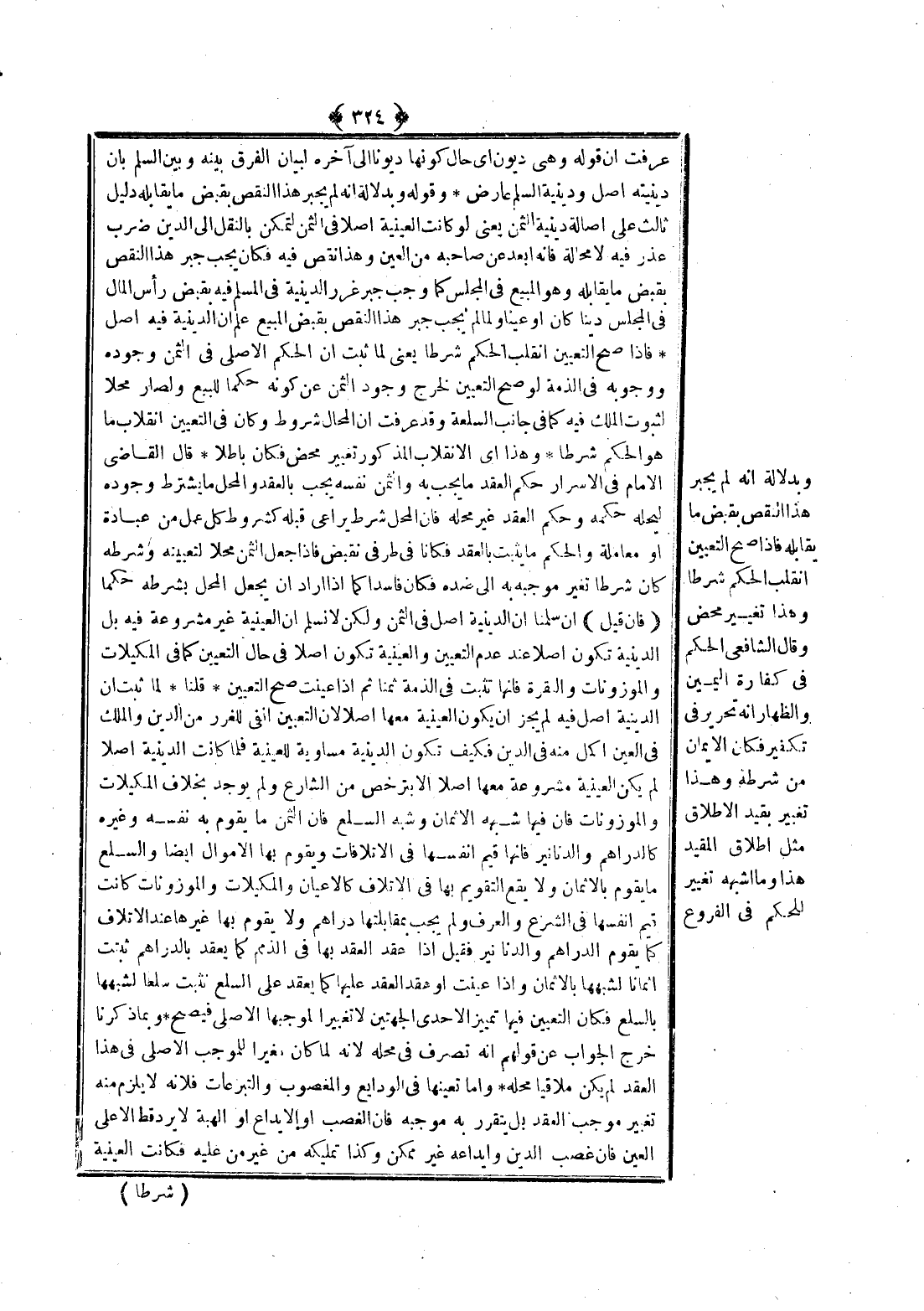قَالَ الْقَاضِي الْإِمَامُ فِي الْأَسْرَارِ: حُكْمُ الْعَقْدِ مَا يَجِبُ بِهِ، وَالثَّمَنُ نَفْسُهُ يَجِبُ بِالْعَقْدِ وَالْمَحَلِّ، وَمَا يُشْتَرَطُ وُجُودُهُ لِيَحِلَّهُ حُكْمُهُ وَحُكْمُ الْعَقْدِ غَيْرُ مَحَلِّهِ، فَإِنَّ الْمَحَلَّ شَرْطٌ يُرَاعَى قَبْلَهُ كَشُرُوطِ كُلِّ عَمَلٍ مِنْ عِبَادَةٍ أَوْ مُعَامَلَةٍ، وَالْحُكْمُ مَا يَثْبُتُ بِالْعَقْدِ فَكَانَا فِي طَرَفَيْ نَقِيضٍ، فَإِذَا جَعَلَ الثَّمَنَ مَحَلًّا لِتَعَيُّنِهِ وَشَرَطَهُ كَانَ شَرْطًا تَغَيَّرَ مُوجِبُهُ بِهِ إلَى ضِدِّهِ، فَكَانَ فَاسِدًا كَمَا إذَا أَرَادَ أَنْ يَجْعَلَ الْمَحَلَّ بِشَرْطِهِ حُكْمًا (فَإِنْ قِيلَ) : إنْ سَلَّمْنَا أَنَّ الدَّيْنِيَّةَ أَصْلٌ فِي الثَّمَنِ، وَلَكِنْ لَا نُسَلِّمُ أَنَّ الْعَيْنِيَّةَ غَيْرُ مَشْرُوعَةٍ فِيهِ بَلْ الدَّيْنِيَّةُ تَكُونُ أَصْلًا عِنْدَ عَدَمِ التَّعْيِينِ، وَالْعَيْنِيَّةُ تَكُونُ أَصْلًا فِي حَالِ التَّعْيِينِ كَمَا فِي الْمَكِيلَاتِ وَالْمَوْزُونَاتِ وَالْمَعْدُودَاتِ وَالْبَقَرَةِ فَإِنَّهَا تَثْبُتُ فِي الذِّمَّةِ ثَمَنًا ثُمَّ إذَا عُيِّنَتْ صَحَّ التَّعْيِينُ قُلْنَا لَمَّا ثَبَتَ أَنَّ الدَّيْنِيَّةَ أَصْلٌ فِيهِ لَمْ يَجُزْ أَنْ يَكُونَ الْعَيْنِيَّةُ مَعَهَا أَصْلًا؛ لِأَنَّ التَّعْيِينَ أَنْفَى لِلْغَرَرِ مِنْ الدَّيْنِ، وَالْمِلْكُ فِي الْعَيْنِ أَكْمَلُ مِنْهُ فِي الدَّيْنِ فَكَيْفَ تَكُونُ الدَّيْنِيَّةُ مُسَاوِيَةً لِلْعَيْنِيَّةِ فَلَمَّا كَانَتْ الدَّيْنِيَّةُ أَصْلًا لَمْ يَكُنْ الْعَيْنِيَّةُ مَشْرُوعَةً مَعَهَا أَصْلًا إلَّا بِتَرَخُّصٍ مِنْ الشَّارِعِ، وَلَمْ يُوجَدْ بِخِلَافِ الْمَكِيلَاتِ وَالْمَوْزُونَاتِ، فَإِنَّ فِيهَا شُبْهَةَ الْأَثْمَانِ وَشِبْهَ السِّلَعِ، فَإِنَّ الثَّمَنَ مَا يُقَوَّمُ بِهِ نَفْسُهُ وَغَيْرُهُ كَالدَّرَاهِمِ وَالدَّنَانِيرِ فَإِنَّهَا تُقَيَّمُ أَنْفُسُهَا فِي الْإِتْلَافَاتِ، وَيُقَوَّمُ بِهَا الْأَمْوَالُ أَيْضًا وَالسِّلَعُ مَا يُقَوَّمُ بِالْأَثْمَانِ وَلَا يَقَعُ التَّقْوِيمُ بِهَا فِي الْإِتْلَافِ كَالْأَعْيَانِ وَالْمَكِيلَاتِ وَالْمَوْزُونَاتِ كَانَتْ تُقَيَّمُ أَنْفُسُهَا فِي الشَّرْعِ وَالْعُرْفِ، وَلَمْ يَجِبْ بِمُقَابَلَتِهَا دَرَاهِمُ، وَلَا يُقَوَّمُ بِهَا غَيْرُهَا عِنْدَ الْإِتْلَافِ كَمَا يُقَوَّمُ الدَّرَاهِمُ وَالدَّنَانِيرُ، فَقِيلَ: إذَا عَقَدَ الْعَقْدَ بِهَا فِي الذِّمَمِ كَمَا يَعْقِدُ بِالدَّرَاهِمِ ثَبَتَتْ أَثْمَانًا لِشَبَهِهَا بِالْأَثْمَانِ، وَإِذَا عُيِّنَتْ أَوْ عُقِدَ الْعَقْدُ عَلَيْهَا كَمَا يُعْقَدُ عَلَى السِّلَعِ تَثْبُتُ سِلَعًا لِشَبَهِهَا بِالسِّلَعِ فَكَانَ التَّعْيِينُ فِيهَا تَمْيِيزًا لِإِحْدَى الْجِهَتَيْنِ لَا تَغْيِيرًا لِمُوجِبِهَا الْأَصْلِيِّ فَيَصِحُّ وَبِمَا ذَكَرْنَا خَرَجَ الْجَوَابُ عَنْ قَوْلِهِمْ: إنَّهُ تَصَرُّفٌ فِي مَحَلِّهِ؛ لِأَنَّهُ لَمَّا كَانَ مُغَيِّرًا لِلْمُوجِبِ الْأَصْلِيِّ فِي هَذَا الْعَقْدِ لَمْ يَكُنْ مُلَاقِيًا مَحَلَّهُ وَأَمَّا تَعَيُّنُهَا فِي الْوَدَائِعِ وَالْمَغْصُوبِ وَالتَّبَرُّعَاتِ فَلِأَنَّهُ لَا يَلْزَمُ مِنْهُ تَغْيِيرُ مُوجِبِ الْعَقْدِ بَلْ يَتَقَرَّرُ بِهِ مُوجِبُهُ فَإِنَّ الْغَصْبَ أَوْ الْإِيدَاعَ أَوْ الْهِبَةَ لَا يَرِدُ قَطُّ إلَّا عَلَى الْعَيْنِ فَإِنَّ غَصْبَ الدَّيْنِ وَإِيدَاعَهُ غَيْرُ مُمْكِنٍ، وَكَذَا تَمْلِيكُهُ مِنْ غَيْرِ مَنْ عَلَيْهِ فَكَانَتْ الْعَيْنِيَّةُ