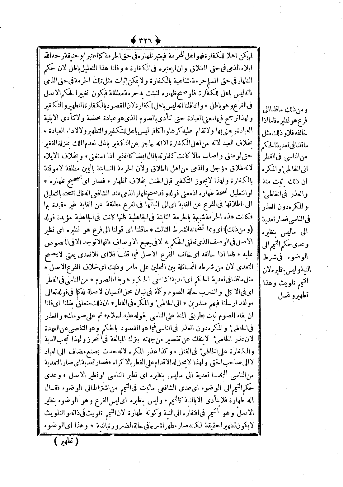{وَلَقَدْ أَرْسَلْنَا فِيهِمْ مُنْذِرِينَ} [الصافات: 72] وَإِلَى الْخَاطِئِ وَالْمُكْرَهِ فِي الْفِطْرِ أَنَّ ذَلِكَ مُتَعَلِّقٌ بِقُلْنَا أَيْ قُلْنَا: إنَّ بَقَاءَ الصَّوْمِ ثَبَتَ بِطَرِيقِ الْمِنَّةِ عَلَى النَّاسِي بِقَوْلِهِ - عَلَيْهِ السَّلَامُ - أَتِمَّ عَلَى صَوْمِك وَالْعُذْرُ فِي الْخَاطِئِ وَالْمُكْرَهِ دُونَ الْعُذْرِ فِي النَّاسِي فِيمَا هُوَ الْمَقْصُودُ بِالْحُكْمِ، وَهُوَ التَّفَصِّي عَنْ الْعُهْدَةِ؛ لِأَنَّ عُذْرَ الْخَاطِئِ لَا يَنْفَكُّ عَنْ تَقْصِيرٍ مِنْ جِهَتِهِ بِتَرْكِ الْمُبَالَغَةِ فِي التَّحَرُّزِ؛ وَلِهَذَا تَجِبُ الدِّيَةُ وَالْكَفَّارَةُ عَلَى الْخَاطِئِ فِي الْقَتْلِ وَكَذَا عُذْرُ الْمُكْرَهِ؛ لِأَنَّهُ حَدَثَ بِصُنْعٍ مُضَافٍ إلَى الْعِبَادِ لَا إلَى صَاحِبِ الْحَقِّ؛ وَلِهَذَا لَا يَحِلُّ لَهُ الْإِقْدَامُ عَلَى الْفِطْرِ بِالْإِكْرَاهِ فَصَارَ تَعْدِيَةً أَيْ صَارَ التَّعْدِيَةُ مِنْ النَّاسِي إلَيْهِمَا تَعْدِيَةً إلَى مَا لَيْسَ بِنَظِيرِهِ أَيْ نَظِيرِ النَّاسِي أَوْ نَظِيرِ الْأَصْلِ وَعَدَّى حُكْمَ التَّيَمُّمِ إلَى الْوُضُوءِ أَيْ عَدَّى الشَّافِعِيُّ مَا ثَبَتَ فِي التَّيَمُّمِ وَمِنْ اشْتِرَاطٍ إلَى الْوُضُوءِ فَقَالَ: إنَّهُ طَهَارَةٌ فَلَا يَتَأَدَّى إلَّا بِالنِّيَّةِ كَالتَّيَمُّمِ وَلَيْسَ بِنَظِيرِهِ أَيْ لَيْسَ الْفَرْعُ، وَهُوَ الضَّوْءُ بِنَظِيرِ الْأَصْلِ، وَهُوَ التَّيَمُّمُ فِي افْتِقَارِهِ إلَى النِّيَّةِ وَكَوْنُهُ طَهَارَةً؛ لِأَنَّ التَّيَمُّمَ تَلْوِيثٌ فِي ذَاتِهِ وَالتَّلْوِيثُ لَا يَكُونُ تَطْهِيرًا حَقِيقَةً لَكِنَّهُ صَارَ مُطَهِّرًا شَرْعًا فِي حَالَةِ الضَّرُورَةِ بِالنِّيَّةِ وَهَذَا أَيْ الْوُضُوءُ