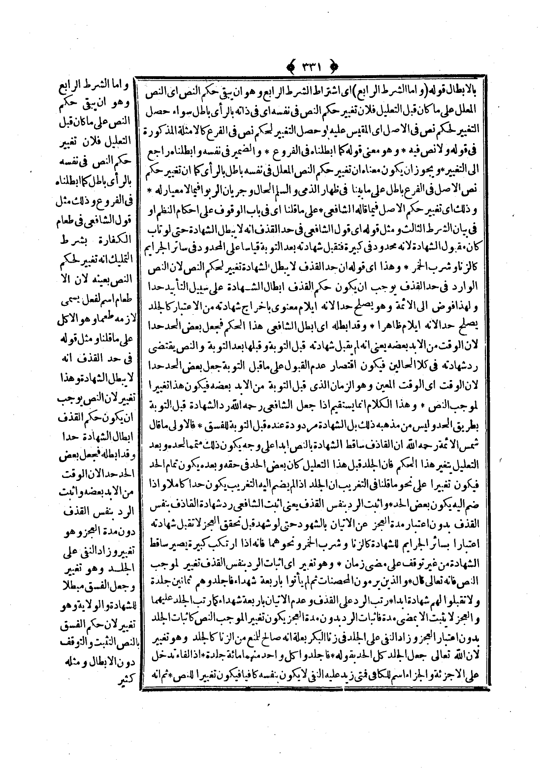 وَأَمَّا الشَّرْطُ الرَّابِعُ وَهُوَ أَنْ يَبْقَى حُكْمُ النَّصِّ عَلَى مَا كَانَ قَبْلَ التَّعْلِيلِ فَلِأَنَّ تَغْيِيرَ حُكْمِ النَّصِّ فِي نَفْسِهِ بِالرَّأْيِ بَاطِلٌ كَمَا أَبْطَلْنَاهُ فِي الْفُرُوعِ وَذَلِكَ مِثْلُ قَوْلِ الشَّافِعِيِّ فِي طَعَامِ الْكَفَّارَةِ بِشَرْطِ التَّمْلِيكِ: إنَّهُ تَغْيِيرٌ لِحُكْمِ النَّصِّ بِعَيْنِهِ؛ لِأَنَّ الْإِطْعَامَ اسْمٌ لِفِعْلٍ يُسَمَّى لَازِمُهُ طَعْمًا، وَهُوَ الْأَكْلُ عَلَى مَا قُلْنَا، وَمِثْلُ قَوْلِهِ فِي حَدِّ الْقَذْفِ: إنَّهُ لَا يُبْطِلُ الشَّهَادَةَ، وَهَذَا تَغْيِيرٌ؛ لِأَنَّ النَّصَّ يُوجِبُ أَنْ يَكُونَ حُكْمُ الْقَذْفِ إبْطَالَ الشَّهَادَةِ حَدًّا، وَقَدْ أَبْطَلَهُ فَجَعَلَ بَعْضَ الْحَدِّ حَدًّا؛ لِأَنَّ الْوَقْتَ مِنْ الْأَبَدِ بَعْضُهُ، وَأَثْبَتَ الرَّدَّ بِنَفْسِ الْقَذْفِ دُونَ مُدَّةِ الْعَجْزِ، وَهُوَ تَغْيِيرٌ وَزَادَ النَّفْيَ عَلَى الْجَلْدِ، وَهُوَ تَغْيِيرٌ وَجَعَلَ الْفِسْقَ مُبْطِلًا لِلشَّهَادَةِ وَالْوِلَايَةِ، وَهُوَ تَغْيِيرٌ؛ لِأَنَّ حُكْمَ الْفِسْقِ بِالنَّصِّ التَّثَبُّتُ وَالتَّوَقُّفُ دُونَ الْإِبْطَالِ، وَمِثْلُهُ كَثِيرٌ