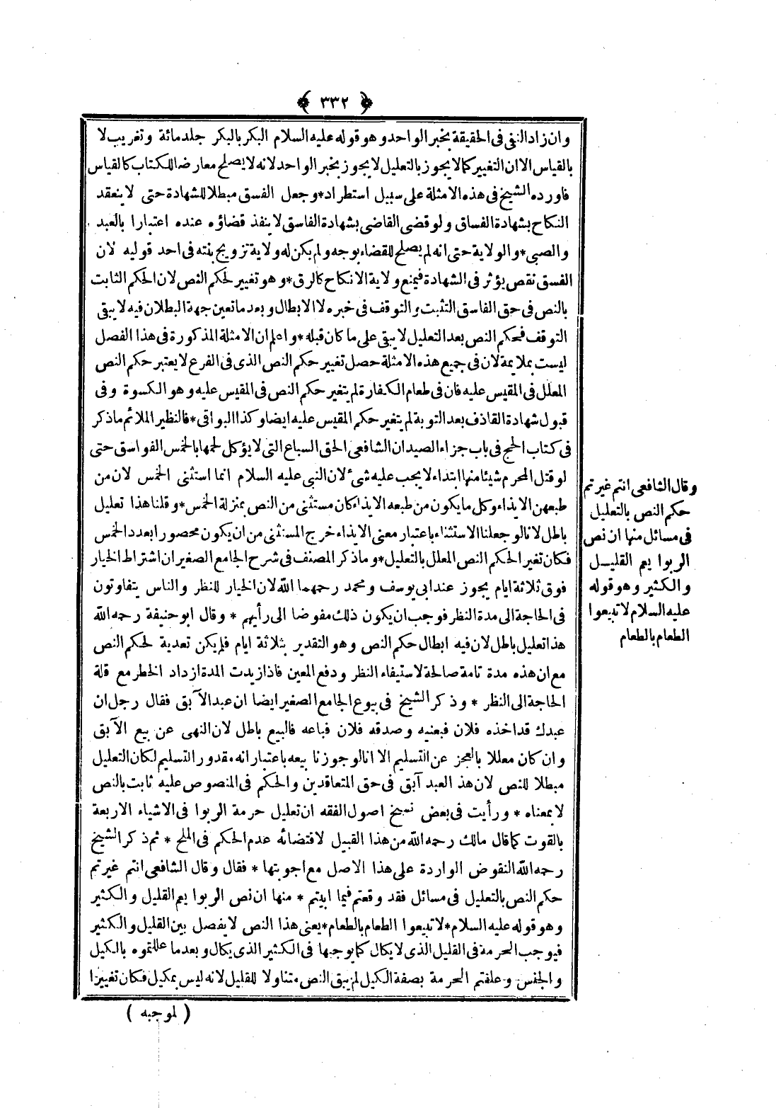 ثُمَّ ذَكَرَ الشَّيْخُ - رَحِمَهُ اللَّهُ - النُّقُوضَ الْوَارِدَةَ عَلَى هَذَا الْأَصْلِ مَعَ أَجْوِبَتِهَا فَقَالَ، وَقَالَ الشَّافِعِيُّ أَنْتُمْ غَيَّرْتُمْ حُكْمَ النَّصِّ بِالتَّعْلِيلِ فِي مَسَائِلَ فَقَدْ وَقَعْتُمْ فِيمَا أَبَيْتُمْ مِنْهَا أَنَّ نَصَّ الرِّبَا يَعُمُّ الْقَلِيلَ وَالْكَثِيرَ، وَهُوَ قَوْلُهُ - عَلَيْهِ السَّلَامُ - «لَا تَبِيعُوا الطَّعَامَ بِالطَّعَامِ» يَعْنِي هَذَا النَّصُّ لَا يَفْصِلُ بَيْنَ الْقَلِيلِ وَالْكَثِيرِ فَيُوجِبُ الْحُرْمَةَ فِي الْقَلِيلِ الَّذِي لَا يُكَالُ كَمَا يُوجِبُهَا فِي الْكَثِيرِ الَّذِي يُكَالُ وَبَعْدَمَا عَلَّلْتُمُوهُ بِالْكَيْلِ وَالْجِنْسِ وَعَلَّقْتُمْ الْحُرْمَةَ بِصِفَةِ الْكَيْلِ لَمْ يَبْقَ النَّصُّ مُتَنَاوِلًا لِلْقَلِيلِ؛ لِأَنَّهُ لَيْسَ بِمَكِيلٍ فَكَانَ تَغْيِيرًا
