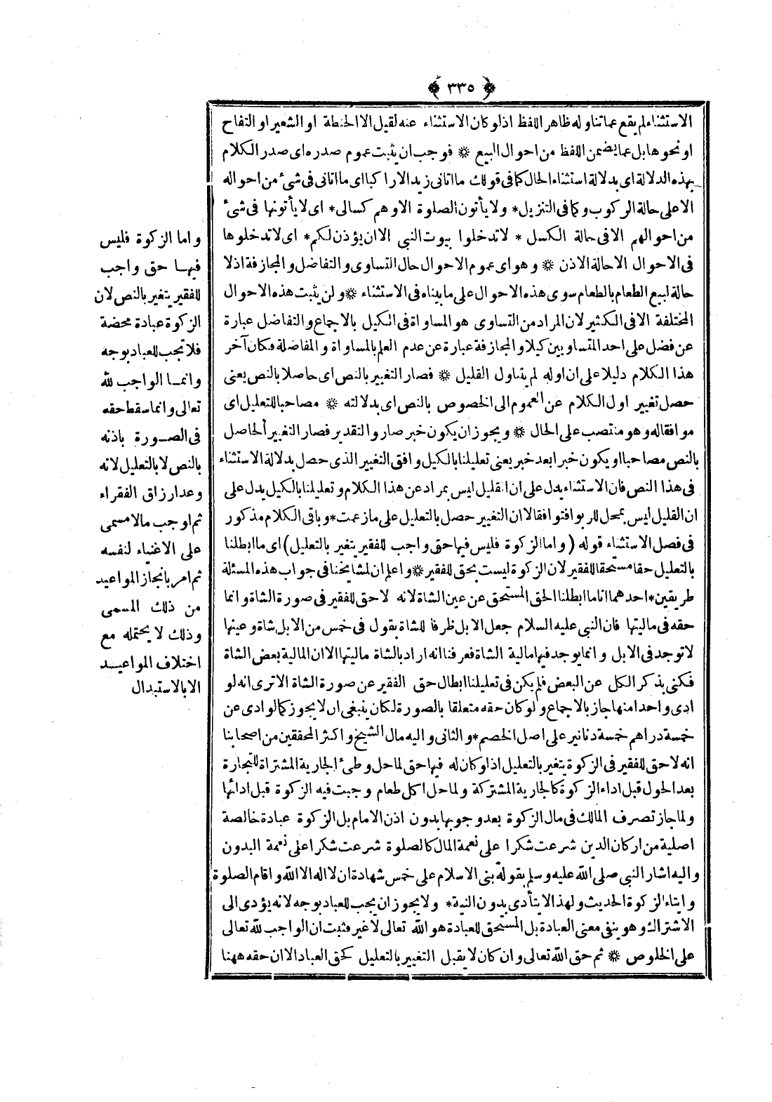 قَوْلُهُ: (وَأَمَّا الزَّكَاةُ فَلَيْسَ فِيهَا حَقٌّ وَاجِبٌ لِلْفَقِيرِ يَتَغَيَّرُ بِالتَّعْلِيلِ) أَيْ مَا أَبْطَلْنَا بِالتَّعْلِيلِ حَقًّا مُسْتَحَقًّا لِلْفَقِيرِ؛ لِأَنَّ الزَّكَاةَ لَيْسَتْ بِحَقٍّ لِلْفَقِيرِ وَاعْلَمْ أَنَّ لِمَشَايِخِنَا فِي جَوَابِ هَذِهِ الْمَسْأَلَةِ طَرِيقَيْنِ أَحَدَهُمَا أَنَّا مَا أَبْطَلْنَا الْحَقَّ الْمُسْتَحَقَّ عَنْ عَيْنِ الشَّاةِ؛ لِأَنَّهُ لَا حَقَّ لِلْفَقِيرِ فِي صُورَةِ الشَّاةِ، وَإِنَّمَا حَقُّهُ فِي مَالِيَّتِهَا، فَإِنَّ النَّبِيَّ - عَلَيْهِ السَّلَامُ - جَعَلَ الْإِبِلَ ظَرْفًا لِلشَّاةِ بِقَوْلِهِ «فِي خَمْسٍ مِنْ الْإِبِلِ شَاةٌ» وَعَيْنُهَا لَا تُوجَدُ فِي الْإِبِلِ وَإِنَّمَا يُوجَدُ فِيهَا مَالِيَّةُ الشَّاةِ فَعَرَفْنَا أَنَّهُ أَرَادَ بِالشَّاةِ مَالِيَّتَهَا إلَّا أَنَّ الْمَالِيَّةَ بَعْضُ الشَّاةِ فَكُنِّيَ بِذِكْرِ الْكُلِّ عَنْ الْبَعْضِ فَلَمْ يَكُنْ فِي تَعْلِيلِنَا إبْطَالُ حَقِّ الْفَقِيرِ عَنْ صُورَةِ الشَّاةِ أَلَا تَرَى أَنَّهُ لَوْ أَدَّى وَاحِدًا مِنْهَا جَازَ بِالْإِجْمَاعِ.