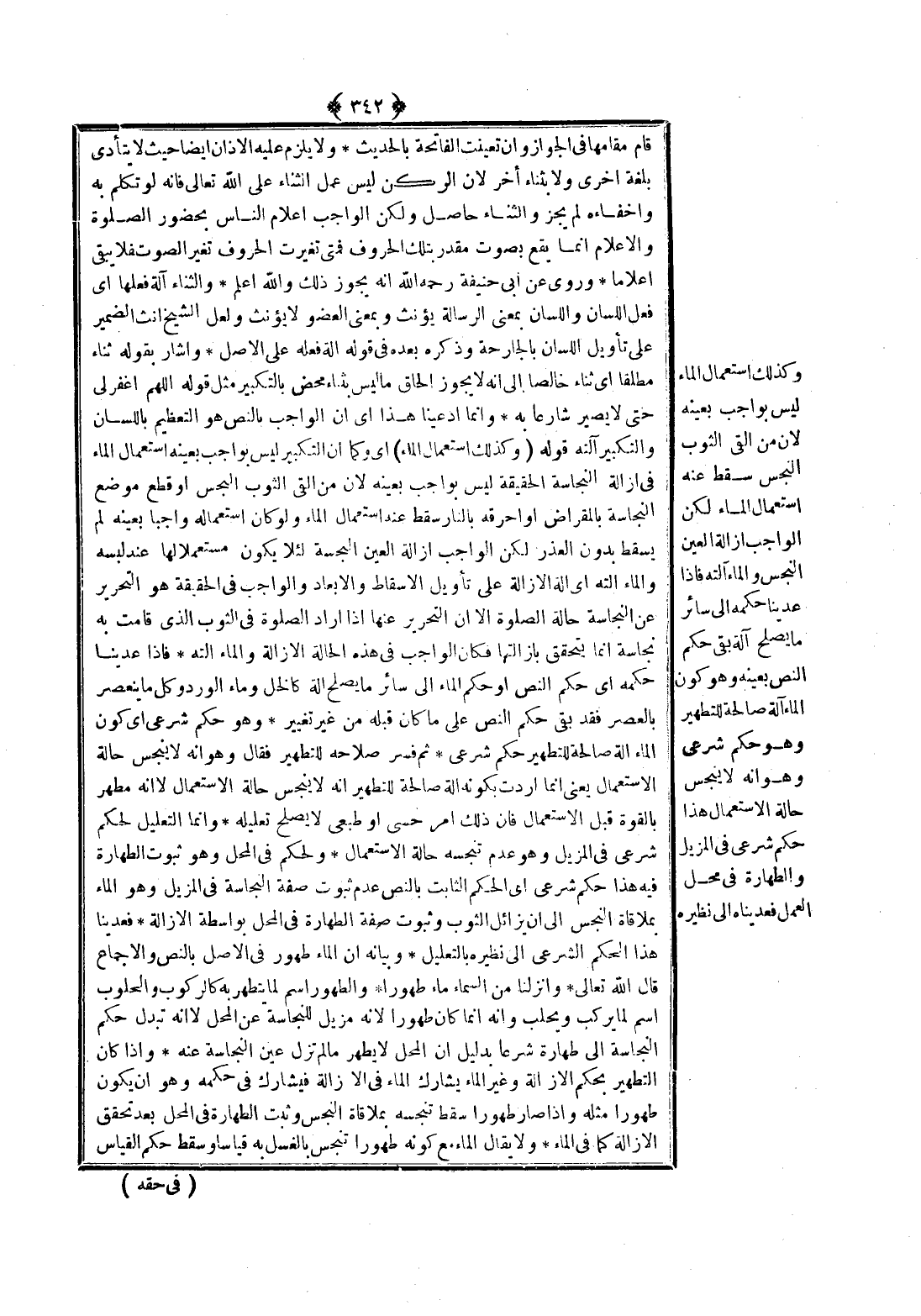 وَالْوَاجِبُ فِي الْحَقِيقَةِ هُوَ التَّحْرِيرُ عَنْ النَّجَاسَةِ حَالَةَ الصَّلَاةِ إلَّا أَنَّ التَّحْرِيرَ عَنْهَا إذَا أَرَادَ الصَّلَاةَ فِي الثَّوْبِ الَّذِي قَامَتْ بِهِ نَجَاسَةٌ إنَّمَا يَتَحَقَّقُ بِإِزَالَتِهَا فَكَانَ الْوَاجِبُ فِي هَذِهِ الْحَالَةِ الْإِزَالَةَ، وَالْمَاءُ آلَتُهُ فَإِذَا عَدَّيْنَا حُكْمَهُ أَيْ حُكْمَ النَّصِّ أَوْ حُكْمَ الْمَاءِ إلَى سَائِرِ مَا يَصْلُحُ آلَةً كَالْخَلِّ وَمَاءِ الْوَرْدِ، وَكُلِّ مَا يَنْعَصِرُ بِالْعَصْرِ فَقَدْ بَقِيَ حُكْمُ النَّصِّ عَلَى مَا كَانَ قَبْلَهُ مِنْ غَيْرِ تَغْيِيرٍ وَهُوَ حُكْمٌ شَرْعِيٌّ أَيْ كَوْنُ الْمَاءِ آلَةً صَالِحَةً لِلتَّطْهِيرِ حُكْمٌ شَرْعِيٌّ ثُمَّ فَسَّرَ صَلَاحَهُ لِلتَّطْهِيرِ، فَقَالَ: وَهُوَ أَنَّهُ لَا يُنَجَّسُ حَالَةَ الِاسْتِعْمَالِ يَعْنِي إنَّمَا أَرَدْت بِكَوْنِهِ آلَةً صَالِحَةً لِلتَّطْهِيرِ أَنَّهُ لَا يُنَجَّسُ حَالَةَ الِاسْتِعْمَالِ لَا أَنَّهُ مُطَهَّرٌ بِالْقُوَّةِ قَبْلَ الِاسْتِعْمَالِ فَإِنَّ ذَلِكَ أَمْرٌ حِسِّيٌّ أَوْ طَبْعِيٌّ لَا يَصْلُحُ تَعْلِيلُهُ وَإِنَّمَا التَّعْلِيلُ لِحُكْمٍ شَرْعِيٍّ فِي الْمُزِيلِ وَهُوَ عَدَمُ تَنَجُّسِهِ حَالَةَ الِاسْتِعْمَالِ وَالْحُكْمُ فِي الْمَحَلِّ، وَهُوَ ثُبُوتُ الطَّهَارَةِ فِيهِ هَذَا حُكْمٌ شَرْعِيٌّ أَيْ الْحُكْمُ الثَّابِتُ بِالنَّصِّ عَدَمُ ثُبُوتِ صِفَةِ النَّجَاسَةِ فِي الْمُزِيلِ وَهُوَ الْمَاءُ بِمُلَاقَاةِ النَّجَسِ إلَى أَنْ يُزَالَ الثَّوْبُ، وَثُبُوتُ صِفَةِ الطَّهَارَةِ فِي الْمَحَلِّ بِوَاسِطَةِ الْإِزَالَةِ فَعَدَّيْنَا هَذَا الْحُكْمَ الشَّرْعِيَّ إلَى نَظِيرِهِ بِالتَّعْلِيلِ.