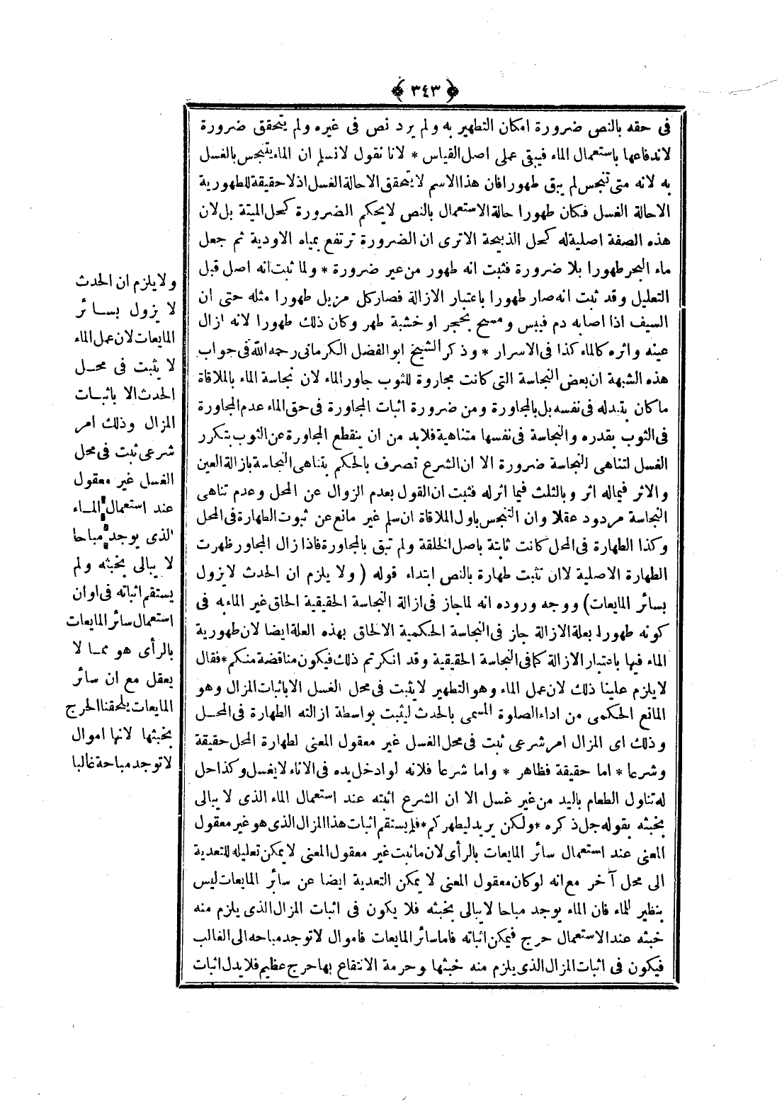 ـــــــــــــــــــــــــــــQفِي حَقِّهِ بِالنَّصِّ ضَرُورَةَ إمْكَانِ التَّطْهِيرِ بِهِ، وَلَمْ يَرِدْ نَصٌّ فِي غَيْرِهِ وَلَمْ يَتَحَقَّقْ ضَرُورَةً لِانْدِفَاعِهَا بِاسْتِعْمَالِ الْمَاءِ فَيَبْقَى عَلَى أَصْلِ الْقِيَاسِ لِأَنَّا نَقُولُ: لَا نُسَلِّمُ أَنَّ الْمَاءَ تَنَجَّسَ بِالْغُسْلِ بِهِ؛ لِأَنَّهُ مَتَى تَنَجَّسَ لَمْ يَبْقَ طَهُورًا، فَإِنَّ هَذَا الِاسْمَ لَا يَتَحَقَّقُ إلَّا حَالَةَ الْغُسْلِ؛ إذْ لَا حَقِيقَةَ لِلطَّهُورِيَّةِ إلَّا حَالَةَ الْغُسْلِ فَكَانَ طَهُورًا حَالَةَ الِاسْتِعْمَالِ بِالنَّصِّ لَا بِحُكْمِ الضَّرُورَةِ كَحِلِّ الْمَيْتَةِ بَلْ؛ لِأَنَّ هَذِهِ الصِّفَةَ أَصْلِيَّةٌ لَهُ كَحِلِّ الذَّبِيحَةِ، أَلَا تَرَى أَنَّ الضَّرُورَةَ تَرْتَفِعُ بِمِيَاهِ الْأَوْدِيَةِ ثُمَّ جَعَلَ مَاءَ الْبَحْرِ طَهُورًا بِلَا ضَرُورَةٍ فَثَبَتَ أَنَّهُ طَهُورٌ مِنْ غَيْرِ ضَرُورَةٍ وَلَمَّا ثَبَتَ أَنَّهُ أَصْلٌ قَبْلَ التَّعْلِيلِ، وَقَدْ ثَبَتَ أَنَّهُ صَارَ طَهُورًا بِاعْتِبَارِ الْإِزَالَةِ فَصَارَ كُلُّ مُزِيلٍ طَهُورًا مِثْلَهُ حَتَّى إنَّ السَّيْفَ إذَا أَصَابَهُ دَمٌ فَيَبِسَ، وَمُسِحَ بِحَجَرٍ أَوْ خَشَبَةٍ طَهُورٌ، وَكَانَ ذَلِكَ طَهُورًا؛ لِأَنَّهُ أَزَالَ عَيْنَهُ وَأَثَرَهُ كَالْمَاءِ كَذَا فِي الْأَسْرَارِ وَذَكَرَ الشَّيْخُ أَبُو الْفَضْلِ الْكَرْمَانِيُّ - رَحِمَهُ اللَّهُ - فِي جَوَابِ هَذِهِ الشُّبْهَةِ أَنَّ بَعْضَ النَّجَاسَةِ الَّتِي كَانَتْ مُجَاوِرَةً لِلثَّوْبِ جَاوَرَ الْمَاءَ؛ لِأَنَّ نَجَاسَةَ الْمَاءِ بِالْمُلَاقَاةِ مَا كَانَ بِتَبَدُّلِهِ فِي نَفْسِهِ بَلْ بِالْمُجَاوَرَةِ، وَمِنْ ضَرُورَةِ إثْبَاتِ الْمُجَاوَرَةِ فِي حَقِّ الْمَاءِ عَدَمُ الْمُجَاوَرَةِ فِي الثَّوْبِ بِقَدْرِهِ، وَالنَّجَاسَةُ فِي نَفْسِهَا مُتَنَاهِيَةٌ فَلَا بُدَّ مِنْ أَنْ يَنْقَطِعَ الْمُجَاوَرَةُ عَنْ الثَّوْبِ بِتَكَرُّرِ الْغُسْلِ لِتَنَاهِي النَّجَاسَةِ ضَرُورَةً إلَّا أَنَّ الشَّرْعَ تَصَرَّفَ بِالْحُكْمِ بِتَنَاهِي النَّجَاسَةِ بِإِزَالَةِ الْعَيْنِ وَالْأَثَرِ فِيمَا لَهُ أَثَرٌ وَبِالثُّلُثِ فِيمَا أَثَرَ لَهُ فَثَبَتَ أَنَّ الْقَوْلَ بِعَدَمِ الزَّوَالِ عَنْ الْمَحَلِّ وَعَدَمِ تَنَاهِي النَّجَاسَةِ مَرْدُودٌ عَقْلًا، وَأَنَّ التَّنَجُّسَ بِأَوَّلِ الْمُلَاقَاةِ إنْ سُلِّمَ غَيْرُ مَانِعٍ عَنْ ثُبُوتِ الطَّهَارَةِ فِي الْمَحَلِّ.