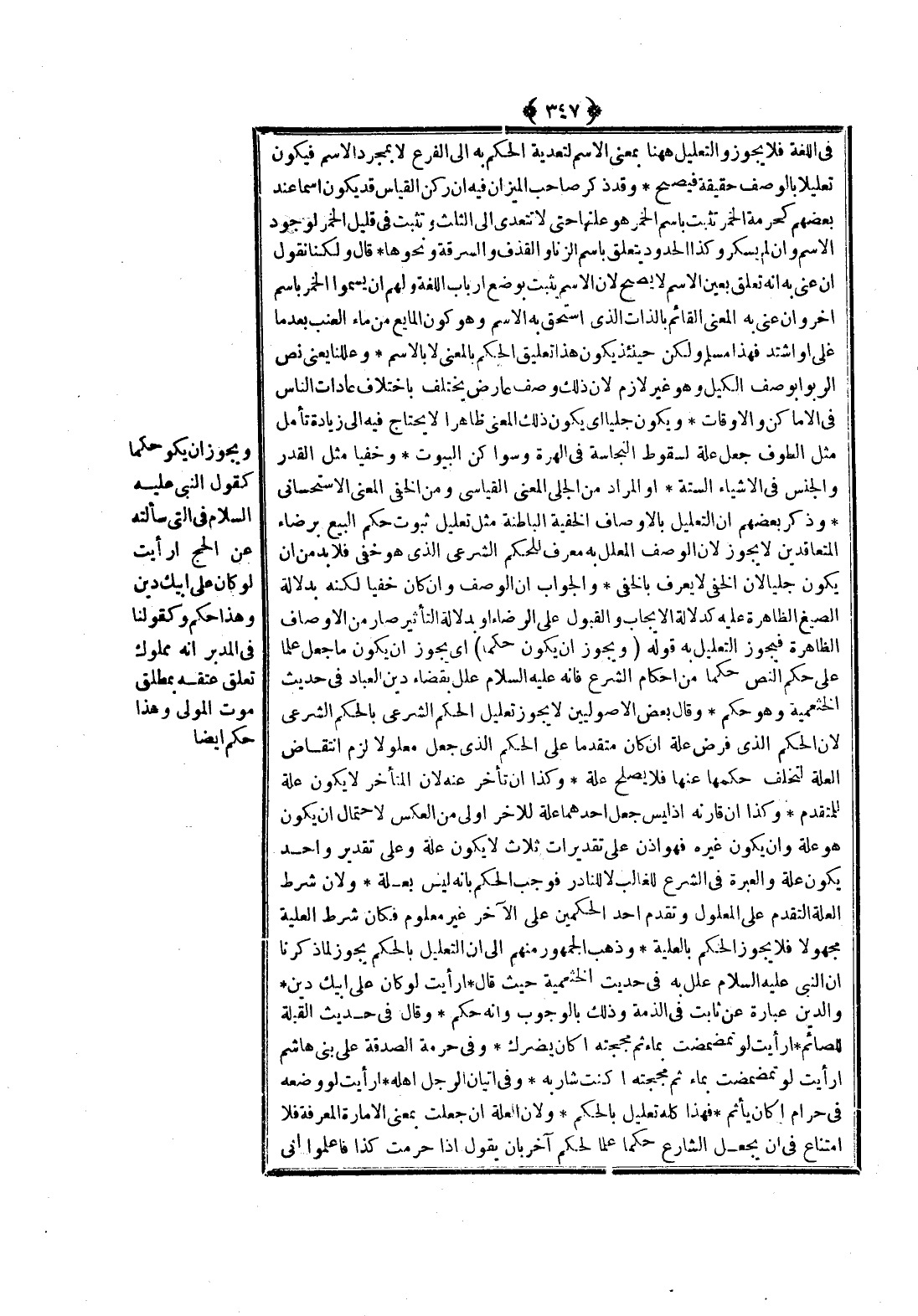 وَالْجَوَابُ أَنَّ الْوَصْفَ وَإِنْ كَانَ خَفِيًّا لَكِنَّهُ بِدَلَالَةِ الصِّيَغِ الظَّاهِرَةِ عَلَيْهِ كَدَلَالَةِ الْإِيجَابِ وَالْقَبُولِ عَلَى الرِّضَا، أَوْ بِدَلَالَةِ التَّأْثِيرِ صَارَ مِنْ الْأَوْصَافِ الظَّاهِرَةِ فَيَجُوزُ التَّعْلِيلُ بِهِ قَوْلُهُ (وَيَجُوزُ أَنْ يَكُونَ حُكْمًا) أَيْ يَجُوزُ أَنْ يَكُونَ مَا جُعِلَ عَلَمًا عَلَى حُكْمِ النَّصِّ حُكْمًا مِنْ أَحْكَامِ الشَّرْعِ فَإِنَّهُ - صَلَّى اللَّهُ عَلَيْهِ وَسَلَّمَ - عَلَّلَ بِقَضَاءِ دَيْنِ الْعِبَادِ فِي حَدِيثِ الْخَثْعَمِيَّةِ، وَهُوَ حُكْمٌ.
