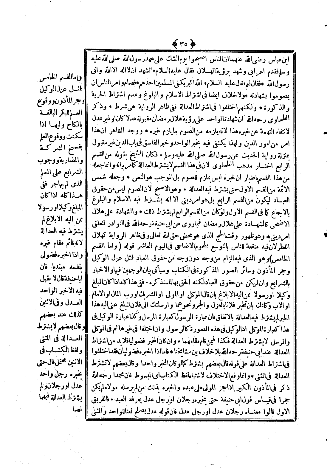ـــــــــــــــــــــــــــــQابْنِ عَبَّاسٍ - رَضِيَ اللَّهُ عَنْهُمَا - «أَنَّ النَّاسَ أَصْبَحُوا يَوْمَ الشَّكِّ عَلَى عَهْدِ رَسُولِ اللَّهِ - صَلَّى اللَّهُ عَلَيْهِ وَسَلَّمَ - فَقَدِمَ أَعْرَابِيٌّ وَشَهِدَ بِرُؤْيَةِ الْهِلَالِ فَقَالَ - عَلَيْهِ السَّلَامُ - أَتَشْهَدُ أَنْ لَا إلَهَ إلَّا اللَّهُ وَأَنِّي رَسُولُ اللَّهِ فَقَالَ نَعَمْ فَقَالَ - عَلَيْهِ السَّلَامُ - اللَّهُ أَكْبَرُ يَكْفِي الْمُسْلِمِينَ أَحَدُهُمْ فَصَامَ وَأَمَرَ النَّاسَ أَنْ يَصُومُوا بِشَهَادَتِهِ» وَلَا خِلَافَ أَيْضًا فِي اشْتِرَاطِ الْإِسْلَامِ وَالْبُلُوغِ وَعَدَمِ اشْتِرَاطِ الْحُرِّيَّةِ وَالذُّكُورَةِ وَلَكِنَّهُمْ اخْتَلَفُوا فِي اشْتِرَاطِ الْعَدَالَةِ فَفِي ظَاهِرِ الرِّوَايَةِ هِيَ شَرْطٌ وَذَكَرَ الطَّحَاوِيُّ - رَحِمَهُ اللَّهُ - أَنَّ شَهَادَةَ الْوَاحِدِ عَلَى رُؤْيَةِ هِلَالِ رَمَضَانَ مَقْبُولَةٌ عَدْلًا كَانَ أَوْ غَيْرَ عَدْلٍ لِانْتِفَاءِ التُّهْمَةِ مِنْ خَبَرِهِ هَذَا لِأَنَّهُ يَلْزَمُهُ مِنْ الصَّوْمِ مَا يَلْزَمُ غَيْرَهُ وَوَجْهُ الظَّاهِرِ أَنَّ هَذَا أَمْرٌ مِنْ أُمُورِ الدِّينِ، وَلِهَذَا يُكْتَفَى فِيهِ بِخَبَرِ الْوَاحِدِ وَخَبَرِ الْفَاسِقِ فِي بَابِ الدِّينِ غَيْرُ مَقْبُولٍ بِمَنْزِلَةِ رِوَايَةِ الْحَدِيثِ عَنْ رَسُولِ اللَّهِ - صَلَّى اللَّهُ عَلَيْهِ وَسَلَّمَ -.