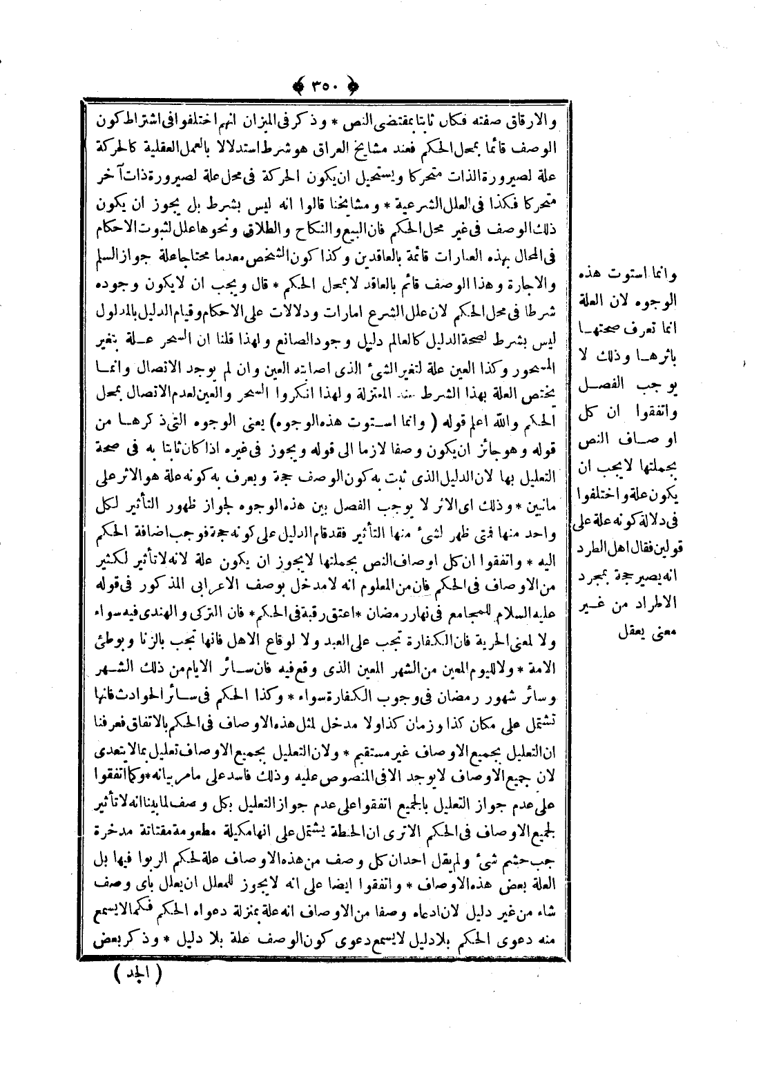 وَاتَّفَقُوا أَنَّ كُلَّ أَوْصَافِ النَّصِّ بِجُمْلَتِهَا لَا يَجُوزُ أَنْ يَكُونَ عِلَّةً؛ لِأَنَّهُ لَا تَأْثِيرَ لِكَثِيرٍ مِنْ الْأَوْصَافِ فِي الْحُكْمِ فَإِنَّ مِنْ الْمَعْلُومِ أَنَّهُ لَا مَدْخَلَ بِوَصْفِ الْأَعْرَابِيِّ الْمَذْكُورِ فِي «قَوْلِهِ - صَلَّى اللَّهُ عَلَيْهِ وَسَلَّمَ - لِلْمُجَامِعِ فِي نَهَارِ رَمَضَانَ أَعْتِقْ رَقَبَةً» فِي الْحُكْمِ فَإِنَّ التُّرْكِيَّ وَالْهِنْدِيَّ فِيهِ سَوَاءٌ وَلَا لِمَعْنَى الْحُرِّيَّةِ فَإِنَّ الْكَفَّارَةَ تَجِبُ عَلَى الْعَبْدِ وَلَا لِوِقَاعِ الْأَهْلِ فَإِنَّهَا تَجِبُ بِالزِّنَا وَبِوَطْءِ الْأَمَةِ وَلَا لِلْيَوْمِ الْمُعَيَّنِ مِنْ الشَّهْرِ الْمُعَيَّنِ الَّذِي وَقَعَ فِيهِ فَإِنَّ سَائِرَ الْأَيَّامِ مِنْ ذَلِكَ الشَّهْرِ وَسَائِرِ شُهُورِ رَمَضَانَ فِي وُجُوبِ الْكَفَّارَةِ سَوَاءٌ وَكَذَا الْحُكْمُ فِي سَائِرِ الْحَوَادِثِ فَإِنَّهَا تَشْتَمِلُ عَلَى مَكَانِ كَذَا وَزَمَانِ كَذَا وَلَا دَخْلَ لِمِثْلِ هَذِهِ الْأَوْصَافِ فِي الْحُكْمِ بِالِاتِّفَاقِ فَعَرَفْنَا أَنَّ التَّعْلِيلَ بِجَمِيعِ الْأَوْصَافِ غَيْرُ مُسْتَقِيمٍ؛ وَلِأَنَّ التَّعْلِيلَ بِجَمِيعِ الْأَوْصَافِ تَعْلِيلٌ بِمَا لَا يَتَعَدَّى؛ لِأَنَّ جَمِيعَ الْأَوْصَافِ لَا يُوجَدُ إلَّا فِي الْمَنْصُوصِ عَلَيْهِ وَذَلِكَ فَاسِدٌ عَلَى مَا مَرَّ بَيَانُهُ وَكَمَا اتَّفَقُوا عَلَى عَدَمِ جَوَازِ التَّعْلِيلِ بِالْجَمْعِ اتَّفَقُوا عَلَى عَدَمِ جَوَازِ التَّعْلِيلِ بِكُلِّ وَصْفٍ لِمَا بَيَّنَّا أَنَّهُ لَا تَأْثِيرَ لِجَمِيعِ الْأَوْصَافِ فِي الْحُكْمِ، أَلَا تَرَى أَنَّ الْحِنْطَةَ يَشْتَمِلُ عَلَى أَنَّهَا مَكِيلَةٌ مَطْعُومَةٌ مُقْتَاتَةٌ مُدَّخَرَةٌ جب جثم شَيْءٌ وَلَمْ يَقُلْ أَحَدٌ إنَّ كُلَّ وَصْفٍ مِنْ هَذِهِ الْأَوْصَافِ عِلَّةٌ لِحُكْمِ الرِّبَا فِيهَا بَلْ الْعِلَّةُ بَعْضُ هَذِهِ الْأَوْصَافِ وَاتَّفَقُوا أَيْضًا عَلَى أَنَّهُ لَا يَجُوزُ لِلْمُعَلِّلِ أَنْ يُعَلِّلَ بِأَيِّ وَصْفٍ شَاءَ مِنْ غَيْرِ دَلِيلٍ؛ لِأَنَّ ادَّعَاهُ وَصْفًا مِنْ الْأَوْصَافِ أَنَّهُ عِلَّةٌ بِمَنْزِلَةِ دَعْوَاهُ الْحُكْمَ فَكَمَا لَا يُسْمَعُ مِنْهُ دَعْوَى الْحُكْمِ بِلَا دَلِيلٍ لَا يُسْمَعُ دَعْوَى كَوْنِ الْوَصْفِ عِلَّةً بِلَا دَلِيلٍ.