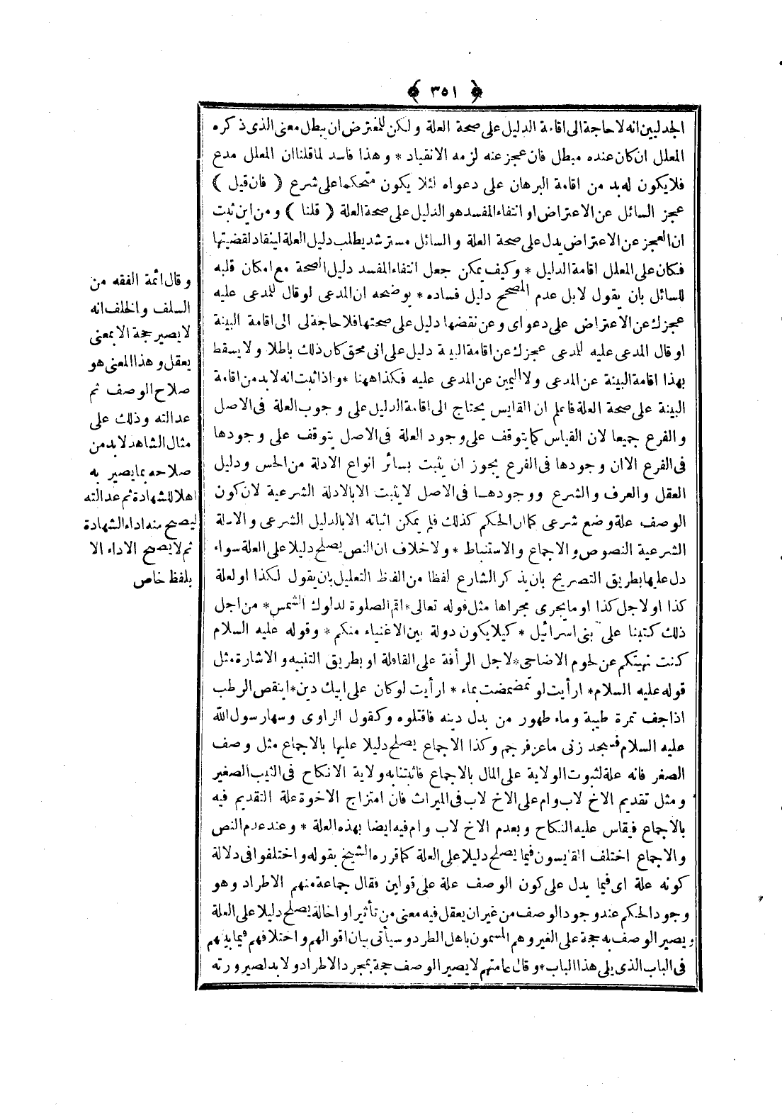 ـــــــــــــــــــــــــــــQالْجَدَلِيِّينَ أَنَّهُ لَا حَاجَةَ إلَى إقَامَةِ الدَّلِيلِ عَلَى صِحَّةِ الْعِلَّةِ وَلَكِنْ لِلْمُعْتَرِضِ أَنْ يُبْطِلَ مَعْنَى الَّذِي ذَكَرَهُ الْمُعَلِّلُ إنْ كَانَ عِنْدَهُ مُبْطَلٌ فَإِنْ عَجَزَ عَنْهُ لَزِمَهُ الِانْقِيَادُ وَهَذَا فَاسِدٌ لِمَا قُلْنَا إنَّ الْمُعَلِّلَ مُدَّعٍ فَلَا يَكُونُ لَهُ بُدَّ مِنْ إقَامَةِ الْبُرْهَانِ عَلَى دَعْوَاهُ لِئَلَّا يَكُونَ مُتَحَكِّمًا عَلَى شَرْعٍ (فَإِنْ قِيلَ) عَجْزُ السَّائِلِ عَنْ الِاعْتِرَاضِ، أَوْ انْتِفَاءُ الْمُفْسِدِ هُوَ الدَّلِيلُ عَلَى صِحَّةِ الْعِلَّةِ (قُلْنَا) وَمِنْ أَيْنَ ثَبَتَ أَنَّ الْعَجْزَ عَنْ الِاعْتِرَاضِ يَدُلُّ عَلَى صِحَّةِ الْعِلَّةِ وَالسَّائِلُ مُسْتَرْشِدٌ يَطْلُبُ دَلِيلَ الْعِلَّةِ لِيَنْقَادَ لِقَضِيَّتِهَا فَكَانَ عَلَى الْمُعَلِّلِ إقَامَةُ الدَّلِيلِ وَكَيْفَ يُمْكِنُ جَعْلُ انْتِفَاءِ الْمُفْسِدِ دَلِيلُ الصِّحَّةِ مَعَ إمْكَانِ قَلْبِهِ لِلسَّائِلِ بِأَنْ يَقُولَ لَا بَلْ عَدَمُ الْمُصَحِّحِ دَلِيلُ فَسَادِهِ.