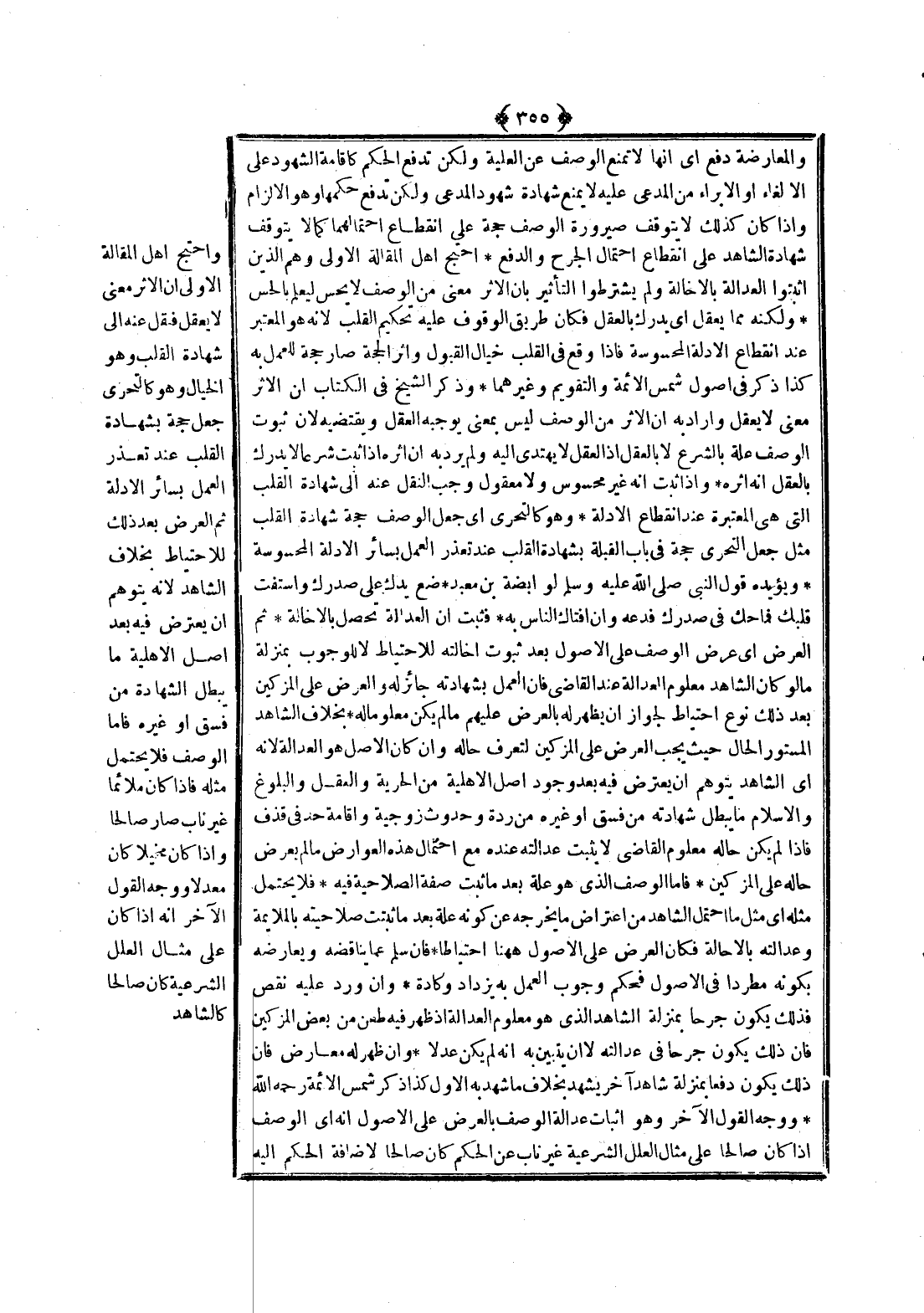 ـــــــــــــــــــــــــــــQوَالْمُعَارَضَةُ دَفْعٌ أَيْ أَنَّهَا لَا تَمْنَعُ الْوَصْفَ عَنْ الْعِلِّيَّةِ وَلَكِنْ تَدْفَعُ الْحُكْمَ كَإِقَامَةِ الشُّهُودِ عَلَى الْإِلْغَاءِ، أَوْ الْإِبْرَاءِ مِنْ الْمُدَّعَى عَلَيْهِ لَا يَمْنَعُ شَهَادَةَ شُهُودِ الْمُدَّعِي وَلَكِنْ تَدْفَعُ حُكْمَهَا، وَهُوَ الْإِلْزَامُ، وَإِذَا كَانَ كَذَلِكَ لَا يَتَوَقَّفُ صَيْرُورَةُ الْوَصْفِ حُجَّةً عَلَى انْقِطَاعِ احْتِمَالِهِمَا كَمَا لَا يَتَوَقَّفُ شَهَادَةُ الشَّاهِدِ عَلَى انْقِطَاعِ احْتِمَالِ الْجَرْحِ وَالدَّفْعِ احْتَجَّ أَهْلُ الْمَقَالَةِ الْأُولَى وَهُمْ الَّذِينَ أَثْبَتُوا الْعَدَالَةَ بِالْإِخَالَةِ وَلَمْ يَشْتَرِطُوا التَّأْثِيرَ بِأَنَّ الْأَثَرَ مَعْنًى مِنْ الْوَصْفِ لَا يُحَسُّ لِيُعْلَمَ بِالْحِسِّ وَلَكِنَّهُ مِمَّا يُعْقَلُ أَيْ يُدْرَكُ بِالْعَقْلِ فَكَانَ طَرِيقُ الْوُقُوفِ عَلَيْهِ تَحْكِيمُ الْقَلْبِ؛ لِأَنَّهُ هُوَ الْمُعْتَبَرُ عِنْدَ انْقِطَاعِ الْأَدِلَّةِ الْمَحْسُوسَةِ فَإِذَا وَقَعَ فِي الْقَلْبِ خَيَالُ الْقَبُولِ وَأَثَرُ الْحُجَّةِ صَارَ حُجَّةً لِلْعَمَلِ بِهِ كَذَا ذُكِرَ فِي أُصُولِ شَمْسِ الْأَئِمَّةِ وَالتَّقْوِيمِ وَغَيْرِهِمَا.