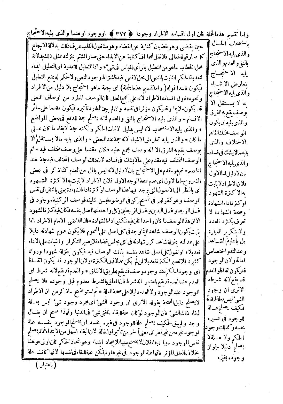 وَأَمَّا تَقْسِيمُ هَذِهِ الْجُمْلَةِ فَإِنَّ أَوَّلَ أَقْسَامِهِ الِاطِّرَادُ وُجُودًا أَوْ وُجُودًا وَعَدَمًا وَاَلَّذِي يَلِيهِ الِاحْتِجَاجُ بِاسْتِصْحَابِ الْحَالِ وَاَلَّذِي يَلِيهِ الِاحْتِجَاجُ بِالنَّفْيِ وَالْعَدَمِ وَاَلَّذِي يَلِيهِ الِاحْتِجَاجُ بِتَعَارُضِ الْأَشْبَاهِ وَاَلَّذِي يَلِيهِ الِاحْتِجَاجُ بِمَا لَا يَسْتَقِلُّ إلَّا بِوَصْفٍ يَقَعُ بِهِ الْفَرْقُ وَاَلَّذِي يَلِيهِ أَنْ يَكُونَ الْوَصْفُ مُخْتَلِفًا ظَاهِرَ الِاخْتِلَافِ وَاَلَّذِي يَلِيهِ مَا لَا يُشَكُّ فِي فَسَادِهِ وَاَلَّذِي يَلِيهِ الِاحْتِجَاجُ بِأَنْ لَا دَلِيلَ أَمَّا الْأَوَّلُ فَلِأَنَّ الِاطِّرَادَ لَا يَثْبُتُ بِهِ إلَّا كَثْرَةُ الشُّهُودِ أَوْ كَثْرَةُ أَدَاءِ الشَّهَادَةِ وَصِحَّةُ الشَّهَادَةِ لَا تُعْرَفُ بِكَثْرَةِ الْعَدَدِ وَلَا بِتَكْرِيرِ الْعِبَارَةِ بَلْ بِأَهْلِيَّةِ الشَّاهِدِ وَعَدَالَتِهِ وَاخْتِصَاصِ أَدَائِهِ؛ وَلِأَنَّ الْوُجُودَ قَدْ يَكُونُ اتِّفَاقًا وَالْعَدَمَ قَدْ يَقَعُ؛ لِأَنَّهُ شَرْطُهُ، أَلَا تَرَى أَنَّ وُجُودَ الشَّيْءِ لَيْسَ بِعِلَّةٍ لِبَقَائِهِ فَكَيْفَ يَصْلُحُ عِلَّةً لِلْوُجُودِ فِي غَيْرِهِ بِنَفْسِهِ، وَكَذَلِكَ وُجُودُ الْحُكْمِ وَلَا عِلَّةَ، لَا يَصْلُحُ دَلِيلًا لِجَوَازِ وُجُودِهِ بِغَيْرِهِ