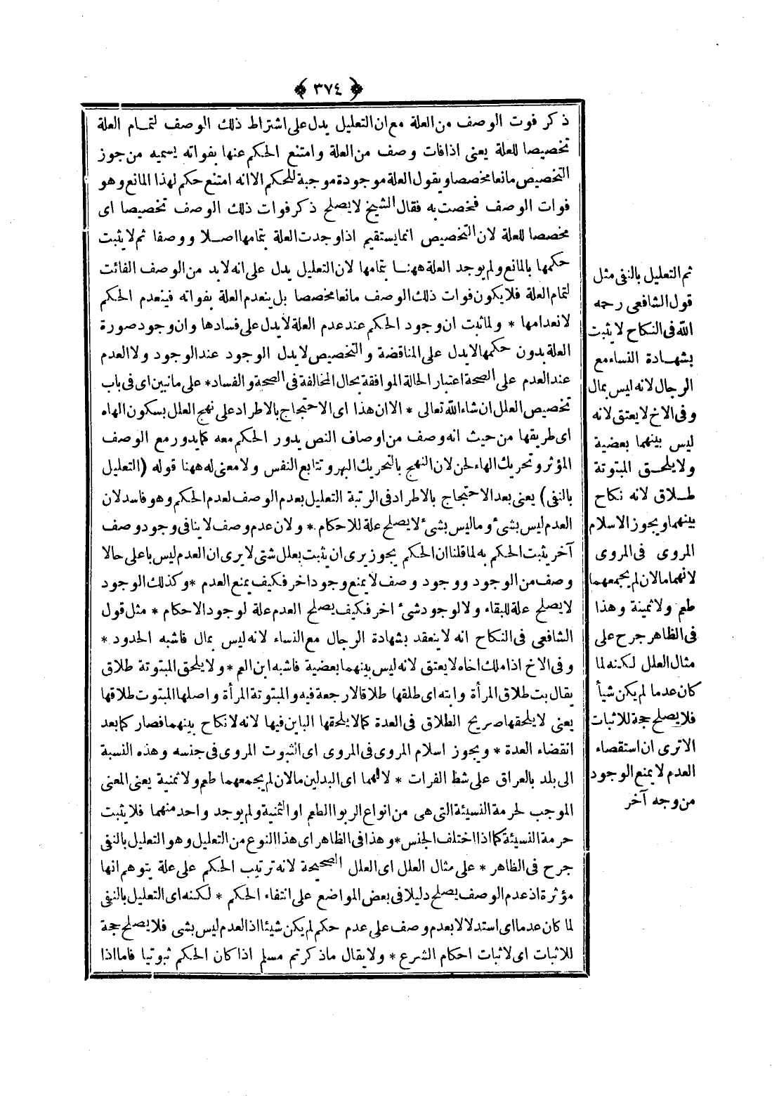 ـــــــــــــــــــــــــــــQذِكْرُ فَوْتِ الْوَصْفِ مِنْ الْعِلَّةِ مَعَ أَنَّ التَّعْلِيلَ يَدُلُّ عَلَى اشْتِرَاطِ ذَلِكَ الْوَصْفِ لِتَمَامِ الْعِلَّةِ تَخْصِيصًا لِلْعِلَّةِ يَعْنِي إذَا فَاتَ وَصْفٌ مِنْ الْعِلَّةِ وَامْتَنَعَ الْحُكْمُ عَنْهَا بِفَوَاتِهِ يُسَمِّيهِ مَنْ جَوَّزَ التَّخْصِيصَ مَانِعًا مُخَصَّصًا، وَيَقُولُ الْعِلَّةُ مَوْجُودَةٌ مُوجِبَةٌ لِلْحُكْمِ إلَّا أَنَّهُ امْتَنَعَ حُكْمٌ لِهَذَا الْمَانِعِ، وَهُوَ فَوَاتُ الْوَصْفِ فَخُصَّتْ بِهِ فَقَالَ الشَّيْخُ لَا يَصْلُحُ ذِكْرُ فَوَاتِ ذَلِكَ الْوَصْفِ تَخْصِيصًا أَيْ مُخَصَّصًا لِلْعِلَّةِ؛ لِأَنَّ التَّخْصِيصَ إنَّمَا يَسْتَقِيمُ إذَا وُجِدَتْ الْعِلَّةُ بِتَمَامِهَا أَصْلًا وَوَصْفًا، ثُمَّ لَا يَثْبُتُ حُكْمُهَا بِالْمَانِعِ وَلَمْ يُوجَدْ الْعِلَّةُ هَاهُنَا بِتَمَامِهَا؛ لِأَنَّ التَّعْلِيلَ يَدُلُّ عَلَى أَنَّهُ لَا بُدَّ مِنْ الْوَصْفِ الْفَائِتِ لِتَمَامِ الْعِلَّةِ فَلَا يَكُونُ فَوَاتُ ذَلِكَ الْوَصْفِ مَانِعًا مُخَصَّصًا بَلْ يَنْعَدِمُ الْعِلَّةُ بِفَوَاتِهِ فَيَنْعَدِمُ الْحُكْمُ لِانْعِدَامِهَا، وَلَمَّا ثَبَتَ أَنَّ وُجُودَ الْحُكْمِ عِنْدَ عَدَمِ الْعِلَّةِ لَا يَدُلُّ عَلَى فَسَادِهَا وَأَنَّ وُجُودَ صُورَةِ الْعِلَّةِ بِدُونِ حُكْمِهَا لَا يَدُلُّ عَلَى الْمُنَاقَضَةِ، وَالتَّخْصِيصُ لَا يَدُلُّ الْوُجُودُ عِنْدَ الْوُجُودِ وَلَا الْعَدَمُ عِنْدَ الْعَدَمِ عَلَى الصِّحَّةِ اعْتِبَارًا لِحَالَةِ الْمُوَافَقَةُ بِحَالِ الْمُخَالَفَةِ فِي الصِّحَّةِ وَالْفَسَادِ عَلَى مَا تَبَيَّنَّ أَيْ فِي بَابِ تَخْصِيصِ الْعِلَلِ إنْ شَاءَ اللَّهُ تَعَالَى إلَّا أَنَّ هَذَا أَيْ الِاحْتِجَاجَ بِالِاطِّرَادِ عَلَى نَهْجِ الْعِلَلِ بِسُكُونِ الْهَاءِ أَيْ طَرِيقِهَا مِنْ حَيْثُ إنَّهُ وَصْفٌ مِنْ أَوْصَافِ النَّصِّ يَدُورُ الْحُكْمُ مَعَهُ كَمَا يَدُورُ مَعَ الْوَصْفِ الْمُؤَثِّرِ، وَتَحْرِيكُ الْهَاءِ لَحْنٌ؛ لِأَنَّ النَّهَجَ بِالتَّحْرِيكِ الْبُهْرُ وَتَتَابُعُ النَّفَسِ وَلَا مَعْنًى لَهُ هَاهُنَا.