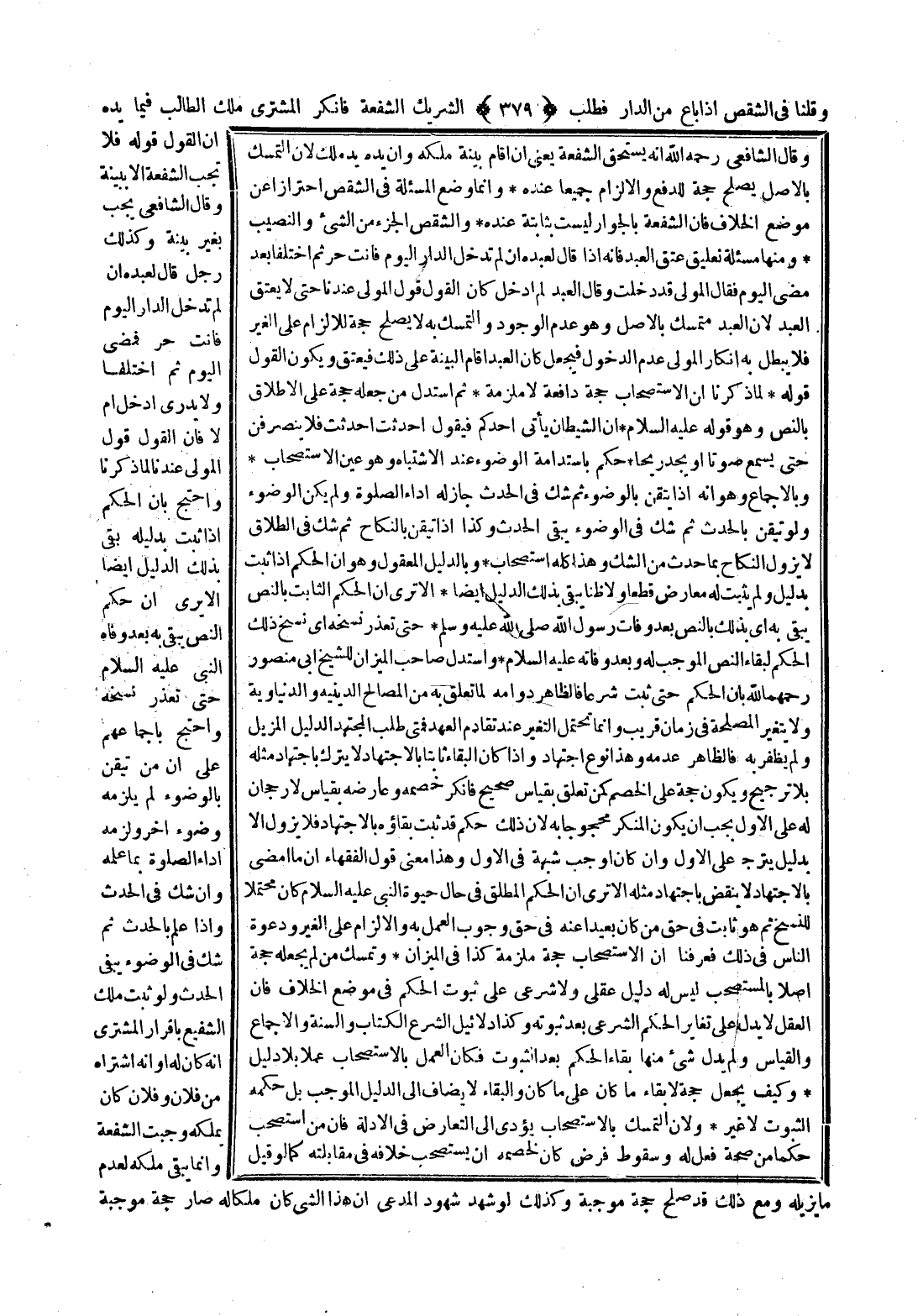 وَقُلْنَا فِي الشِّقْصِ: إذَا بَاعَ مِنْ الدَّارِ فَطَلَبَ الشَّرِيكُ الشُّفْعَةَ فَأَنْكَرَ الْمُشْتَرِي مِلْكَ الطَّالِبِ فِيمَا يَدُهُ أَنَّ الْقَوْلَ قَوْلُهُ فَلَا تَجِبُ الشُّفْعَةُ إلَّا بِبَيِّنَةٍ وَقَالَ الشَّافِعِيُّ: يَجِبُ بِغَيْرِ بَيِّنَةٍ وَكَذَلِكَ رَجُلٌ قَالَ لِعَبْدِهِ: إنْ لَمْ تَدْخُلْ الدَّارَ الْيَوْمَ فَأَنْتَ حُرٌّ فَمَضَى الْيَوْمُ ثُمَّ اخْتَلَفَا وَلَا يَدْرِي أَدَخَلَ أَمْ لَا فَإِنَّ الْقَوْلَ قَوْلُ الْمَوْلَى عِنْدَنَا لِمَا ذَكَرْنَا وَاحْتَجَّ بِأَنَّ الْحُكْمَ إذَا ثَبَتَ بِدَلِيلِهِ بَقِيَ بِذَلِكَ الدَّلِيلِ أَيْضًا، أَلَا يَرَى أَنَّ حُكْمَ النَّصِّ يَبْقَى بِهِ بَعْدَ وَفَاةِ النَّبِيِّ - صَلَّى اللَّهُ عَلَيْهِ وَسَلَّمَ - حَتَّى تَعَذَّرَ نَسْخُهُ وَاحْتَجَّ بِإِجْمَاعِهِمْ عَلَى أَنَّ مَنْ تَيَقَّنَ بِالْوُضُوءِ لَمْ يَلْزَمْهُ وُضُوءٌ آخَرُ وَلَزِمَهُ أَدَاءُ الصَّلَاةِ بِمَا عَلِمَهُ وَإِنْ شَكَّ فِي الْحَدَثِ وَإِذَا عَلِمَ بِالْحَدَثِ، ثُمَّ شَكَّ فِي الْوُضُوءِ يَبْقَى الْحَدَثُ وَلَوْ ثَبَتَ مِلْكُ الشَّفِيعِ بِإِقْرَارِ الْمُشْتَرِي أَنَّهُ كَانَ لَهُ وَأَنَّهُ اشْتَرَاهُ مِنْ فُلَانٍ وَفُلَانٌ كَانَ يَمْلِكُهُ وَجَبَتْ الشُّفْعَةُ وَإِنَّمَا يَبْقَى مِلْكُهُ لِعَدَمِ مَا يُزِيلُهُ، وَمَعَ ذَلِكَ قَدْ صَلُحَ حُجَّةً مُوجِبَةً وَكَذَلِكَ لَوْ شَهِدَ شُهُودُ الْمُدَّعِي أَنَّ هَذَا الشَّيْءَ كَانَ مِلْكًا لَهُ صَارَ حُجَّةً مُوجِبَةً