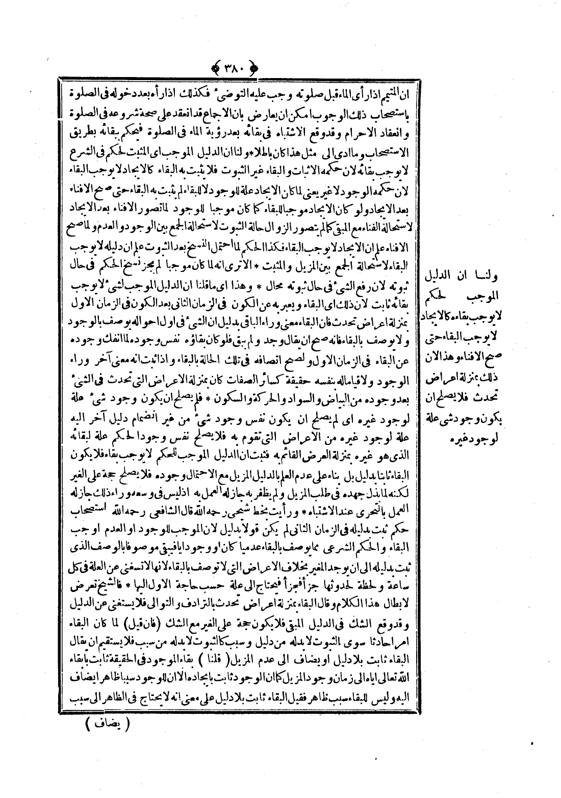 وَهَذَا أَيْ مَا قُلْنَا إنَّ الدَّلِيلَ الْمُوجِبَ لِشَيْءٍ لَا يُوجِبُ بَقَاءَهُ ثَابِتٌ؛ لِأَنَّ ذَلِكَ أَيْ الْبَقَاءَ، وَيُعَبَّرُ بِهِ عَنْ الْكَوْنِ فِي الزَّمَانِ الثَّانِي بَعْدَ الْكَوْنِ فِي الزَّمَانِ الْأَوَّلِ بِمَنْزِلَةِ أَعْرَاضٍ تَحْدُثُ فَإِنَّ الْبَقَاءَ مَعْنًى وَرَاءَ الْبَاقِي بِدَلِيلِ أَنَّ الشَّيْءَ فِي أَوَّلِ أَحْوَالِهِ يُوصَفُ بِالْوُجُودِ وَلَا يُوصَفُ بِالْبَقَاءِ فَإِنَّهُ صَحَّ أَنْ يُقَالَ وُجِدَ وَلَمْ يَبْقَ فَلَوْ كَانَ بَقَاؤُهُ نَفْسَ وُجُودِهِ لَمَّا انْفَكَّ وُجُودُهُ عَنْ الْبَقَاءِ فِي الزَّمَانِ الْأَوَّلِ وَلَصَحَّ اتِّصَافُهُ فِي تِلْكَ الْحَالَةِ بِالْبَقَاءِ.