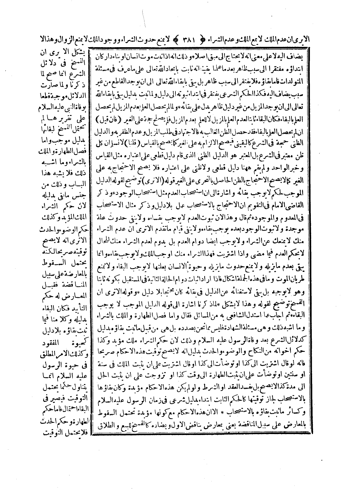 أَلَا يَرَى أَنَّ عَدَمَ الْمِلْكِ لَا يَمْنَعُ الْمِلْكَ وَعَدَمَ الشِّرَاءِ لَا يَمْنَعُ حُدُوثَ الشِّرَاءِ وَوُجُودَ الْمِلْكِ لَا يَمْنَعُ الزَّوَالَ، وَهَذَا لَا يَشْكُلُ، أَلَا يَرَى أَنَّ النَّسْخَ فِي دَلَائِلِ الشَّرْعِ إنَّمَا صَحَّ لِمَا ذَكَرْنَا وَلَمَّا صَارَتْ الدَّلَائِلُ مُوجِبَةً قَطْعًا بِوَفَاةِ النَّبِيِّ - عَلَيْهِ السَّلَامُ - عَلَى تَقْرِيرِهَا لَمْ تَحْتَمِلْ النَّسْخَ لِبَقَائِهَا بِدَلِيلٍ مُوجِبٍ وَأَمَّا فَصْلُ الطَّهَارَةِ وَالْمِلْكِ بِالشِّرَاءِ وَمَا أَشْبَهَ ذَلِكَ فَلَا يُشْبِهُ هَذَا الْبَابَ وَذَلِكَ مِنْ جِنْسِ مَا يَفِي بِدَلِيلِهِ، لِأَنَّ حُكْمَ الشِّرَاءِ الْمِلْكُ الْمُؤَبَّدُ وَكَذَلِكَ حُكْمُ الْوُضُوءِ وَالْحَدَثِ أَلَا تَرَى أَنَّهُ لَا يَصِحُّ تَوْقِيتُهُ صَرِيحًا لَكِنَّهُ يَحْتَمِلُ السُّقُوطَ بِالْمُعَارَضَةِ عَلَى سَبِيلِ الْمُنَاقَضَةِ فَقَبِلَ الْمُعَارِضُ لَهُ حُكْمَ التَّأْبِيدِ فَكَانَ الْبَقَاءُ بِدَلِيلِهِ، وَكَلَامُنَا فِيمَا ثَبَتَ بَقَاؤُهُ بِلَا دَلِيلٍ كَحَيَاةِ الْمَفْقُودَةِ وَكَذَلِكَ الْأَمْرُ الْمُطْلَقُ فِي حَيَاةِ الرَّسُولِ - عَلَيْهِ السَّلَامُ - إنَّمَا يَتَنَاوَلُ حُكْمًا يَحْتَمِلُ التَّوْقِيتَ فَيَصِيرُ فِي الْبَقَاءِ احْتِمَالٌ فَأَمَّا حُكْمُ الطَّهَارَةِ وَحُكْمُ الْحَدَثِ فَلَا يَحْتَمِلُ التَّوْقِيتَ