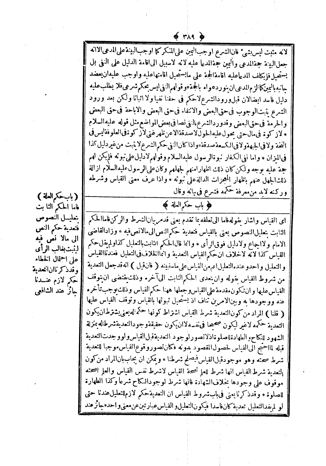 وَإِذَا عُرِفَ مَعْنَى الْقِيَاسِ وَشَرْطُهُ وَرُكْنُهُ لَا بُدَّ مِنْ مَعْرِفَةِ حُكْمِهِ فَشَرَعَ فِي بَيَانِهِ وَقَالَ. (بَابُ) (حُكْمِ الْعِلَّةِ) أَيْ الْقِيَاسِ وَأَشَارَ بِقَوْلِهِ فَأَمَّا إلَى تَعَلُّقِهِ بِمَا تَقَدَّمَ، يَعْنِي قَدْ مَرَّ بَيَانُ الشَّرْطِ وَالرُّكْنِ فَأَمَّا الْحُكْمُ الثَّابِتُ بِتَعْلِيلِ النُّصُوصِ يَعْنِي بِالْقِيَاسِ فَتَعْدِيَةُ حُكْمِ النَّصِّ إلَى مَا لَا نَصَّ فِيهِ وَزَادَ الْقَاضِي الْإِمَامُ: وَلَا إجْمَاعَ وَلَا دَلِيلَ فَوْقَ الرَّأْيِ، وَإِنَّمَا قَالَ: الْحُكْمُ الثَّابِتُ بِالتَّعْلِيلِ كَذَا وَلَمْ يَقُلْ حُكْمُ الْقِيَاسِ كَذَا؛ لِأَنَّهُ لَا خِلَافَ أَنَّ حُكْمَ الْقِيَاسِ التَّعْدِيَةُ، وَإِنَّمَا الْخِلَافُ فِي التَّعْلِيلِ فَعِنْدَنَا الْقِيَاسُ وَالتَّعْلِيلُ وَاحِدٌ وَعِنْدَهُ التَّعْلِيلُ أَعَمُّ مِنْ الْقِيَاسِ عَلَى مَا سَنُبَيِّنُهُ (فَإِنْ قِيلَ) إنَّهُ قَدْ جَعَلَ التَّعْدِيَةَ مِنْ شُرُوطِ الْقِيَاسِ بِقَوْلِهِ وَأَنْ يَتَعَدَّى الْحُكْمُ الثَّابِتُ إلَى آخِرِهِ وَذَلِكَ يَقْتَضِي أَنْ يَتَوَقَّفَ الْقِيَاسُ عَلَيْهَا، وَأَنْ تَكُونَ مُقَدَّمَةً عَلَى الْقِيَاسِ وَجَعَلَهَا هَاهُنَا حُكْمَ الْقِيَاسِ وَذَلِكَ يُوجِبُ تَأَخُّرَهُ عَنْهُ وَوُجُودُهَا بِهِ. وَبَيْنَ الْأَمْرَيْنِ تَنَافٍ إذْ يَسْتَحِيلُ ثُبُوتُهَا بِالْقِيَاسِ وَتَوَقُّفِ الْقِيَاسِ عَلَيْهَا (قُلْنَا) الْمُرَادُ مِنْ كَوْنِ التَّعْدِيَةِ شَرْطَ الْقِيَاسِ اشْتِرَاطُ كَوْنِهَا حُكْمًا لَهُ يَعْنِي يُشْتَرَط أَنْ يَكُونَ التَّعْدِيَةُ حُكْمَهُ لَا غَيْرُ؛ لِيَكُونَ صَحِيحًا فِي نَفْسِهِ لَا أَنْ يَكُونَ حَقِيقَةُ وُجُودِ التَّعْدِيَةِ شَرْطًا لَهُ بِمَنْزِلَةِ الشُّهُودِ لِلنِّكَاحِ وَالطَّهَارَةِ لِلصَّلَاةِ إذْ لَا تَصَوُّرَ لِوُجُودِ التَّعْدِيَةِ قَبْلَ الْقِيَاسِ وَلَوْ وُجِدَتْ التَّعْدِيَةُ قَبْلَهُ لَمَا اُحْتِيجَ إلَى الْقِيَاسِ؛ لِحُصُولِ الْمَقْصُودِ بِدُونِهِ فَكَانَ تَصَوُّرُ وُقُوعِ الْقِيَاسِ مُوجِبًا لِلتَّعْدِيَةِ شَرْطَ صِحَّتِهِ وَهُوَ مَوْجُودٌ قَبْلَ الْقِيَاسِ فَيَصْلُحُ شَرْطُنَا.