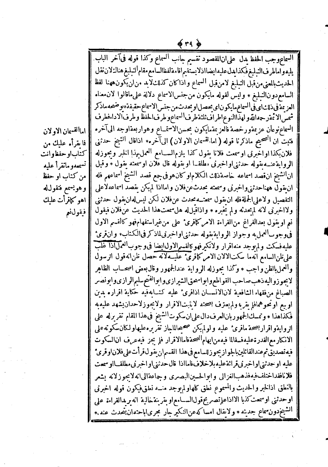 وَكَذَا قَوْلُهُ فِي آخِرِ الْبَابِ يَلِيهِ، وَأَمَّا طَرَفُ التَّبْلِيغِ، فَكَذَا يَدُلُّ عَلَيْهِ أَيْضًا إذْ لَا يَسْتَقِيمُ إقَامَةُ لَفْظِ السَّامِعِ مَقَامَ التَّبْلِيغِ هُنَاكَ؛ لِأَنَّ نَقْلَ الْحَدِيثِ بِالْمَعْنَى مِنْ قِبَلِ التَّبْلِيغِ لَا مِنْ قِبَلِ السَّمَاعِ، وَإِذَا كَانَ كَذَلِكَ لَا بُدَّ مِنْ أَنْ يَكُونَ هَاهُنَا لَفْظُ السَّامِعِ دُونَ التَّبْلِيغِ وَلَيْسَ لِقَوْلِهِ مَا يَكُونُ مِنْ جِنْسِ الْأَسْمَاعِ دَلَالَةٌ عَلَى مَا قَالُوا؛ لِأَنَّ مَعْنَاهُ الْعَزِيمَةُ فِي ذَلِكَ أَيْ فِي السَّمَاعِ مَا يَكُونُ أَيْ يَحْصُلُ أَوْ يَحْدُثُ مِنْ جِنْسِ الْأَسْمَاعِ حَقِيقَةً، يُوَضِّحُهُ مَا ذَكَرَ شَمْسُ الْأَئِمَّةِ - رَحِمَهُ اللَّهُ -، وَلِهَذَا النَّوْعِ أَطْرَافٌ ثَلَاثَةٌ طَرَفُ السَّمَاعِ وَطَرَفُ الْحِفْظِ وَطَرَفُ الْأَدَاءِ فَطَرَفُ السَّمَاعِ نَوْعَانِ عَزِيمَةٌ وَرُخْصَةٌ فَالْعَزِيمَةُ مَا يَكُونُ بِحُسْنِ الِاسْتِمَاعِ، وَهُوَ أَرْبَعَةُ أَوْجُهٍ إلَى آخِرِهِ فَثَبَتَ أَنَّ الصَّحِيحَ مَا ذَكَرْنَا.