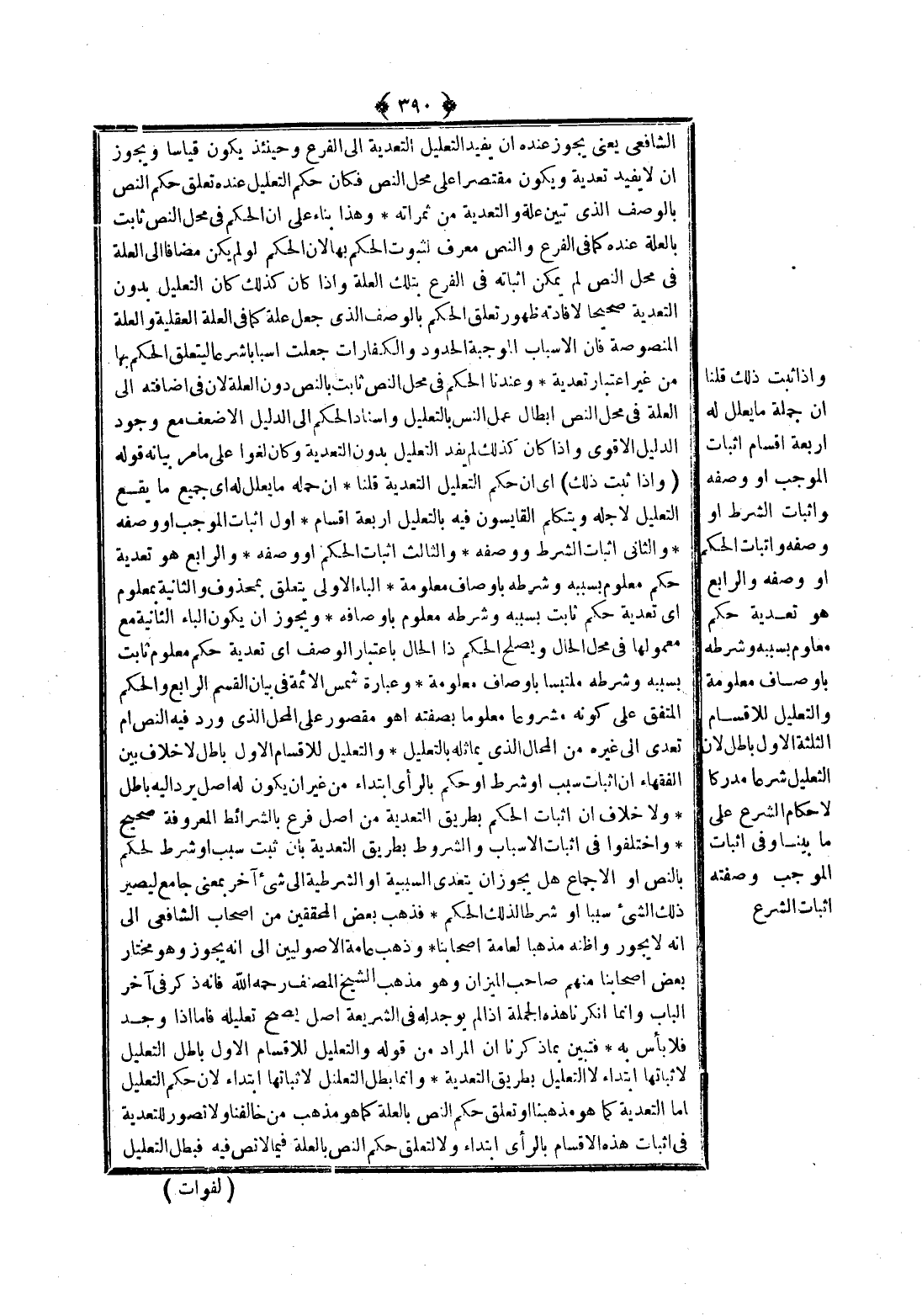 ـــــــــــــــــــــــــــــQالشَّافِعِيِّ يَعْنِي يَجُوزُ عِنْدَهُ أَنْ يُفِيدَ التَّعْلِيلُ التَّعْدِيَةَ إلَى الْفَرْعِ وَحِينَئِذٍ يَكُونُ قِيَاسًا وَيَجُوزُ أَنْ لَا يُفِيدَ تَعْدِيَةً وَيَكُونُ مُقْتَصِرًا عَلَى مَحَلِّ النَّصِّ فَكَانَ حُكْمُ التَّعْلِيلِ عِنْدَهُ تَعَلُّقَ حُكْمِ النَّصِّ بِالْوَصْفِ الَّذِي تَبَيَّنَ عِلَّةً وَالتَّعْدِيَةُ مِنْ ثَمَرَاتِهِ.