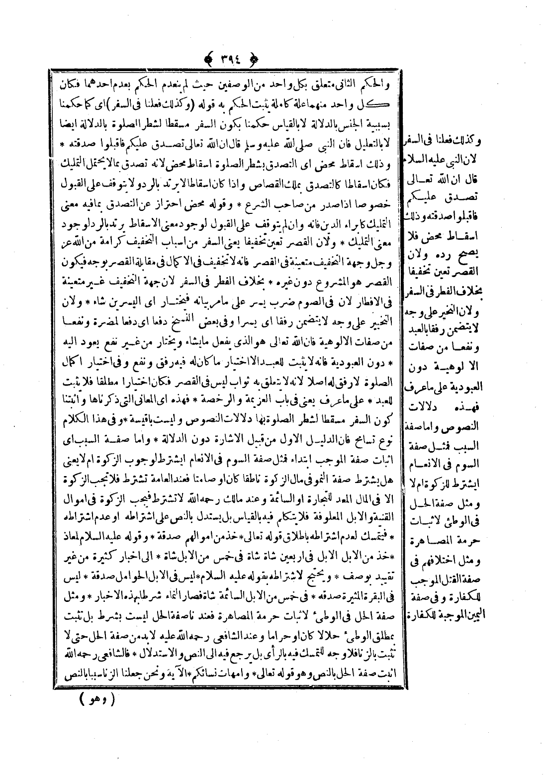 وَفِي هَذَا الْكَلَامِ نَوْعُ تَسَامُحٍ فَإِنَّ الدَّلِيلَ الْأَوَّلَ مِنْ قَبِيلِ الْإِشَارَةِ دُونَ الدَّلَالَةِ وَأَمَّا صِفَةُ السَّبَبِ أَيْ إثْبَاتُ صِفَةِ الْمُوجِبِ ابْتِدَاءً فَمِثْلُ صِفَةِ السَّوْمِ فِي الْأَنْعَامِ أَيُشْتَرَطُ لِوُجُوبِ الزَّكَاةِ أَمْ لَا يَعْنِي هَلْ يُشْتَرَطُ صِفَةُ النُّمُوِّ فِي مَالِ الزَّكَاةِ نَاطِقًا كَانَ أَوْ صَامِتًا فَعِنْدَ الْعَامَّةِ تُشْتَرَطُ فَلَا تَجِبُ الزَّكَاةُ إلَّا فِي الْمَالِ الْمُعَدِّ لِلتِّجَارَةِ أَوْ السَّائِمَةِ وَعِنْدَ مَالِكٍ - رَحِمَهُ اللَّهُ - لَا تُشْتَرَطُ فَيَجِبُ الزَّكَاةُ فِي أَمْوَالِ الْقِنْيَةِ وَالْإِبِلِ الْمَعْلُوفَةِ فَلَا يَتَكَلَّمُ فِيهِ بِالْقِيَاسِ بَلْ يَسْتَدِلُّ بِالنَّصِّ عَلَى اشْتِرَاطِهِ أَوْ عَدَمِ اشْتِرَاطِهِ فَيَتَمَسَّكُ لِعَدَمِ اشْتِرَاطِهِ بِإِطْلَاقِ قَوْله تَعَالَى {خُذْ مِنْ أَمْوَالِهِمْ صَدَقَةً} [التوبة: 103] وَقَوْلِهِ - عَلَيْهِ السَّلَامُ - لِمُعَاذٍ «خُذْ مِنْ الْإِبِلِ فِي أَرْبَعِينَ شَاةً شَاةً وَفِي خَمْسٍ مِنْ الْإِبِلِ شَاةً» إلَى أَخْبَارٍ كَثِيرَةٍ مِنْ غَيْرِ تَقْيِيدٍ بِوَصْفٍ وَيُحْتَجُّ لِاشْتِرَاطِهِ بِقَوْلِهِ - عَلَيْهِ السَّلَامُ - «لَيْسَ فِي الْإِبِلِ الْحَوَامِلِ صَدَقَةٌ» «لَيْسَ فِي الْبَقَرَةِ الْمُثِيرَةِ صَدَقَةٌ» «فِي خَمْسٍ مِنْ الْإِبِلِ السَّائِمَةِ شَاةٌ» فَصَارَ النَّمَاءُ شَرْطًا بِهَذِهِ الْأَخْبَارِ وَمِثْلُ صِفَةِ الْحِلِّ فِي الْوَطْءِ لِإِثْبَاتِ حُرْمَةِ الْمُصَاهَرَةِ فَعِنْدَنَا صِفَةُ الْحِلِّ لَيْسَتْ بِشَرْطٍ بَلْ تَثْبُتُ بِمُطْلَقِ الْوَطْءِ حَلَالًا كَانَ أَوْ حَرَامًا وَعِنْدَ الشَّافِعِيِّ - رَحِمَهُ اللَّهُ - عَلَيْهِ لَا بُدَّ مِنْ صِفَةِ الْحِلِّ حَتَّى لَا تَثْبُتَ بِالزِّنَا فَلَا وَجْهَ لِلتَّمَسُّكِ فِيهِ بِالرَّأْيِ بَلْ يَرْجِعُ فِيهِ إلَى النَّصِّ وَالِاسْتِدْلَالِ فَالشَّافِعِيُّ - رَحِمَهُ اللَّهُ - أَثْبَتَ صِفَةَ الْحِلِّ بِالنَّصِّ وَهُوَ قَوْله تَعَالَى {وَأُمَّهَاتُ نِسَائِكُمْ} [النساء: 23] الْآيَةَ وَنَحْنُ جَعَلْنَا الزِّنَا سَبَبًا بِالنَّصِّ