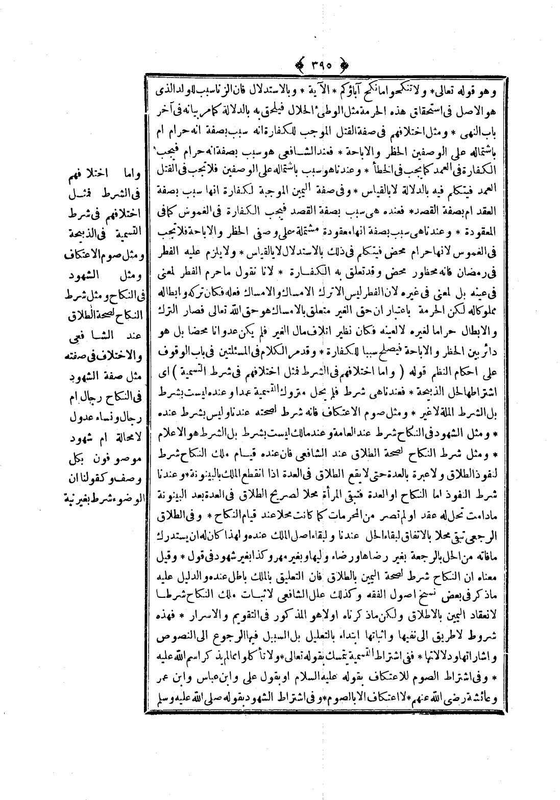 وَأَمَّا اخْتِلَافُهُمْ فِي الشَّرْطِ فَمِثْلُ اخْتِلَافِهِمْ فِي شَرْطِ التَّسْمِيَةِ فِي الذَّبِيحَةِ وَمِثْلُ صَوْمِ الِاعْتِكَافِ وَمِثْلُ الشُّهُودِ فِي النِّكَاحِ وَمِثْلُ شَرْطِ النِّكَاحِ لِصِحَّةِ الطَّلَاقِ عِنْدَ الشَّافِعِيِّ وَالِاخْتِلَافُ فِي صِفَتِهِ مِثْلُ صِفَةِ الشُّهُودِ فِي النِّكَاحِ رِجَالٌ أَمْ رِجَالٌ وَنِسَاءٌ عُدُولٌ لَا مَحَالَةَ أَمْ شُهُودٌ مَوْصُوفُونَ بِكُلِّ وَصْفٍ وَكَقَوْلِنَا: إنَّ الْوُضُوءَ شَرْطٌ بِغَيْرِ نِيَّةٍ