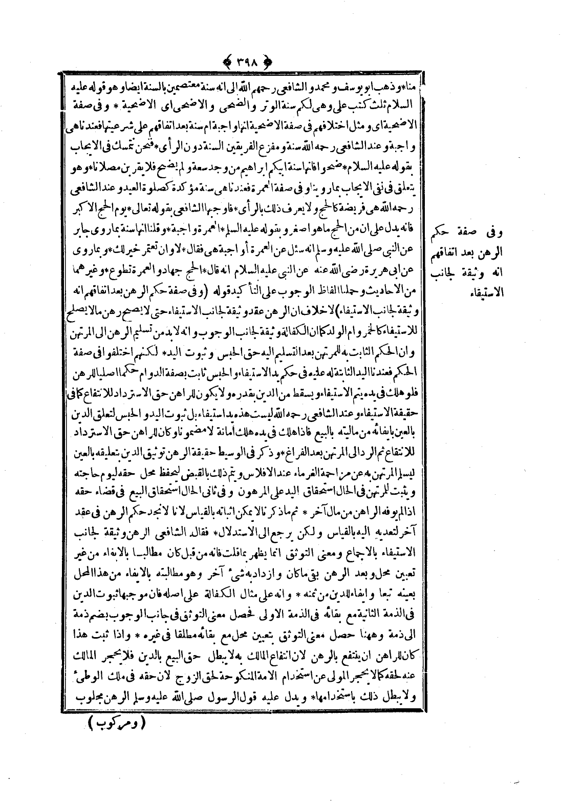 وَبِمَا رُوِيَ عَنْ أَبِي هُرَيْرَةَ - رَضِيَ اللَّهُ عَنْهُ - عَنْ النَّبِيِّ - عَلَيْهِ السَّلَامُ - أَنَّهُ قَالَ «الْحَجُّ جِهَادٌ وَالْعُمْرَةُ تَطَوُّعٌ» وَغَيْرُهُمَا مِنْ الْأَحَادِيثِ، وَحَمَلْنَا أَلْفَاظَ الْوُجُوبِ عَلَى التَّأْكِيدِ قَوْلُهُ (وَفِي صِفَةِ حُكْمِ الرَّهْنِ بَعْدَ اتِّفَاقِهِمْ أَنَّهُ وَثِيقَةٌ لِجَانِبِ الِاسْتِيفَاءِ) لَا خِلَافَ أَنَّ الرَّهْنَ عَقْدُ وَثِيقَةٍ لِجَانِبِ الِاسْتِيفَاءِ حَتَّى لَا يَصِحَّ رَهْنُ مَا لَا يَصْلُحُ لِلِاسْتِيفَاءِ كَالْخَمْرِ وَأُمِّ الْوَلَدِ كَمَا أَنَّ الْكَفَالَةَ وَثِيقَةٌ لِجَانِبِ الْوُجُوبِ وَأَنَّهُ لَا بُدَّ مِنْ تَسْلِيمِ الرَّهْنِ إلَى الْمُرْتَهِنِ وَأَنَّ الْحُكْمَ الثَّابِتَ بِهِ لِلْمُرْتَهِنِ بَعْدَ التَّسْلِيمِ إلَيْهِ حَقُّ الْحَبْسِ وَثُبُوتُ الْيَدِ لَكِنَّهُمْ اخْتَلَفُوا فِي صِفَةِ الْحُكْمِ فَعِنْدَنَا الْيَدُ الثَّابِتَةُ لَهُ عَلَيْهِ فِي حُكْمِ يَدِ الِاسْتِيفَاءِ وَالْحَبْسُ ثَابِتٌ بِصِفَةِ الدَّوَامِ حُكْمًا أَصْلِيًّا لِلرَّهْنِ فَلَوْ هَلَكَ فِي يَدِهِ يَتِمُّ الِاسْتِيفَاءُ وَيَسْقُطُ مِنْ الدَّيْنِ بِقَدْرِهِ وَلَا يَكُونُ لِلرَّاهِنِ حَقُّ الِاسْتِرْدَادِ لِلِانْتِفَاعِ كَمَا فِي حَقِيقَةِ الِاسْتِيفَاءِ وَعِنْدَ الشَّافِعِيِّ - رَحِمَهُ اللَّهُ - لَيْسَتْ هَذِهِ يَدَ اسْتِيفَاءٍ بَلْ ثُبُوتُ الْيَدِ وَالْحَبْسِ لِتَعَلُّقِ الدَّيْنِ بِالْعَيْنِ بِإِيفَائِهِ مِنْ مَالِيَّتِهِ بِالْبَيْعِ فَإِذَا هَلَكَ فِي يَدِهِ هَلَكَ أَمَانَةً لَا مَضْمُونًا وَكَانَ لِلرَّاهِنِ حَقُّ الِاسْتِرْدَادِ لِلِانْتِفَاعِ ثُمَّ الرَّدِّ إلَى الْمُرْتَهِنِ بَعْدَ الْفَرَاغِ.