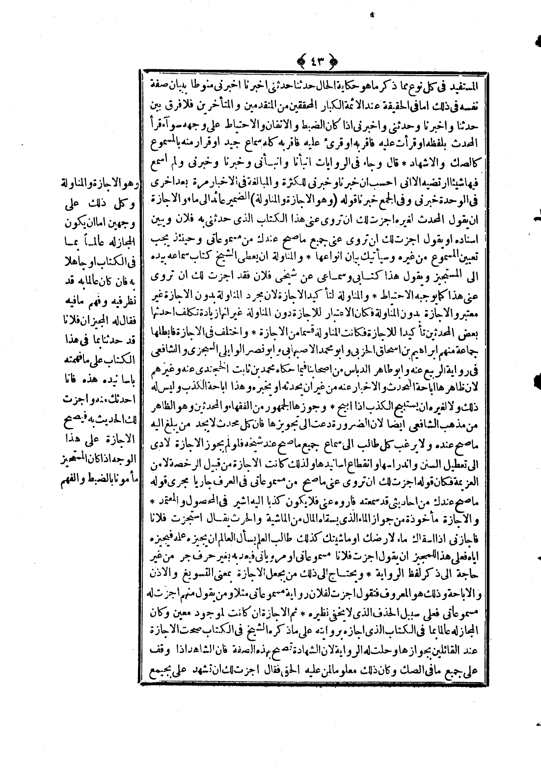 وَهُوَ الْإِجَازَةُ وَالْمُنَاوَلَةُ وَكُلُّ ذَلِكَ عَلَى وَجْهَيْنِ إمَّا أَنْ يَكُونَ الْمَجَازُ لَهُ عَالِمًا بِمَا فِي الْكِتَابِ أَوْ جَاهِلًا بِهِ فَإِنْ كَانَ عَالِمًا بِهِ قَدْ نَظَرَ فِيهِ وَفَهِمَ مَا فِيهِ فَقَالَ لَهُ الْمُجِيزُ إنَّ فُلَانًا قَدْ حَدَّثَنَا بِمَا فِي هَذَا الْكِتَابِ عَلَى مَا فَهِمْته بِأَسَانِيدِهِ هَذِهِ فَأَنَا أُحَدِّثُك مِنْهُ وَأَجَزْت لَك الْحَدِيثَ بِهِ فَيَصِحُّ الْإِجَازَةُ عَلَى هَذَا الْوَجْهِ إذَا كَانَ الْمُسْتَجِيزُ مَأْمُونًا بِالضَّبْطِ وَالْفَهْمِ