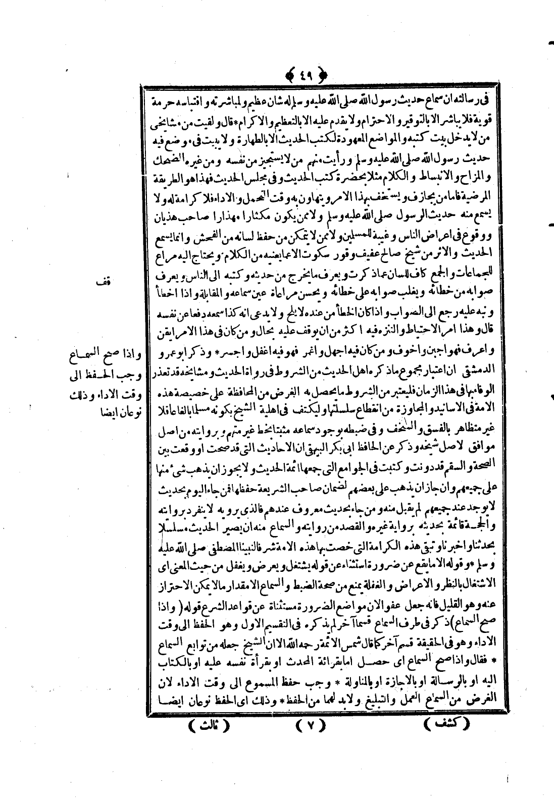 ـــــــــــــــــــــــــــــQفِي رِسَالَتِهِ إنَّ سَمَاعَ حَدِيثِ رَسُولِ اللَّهِ - صَلَّى اللَّهُ عَلَيْهِ وَسَلَّمَ - لَهُ شَأْنٌ عَظِيمٌ وَلِمُبَاشَرَتِهِ وَاقْتِبَاسِهِ حُرْمَةٌ قَوِيَّةٌ فَلَا يُبَاشِرُ إلَّا بِالتَّوْقِيرِ وَالِاحْتِرَامِ وَلَا يُقَدَّمُ إلَّا عَلَيْهِ بِالتَّعْظِيمِ وَالْإِكْرَامِ قَالَ وَلَقِيت مِنْ مَشَايِخِي مَنْ لَا يَدْخُلُ بَيْتَ كُتُبِهِ وَالْمَوَاضِعَ الْمَعْهُودَةَ لِكُتُبِ الْحَدِيثِ إلَّا بِالطَّهَارَةِ وَلَا يَبِيتُ فِي مَوْضِعٍ فِيهِ حَدِيثُ رَسُولِ اللَّهِ - صَلَّى اللَّهُ عَلَيْهِ وَسَلَّمَ - وَرَأَيْت مِنْهُمْ مَنْ لَا يَسْتَجِيزُ مِنْ نَفْسِهِ وَمِنْ غَيْرِهِ الضَّحِكُ وَالْمِزَاجُ وَالِانْبِسَاطُ وَالْكَلَامُ مَثَلًا بِحَضْرَةِ كُتُبِ الْحَدِيثِ وَفِي مَجْلِسِ الْحَدِيثِ فَهَذَا هُوَ الطَّرِيقَةُ الْمُرْضِيَةُ فَأَمَّا مَنْ يُجَازِفُ وَيَسْتَخِفُّ بِهَذَا الْأَمْرِ وَيَتَهَاوَنُ بِهِ وَقْتَ التَّحَمُّلِ وَالْأَدَاءِ فَلَا كَرَامَةَ لَهُ وَلَا يُسْمَعُ مِنْهُ حَدِيثُ الرَّسُولِ - صَلَّى اللَّهُ عَلَيْهِ وَسَلَّمَ - وَلَا مِمَّنْ يَكُونُ مِكْثَارًا مِهْذَارًا صَاحِبَ هَذَيَانٍ وَوُقُوعٍ فِي أَعْرَاضِ النَّاسِ وَغِيبَةٍ لِلْمُسْلِمِينَ وَلَا مِمَّنْ لَا يَتَمَكَّنُ مِنْ حِفْظِ لِسَانِهِ مِنْ الْفُحْشِ وَإِنَّمَا يَسْمَعُ الْحَدِيثَ وَالْأَثَرَ مِنْ شَيْخٍ صَالِحٍ عَفِيفٍ وَقُورٍ سَكُوتٍ إلَّا عَمَّا يَعْنِيهِ مِنْ الْكَلَامِ وَيَحْتَاجُ إلَيْهِ مُرَاعٍ لِلْجَمَاعَاتِ وَالْجُمَعِ كَافٍّ لِلِّسَانِ عَمَّا ذَكَرْت وَيَعْرِفُ مَا يَخْرُجُ مِنْ حَدِيثِهِ وَكُتُبِهِ إلَى النَّاسِ وَيَعْرِفُ صَوَابَهُ مِنْ خَطَئِهِ وَيَغْلِبُ صَوَابُهُ عَلَى خَطَئِهِ وَيُحْسِنُ مُرَاعَاةَ عَيْنِ سَمَاعِهِ وَالْمُقَابَلَةَ، وَإِذَا خَطَأَ وَنُبِّهَ عَلَيْهِ رَجَعَ إلَى الصَّوَابِ، وَإِذَا كَانَ الْخَطَأُ مِنْ عِنْدِهِ لَا يُلِحُّ وَلَا يَدَّعِي أَنَّهُ كَذَا سَمِعَهُ دَفْعًا عَنْ نَفْسِهِ قَالَ وَهَذَا أَمْرٌ الِاحْتِيَاطُ وَالتَّنَزُّهُ فِيهِ أَكْثَرُ مِنْ أَنْ يُوقَفَ عَلَيْهِ بِحَالٍ وَمَنْ كَانَ فِي هَذَا الْأَمْرِ أَيْقَنُ وَأَعْرَفُ فَهُوَ أَجْبَنُ وَأَخْوَفُ وَمَنْ كَانَ فِيهِ أَجْهَلُ وَأَغْمَرُ فَهُوَ فِيهِ أَغْفَلُ وَأَجْسَرُ.