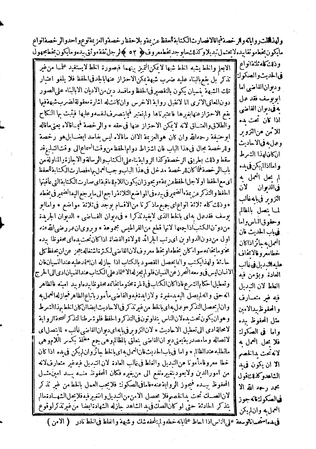 وَلِهَذَا قَلَّتْ رِوَايَاتُهُ وَالرُّخْصَةُ فِيمَا قَالَا فَصَارَتْ الْكِتَابَةُ لِلْحِفْظِ عَزِيمَةً وَبِلَا حِفْظٍ رُخْصَةً وَالْعَزِيمَةُ نَوْعٌ وَاحِدٌ وَالرُّخْصَةُ أَنْوَاعٌ مَا يَكُونُ بِخَطٍّ مُوَثَّقًا بِيَدِهِ لَا يَحْتَمِلُ تَبْدِيلًا وَكَذَلِكَ مَا يُوجَدُ بِخَطٍّ مَعْرُوفٍ لِرَجُلٍ ثِقَةٍ مُوَثَّقٍ بِيَدِهِ وَمَا يَكُونُ بِخَطِّ مَجْهُولٍ وَذَلِكَ كُلُّهُ ثَلَاثَةُ أَنْوَاعٍ فِي الْحَدِيثِ وَالصُّكُوكِ وَدِيوَانِ الْقَاضِي، أَمَّا أَبُو يُوسُفَ فَقَدْ عَمِلَ بِهِ فِي دِيوَانِ الْقَاضِي إذَا كَانَ تَحْتَ يَدِهِ لِلْأَمْنِ عَنْ التَّزْوِيرِ وَعَمِلَ بِهِ فِي الْأَحَادِيثِ إنْ كَانَ لِهَذَا الشَّرْطِ، وَأَمَّا إذَا لَمْ يَكُنْ فِي يَدِهِ لَمْ يَحِلَّ الْعَمَلُ بِهِ فِي الدِّيوَانِ؛ لِأَنَّ التَّزْوِيرَ فِي بَابِهِ غَالِبٌ لِمَا يَتَّصِلُ بِالْمَظَالِمِ وَحُقُوقِ النَّاسِ، وَأَمَّا فِي بَابِ الْحَدِيثِ؛ فَإِنَّ الْعَمَلَ بِهِ جَائِزٌ إذَا كَانَ خَطًّا مَعْرُوفًا لَا يَخَافُ عَلَيْهِ التَّبْدِيلَ فِي غَالِبِ الْعَادَةِ وَيُؤْمَنُ فِيهِ الْغَلَطُ؛ لِأَنَّ التَّبْدِيلَ فِيهِ غَيْرُ مُتَعَارَفٍ وَالْمَحْفُوظُ بِيَدِ الْأَمِينِ مِثْلُ الْمَحْفُوظِ بِيَدِهِ، وَأَمَّا فِي الصُّكُوكِ فَلَا يَحِلُّ الْعَمَلُ بِهِ؛ لِأَنَّهُ تَحْتَ يَدِ الْخَصْمِ إلَّا أَنْ يَكُونَ فِي يَدِ الشَّاهِدِ، وَكَذَلِكَ قَوْلُ مُحَمَّدٍ - رَحِمَهُ اللَّهُ - إلَّا فِي الصُّكُوكِ؛ فَإِنَّهُ جَوَّزَ الْعَمَلَ بِهِ وَإِنْ لَمْ يَكُنْ فِي يَدِهِ اسْتِحْسَانًا تَوْسِعَةً عَلَى النَّاسِ إذَا أَحَاطَ عِلْمًا بِأَنَّهُ خَطُّهُ وَلَمْ يَلْحَقْهُ شَكٌّ وَشُبْهَةٌ وَالْغَلَطُ فِي الْخَطِّ نَادِرٌ