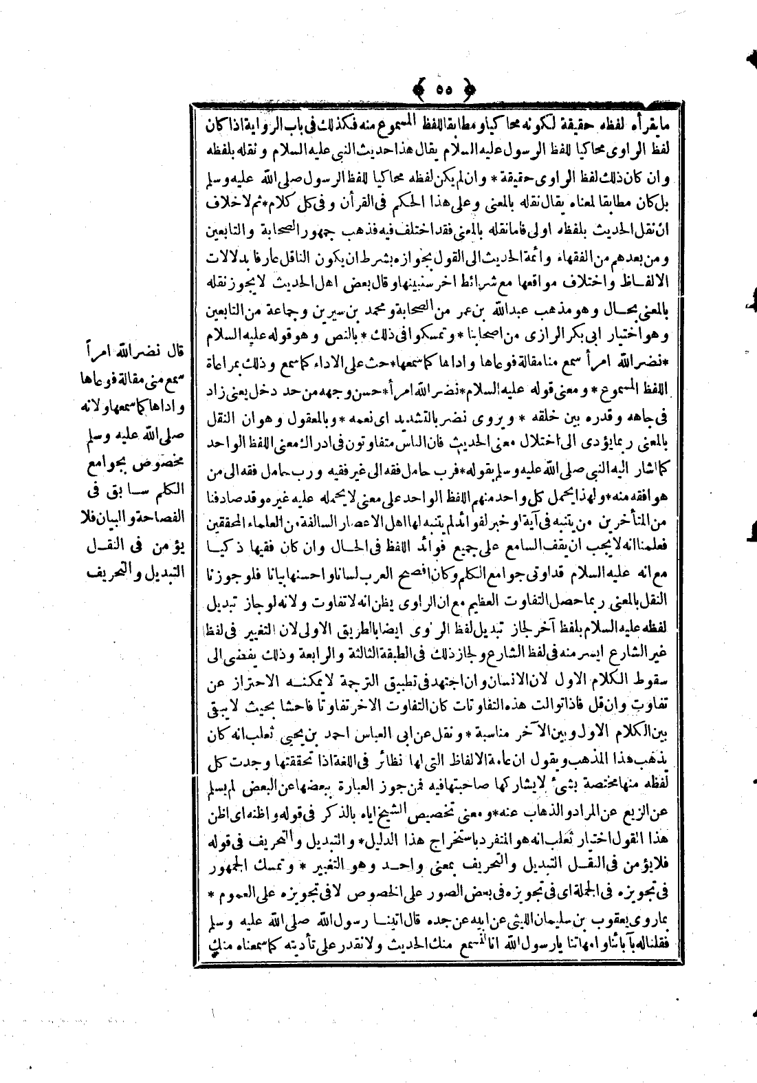 قَالَ «نَضَّرَ اللَّهُ امْرَأً سَمِعَ مِنِّي مَقَالَةً فَوَعَاهَا وَأَدَّاهَا كَمَا سَمِعَهَا» وَلِأَنَّهُ - صَلَّى اللَّهُ عَلَيْهِ وَسَلَّمَ - مَخْصُوصٌ بِجَوَامِعِ الْكَلِمِ سَابِقٌ فِي الْفَصَاحَةِ وَالْبَيَانِ فَلَا يُؤْمَنُ فِي النَّقْلِ التَّبْدِيلُ وَالتَّحْرِيفُ،