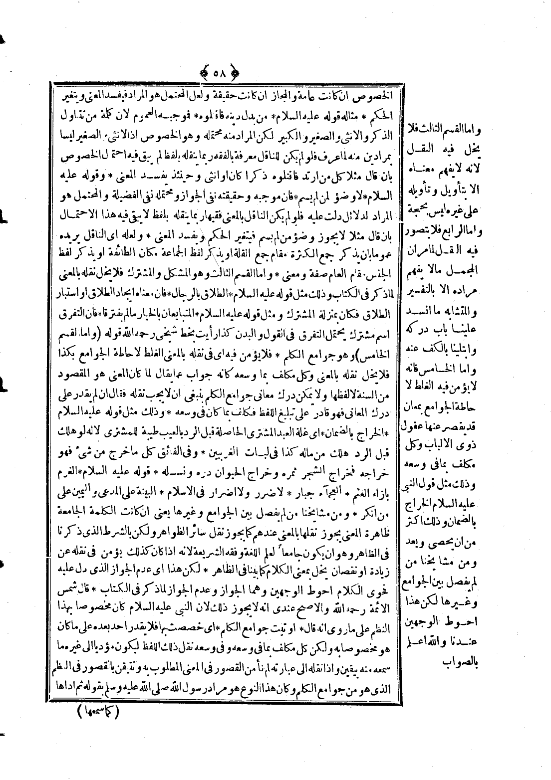 قَوْلُهُ - عَلَيْهِ السَّلَامُ - «الْغُرْمُ بِإِزَاءِ الْغُنْمِ» «الْعَجْمَاءُ جُبَارٌ» «لَا ضَرَرَ وَلَا ضِرَارَ فِي الْإِسْلَامِ» «الْبَيِّنَةُ عَلَى الْمُدَّعِي وَالْيَمِينُ عَلَى مَنْ أَنْكَرَ» . وَمِنْ مَشَايِخِنَا مَنْ لَمْ يَفْصِلْ بَيْنَ الْجَوَامِعِ وَغَيْرِهَا يَعْنِي إنْ كَانَتْ الْكَلِمَةُ الْجَامِعَةُ ظَاهِرَةَ الْمَعْنَى يَجُوزُ نَقْلُهَا بِالْمَعْنَى عِنْدَهُمْ كَمَا يَجُوزُ نَقْلُ سَائِرِ الظَّوَاهِرِ وَلَكِنْ بِالشَّرْطِ الَّذِي ذَكَرْنَا فِي الظَّاهِرِ وَهُوَ أَنْ يَكُونَ جَامِعًا لِعِلْمِ اللُّغَةِ وَفِقْهِ الشَّرِيعَةِ؛ لِأَنَّهُ إذَا كَانَ كَذَلِكَ يُؤْمَنُ فِي نَقْلِهِ عَنْ زِيَادَةٍ أَوْ نُقْصَانٍ يُخِلُّ بِمَعْنَى الْكَلَامِ كَمَا بَيَّنَّا فِي الظَّاهِرِ، لَكِنَّ هَذَا أَيْ عَدَمَ الْجَوَازِ الَّذِي دَلَّ عَلَيْهِ فَحْوَى الْكَلَامِ أَحْوَطُ الْوَجْهَيْنِ وَهُمَا الْجَوَازُ وَعَدَمُ الْجَوَازِ لِمَا ذُكِرَ فِي الْكِتَابِ قَالَ شَمْسُ الْأَئِمَّةِ - رَحِمَهُ اللَّهُ - وَالْأَصَحُّ عِنْدِي أَنَّهُ لَا يَجُوزُ ذَلِكَ؛ لِأَنَّ النَّبِيَّ - عَلَيْهِ السَّلَامُ - كَانَ مَخْصُوصًا بِهَذَا النَّظْمِ عَلَى مَا رُوِيَ أَنَّهُ قَالَ «أُوتِيتُ جَوَامِعَ الْكَلِمِ» أَيْ خُصِّصْت بِهَا فَلَا يَقْدِرُ أَحَدٌ بَعْدَهُ عَلَى مَا كَانَ هُوَ مَخْصُوصًا بِهِ وَلَكِنْ كُلُّ مُكَلَّفٍ بِمَا فِي وُسْعِهِ وَفِي وُسْعِهِ نَقْلُ ذَلِكَ اللَّفْظِ لِيَكُونَ مُؤَدِّيًا إلَى غَيْرِهِ مَا سَمِعَهُ مِنْهُ بِيَقِينٍ، وَإِذَا نَقَلَهُ إلَى عِبَارَتِهِ لَمْ نَأْمَنْ الْقُصُورَ فِي الْمَعْنَى الْمَطْلُوبِ بِهِ وَنَتَيَقَّنُ بِالْقُصُورِ فِي النَّظْمِ الَّذِي هُوَ مِنْ جَوَامِعِ الْكَلِمِ وَكَانَ هَذَا النَّوْعُ هُوَ مُرَادُ رَسُولِ اللَّهِ - صَلَّى اللَّهُ عَلَيْهِ وَسَلَّمَ - بِقَوْلِهِ ثُمَّ أَدَّاهَا