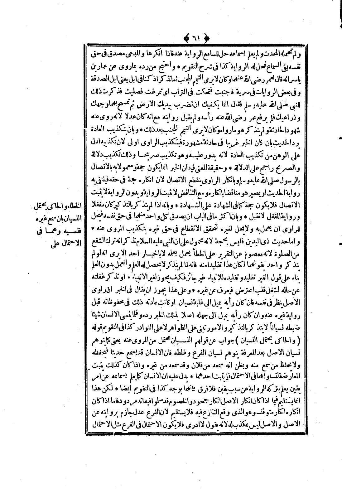 قَلْبٍ اعْتَرَضَ فَيُعْرَفُ عَنْ غَيْرِهِ، وَعَلَى هَذَا يَجُوزُ أَنْ يُقَالَ فِي الْخَبَرِ إنَّ رَاوِيَ الْأَصْلِ يَنْظُرُ فِي نَفْسِهِ فَإِنْ كَانَ رَأْيُهُ يَمِيلُ إلَى غَلَبَةِ نِسْيَانٍ أَوْ كَانَتْ عَادَتُهُ ذَلِكَ فِي مَحْفُوظَاتِهِ قَبْلَ رِوَايَةِ غَيْرِهِ عَنْهُ وَإِنْ كَانَ رَأْيُهُ يَمِيلُ إلَى جَهْلِهِ أَصْلًا بِذَلِكَ الْخَبَرِ رَدَّهُ وَقَلَّمَا يَنْسَى الْإِنْسَانُ شَيْئًا ضَبَطَهُ نِسْيَانًا لَا يَتَذَكَّرُ بِالتَّذْكِيرِ وَالْأُمُورُ تُبْنَى عَلَى الظَّوَاهِرِ لَا عَلَى النَّوَادِرِ كَذَا فِي التَّقْوِيمِ قَوْلُهُ (وَالْحَاكِي يَحْتَمِلُ النِّسْيَانَ) جَوَابٌ عَنْ قَوْلِهِمْ النِّسْيَانُ مُحْتَمَلٌ مِنْ الْمَرْوِيِّ عَنْهُ يَعْنِي كَمَا يُتَوَهَّمُ نِسْيَانُ الْأَصْلِ بَعْدَ الْمَعْرِفَةِ يُتَوَهَّمُ نِسْيَانُ الْفَرْعِ وَغَلَطُهُ فَإِنَّ الْإِنْسَانَ قَدْ يَسْمَعُ حَدِيثًا فَيَحْفَظُهُ وَلَا يَحْفَظُ مَنْ سَمِعَ مِنْهُ وَيَظُنُّ أَنَّهُ سَمِعَهُ مِنْ فُلَانٍ، وَقَدْ سَمِعَهُ مِنْ غَيْرِهِ، وَإِذَا كَانَ كَذَلِكَ يَثْبُتُ الْمُعَارَضَةُ لِتَسَاوِيهِمَا فِي الِاحْتِمَالِ فَلَمْ يَثْبُتْ أَحَدُهُمَا، يَدُلُّ عَلَيْهِ أَنَّ الْإِنْسَانَ كَمَا يَعْلَمُ بِسَمَاعِهِ عَنْ أَمْرِ يَقِينٍ يَعْلَمُ بِتَرْكِهِ الرِّوَايَةَ عَنْ سَبَبِ يَقِينٍ فَلَا فَرْقَ بَيْنَهُمَا بِوَجْهٍ كَذَا فِي التَّقْوِيمِ أَيْضًا، لَكِنَّ هَذَا إنَّمَا يَسْتَقِيمُ فِيمَا إذَا كَانَ إنْكَارُ الْأَصْلِ إنْكَارَ جُحُودٍ وَالْخُصُومُ قَدْ سَلَّمُوا فِيهِ أَنَّهُ مَرْدُودٌ فَأَمَّا إذَا كَانَ إنْكَارُهُ إنْكَارَ مُتَوَقِّفٍ وَهُوَ الَّذِي وَقَعَ التَّنَازُعُ فِيهِ فَلَا يَسْتَقِيمُ؛ لِأَنَّ الْفَرْعَ عَدْلٌ جَازِمٌ بِرِوَايَتِهِ عَنْ الْأَصْلِ وَالْأَصْلُ لَيْسَ بِمُكَذِّبٍ لَهُ؛ لِأَنَّهُ يَقُولُ لَا أَدْرِي فَلَا يَكُونُ الِاحْتِمَالُ فِي الْفَرْعِ مِثْلُ الِاحْتِمَالِ