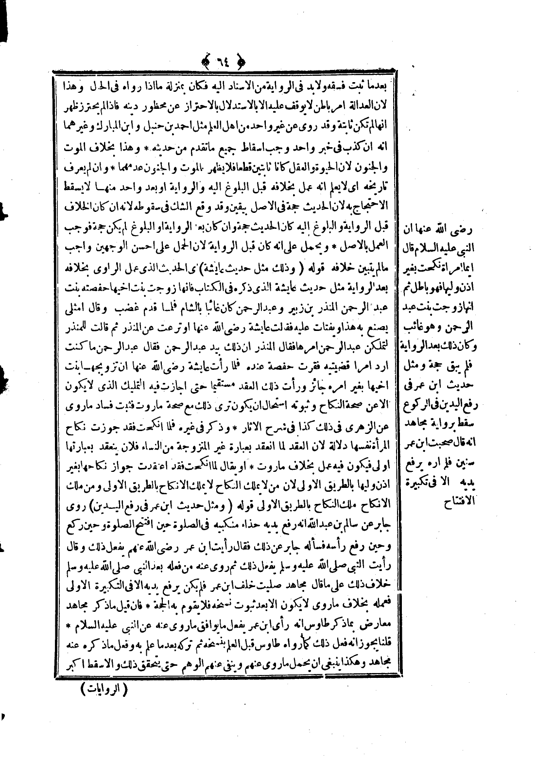- رَضِيَ اللَّهُ عَنْهَا - أَنَّ النَّبِيَّ - عَلَيْهِ السَّلَامُ - قَالَ «أَيُّمَا امْرَأَةٍ نَكَحَتْ بِغَيْرِ إذْنِ وَلِيِّهَا فَهُوَ بَاطِلٌ» ثُمَّ إنَّهَا زَوَّجَتْ بِنْتَ عَبْدِ الرَّحْمَنِ وَهُوَ غَائِبٌ وَكَانَ ذَلِكَ بَعْدَ الرِّوَايَةِ فَلَمْ يَبْقَ حُجَّةٌ وَمِثْلُ حَدِيثِ ابْنِ عُمَرَ فِي رَفْعِ الْيَدَيْنِ فِي الرُّكُوعِ سَقَطَ بِرِوَايَةِ مُجَاهِدٍ أَنَّهُ قَالَ صَحِبْت ابْنَ عُمَرَ سِنِينَ فَلَمْ أَرَهُ يَرْفَعْ يَدَيْهِ إلَّا فِي تَكْبِيرَةِ الِافْتِتَاحِ