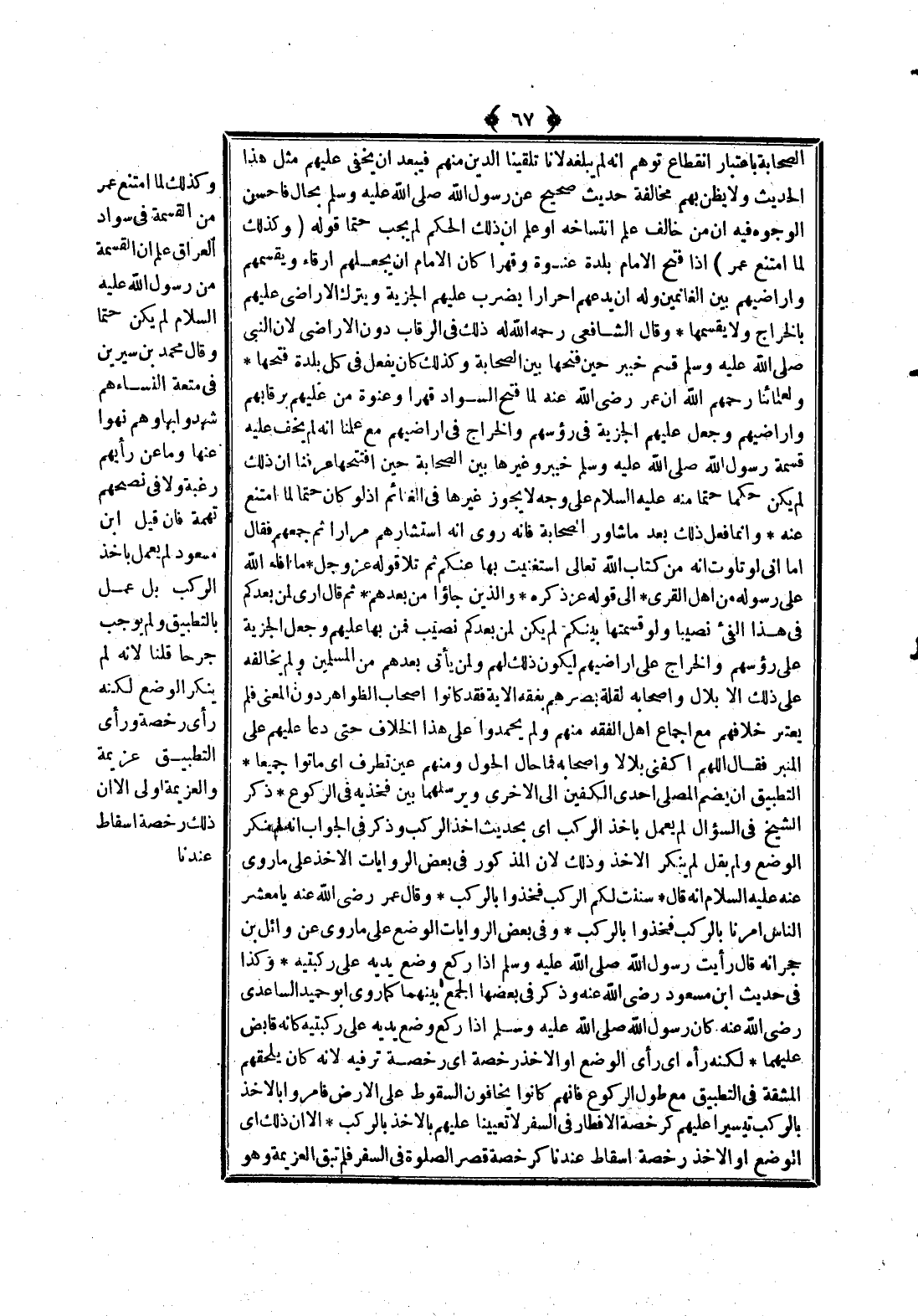 وَكَذَلِكَ لَمَّا امْتَنَعَ عُمَرُ مِنْ الْقِسْمَةِ فِي سَوَادِ الْعِرَاقِ عُلِمَ أَنَّ الْقِسْمَةَ مِنْ رَسُولِ اللَّهِ - عَلَيْهِ السَّلَامُ - لَمْ تَكُنْ حَتْمًا، وَقَالَ مُحَمَّدُ بْنُ سِيرِينَ فِي مُتْعَةِ النِّسَاءِ هُمْ شَهِدُوا بِهَا وَهُمْ نُهُوا عَنْهَا وَمَا عَنْ رَأْيِهِمْ رَغْبَةٌ وَلَا فِي نُصْحِهِمْ تُهْمَةٌ، فَإِنْ قِيلَ ابْنُ مَسْعُودٍ لَمْ يَعْمَلْ بِأَخْذِ الرَّكْبِ بَلْ عَمِلَ بِالتَّطْبِيقِ وَلَمْ يُوجِبْ جَرْحًا قُلْنَا لِأَنَّهُ لَمْ يُنْكِرْ الْوَضْعَ لَكِنَّهُ رَأَى رُخْصَةً وَرَأَى التَّطْبِيقَ عَزِيمَةً وَالْعَزِيمَةُ أَوْلَى إلَّا أَنَّ ذَلِكَ رُخْصَةُ إسْقَاطٍ عِنْدَنَا،