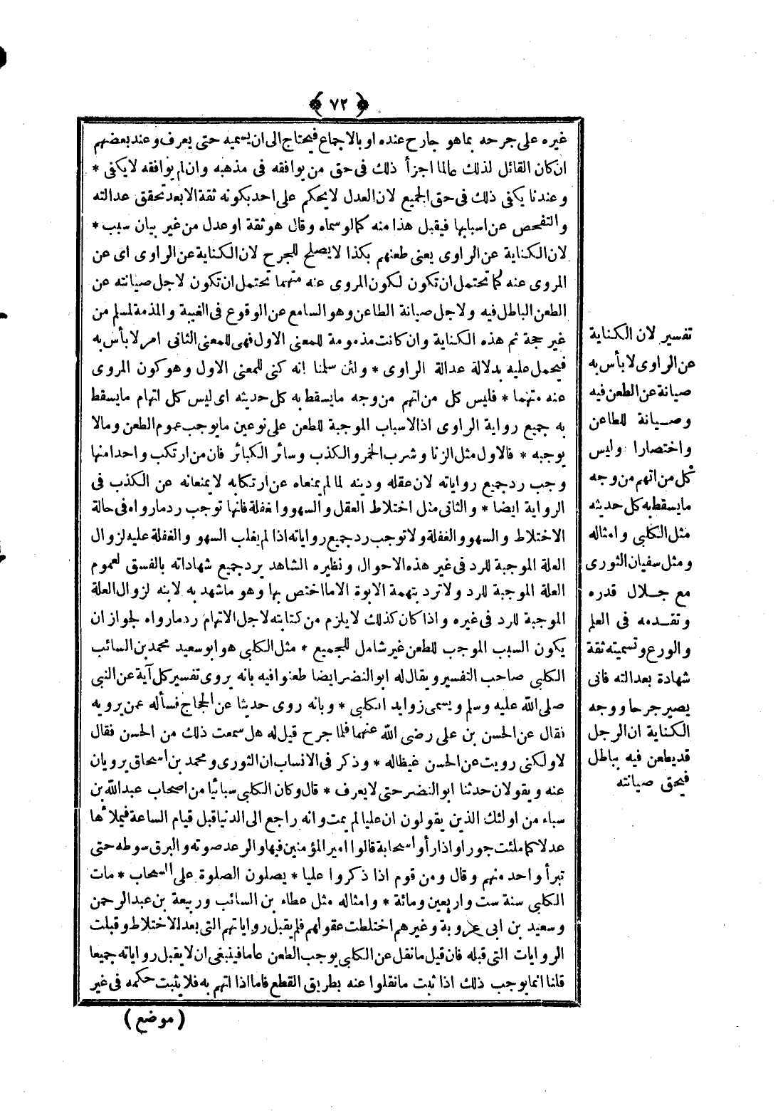 تَفْسِيرٍ؛ لِأَنَّ الْكِنَايَةَ عَنْ الرَّاوِي لَا بَأْسَ بِهِ صِيَانَةً عَنْ الطَّعْنِ فِيهِ وَصِيَانَةً لِلطَّاعِنِ وَاخْتِصَارًا وَلَيْسَ كُلُّ مَنْ اُتُّهِمَ مِنْ وَجْهٍ مَا يَسْقُطُ بِهِ كُلُّ حَدِيثِهِ وَمِثْلُ سُفْيَانَ الثَّوْرِيِّ مَعَ جَلَالِ قَدْرِهِ وَتَقَدُّمِهِ فِي الْعِلْمِ وَالْوَرَعِ وَتَسْمِيَتِهِ ثِقَةً شَهَادَةً بِعَدَالَتِهِ فَأَنَّى يَصِيرُ جَرْحًا، وَوَجْهُ الْكِنَايَةِ أَنَّ الرَّجُلَ قَدْ يُطْعَنُ فِيهِ بِبَاطِلٍ فَيَحِقُّ صِيَانَتُهُ