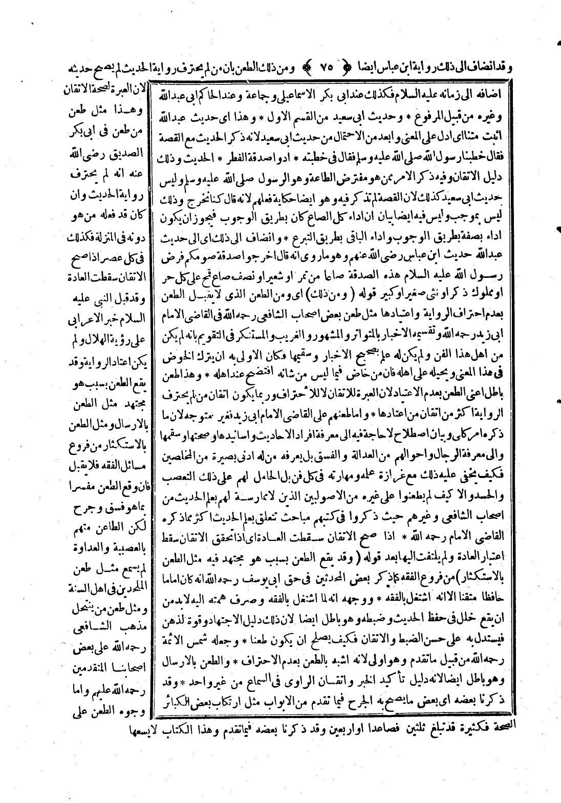 وَقَدْ انْضَافَ إلَى ذَلِكَ رِوَايَةُ ابْنِ عَبَّاسٍ أَيْضًا وَمِنْ ذَلِكَ الطَّعْنُ بِأَنَّ مَنْ لَمْ يَحْتَرِفْ رِوَايَةَ الْحَدِيثِ لَمْ يَصِحَّ حَدِيثُهُ؛ لِأَنَّ الْعِبْرَةَ لِصِحَّةِ الْإِتْقَانِ وَهَذَا مِثْلُ طَعْنِ مَنْ طَعَنَ فِي أَبِي بَكْرٍ الصِّدِّيقِ - رَضِيَ اللَّهُ عَنْهُ - أَنَّهُ لَمْ يَحْتَرِفْ رِوَايَةَ الْحَدِيثِ وَإِنْ كَانَ قَدْ فَعَلَهُ مَنْ هُوَ دُونَهُ فِي الْمَنْزِلَةِ فَكَذَلِكَ فِي كُلِّ عَصْرٍ إذَا صَحَّ الْإِتْقَانُ سَقَطَتْ الْعَادَةُ، وَقَدْ قَبِلَ النَّبِيُّ - عَلَيْهِ السَّلَامُ - خَبَرَ الْأَعْرَابِيِّ عَلَى رُؤْيَةِ الْهِلَالِ وَلَمْ يَكُنْ اعْتَادَ الرِّوَايَةَ، وَقَدْ يَقَعُ الطَّعْنُ بِسَبَبٍ هُوَ مُجْتَهِدٌ فِيهِ مِثْلُ الطَّعْنِ بِالْإِرْسَالِ وَمِثْلُ الطَّعْنِ بِالِاسْتِكْثَارِ مِنْ فُرُوعِ مَسَائِلِ الْفِقْهِ فَلَا يُقْبَلُ، فَإِنْ وَقَعَ الطَّعْنُ مُفَسَّرًا بِمَا هُوَ فِسْقٌ وَجَرْحٌ لَكِنَّ الطَّاعِنَ مُتَّهَمٌ بِالْعَصَبِيَّةِ وَالْعَدَاوَةِ لَمْ يُسْمَعْ مِثْلُ طَعْنِ الْمُلْحِدِينَ فِي أَهْلِ السُّنَّةِ وَمِثْلُ طَعْنِ مَنْ يَنْتَحِلُ مَذْهَبَ الشَّافِعِيِّ - رَحِمَهُ اللَّهُ - عَلَى بَعْضِ أَصْحَابِنَا الْمُتَقَدِّمِينَ رَحْمَةُ اللَّهِ عَلَيْهِمْ.