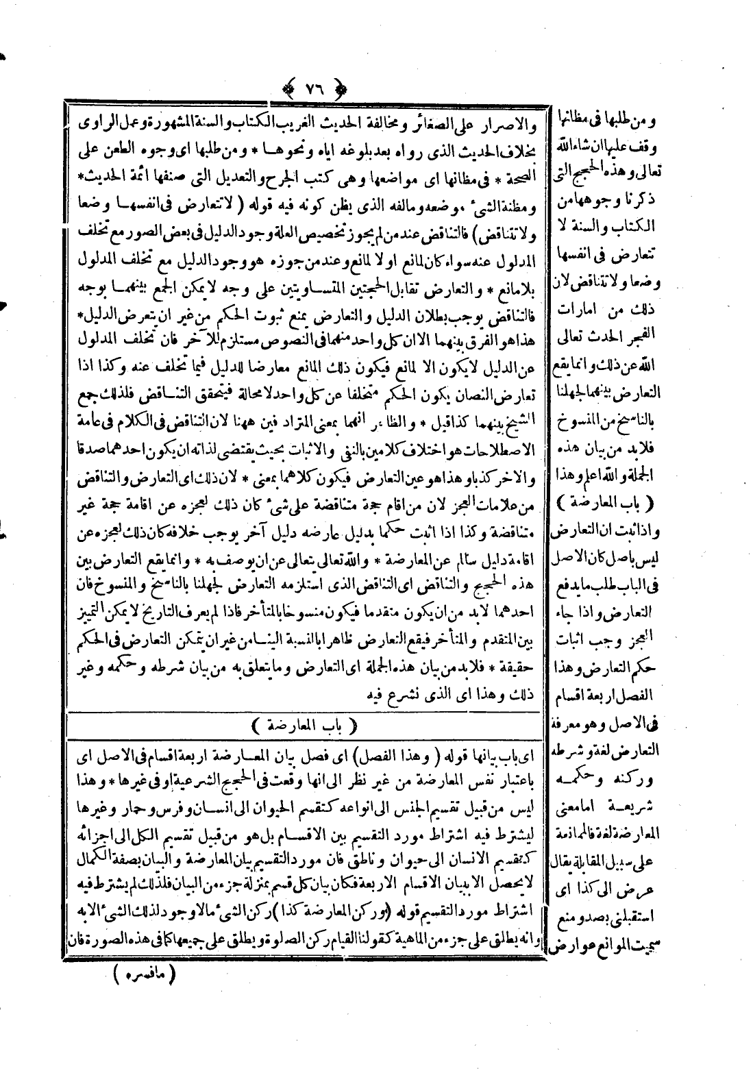 وَإِذَا ثَبَتَ أَنَّ التَّعَارُضَ لَيْسَ بِأَصْلٍ كَانَ الْأَصْلُ فِي الْبَابِ طَلَبُ مَا يَدْفَعُ التَّعَارُضَ، وَإِذَا جَاءَ الْعَجْزُ وَجَبَ إثْبَاتُ حُكْمِ التَّعَارُضِ وَهَذَا الْفَصْلُ أَرْبَعَةُ أَقْسَامٍ فِي الْأَصْلِ وَهُوَ مَعْرِفَةُ التَّعَارُضِ لُغَةً وَشَرْطِهِ وَرُكْنِهِ وَحُكْمِهِ شَرِيعَةً أَمَّا مَعْنَى الْمُعَارَضَةِ لُغَةً فَالْمُمَانَعَةُ عَلَى سَبِيلِ الْمُقَابَلَةِ يُقَالُ عَرَضَ إِلَيَّ بِكَذَا أَيْ اسْتَقْبَلَنِي بِصَدٍّ وَمَنْعٍ سُمِّيَتْ الْمَوَانِعُ عَوَارِضُ،