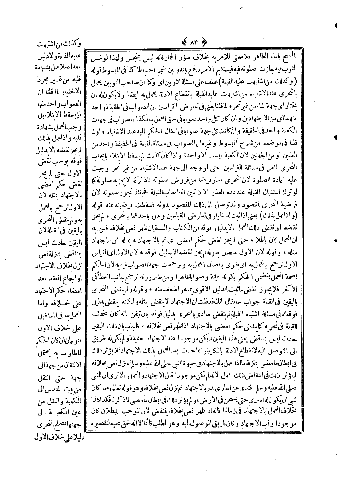 وَقَوْلُهُ لَمْ يُنْقَضْ التَّحَرِّي بِالْيَقِينِ فِي الْقِبْلَةِ جَوَابٌ عَمَّا يُقَالُ إنَّك قَدْ قُلْت إنَّ الِاجْتِهَادَ لَا يُنْقَضُ بِمِثْلِهِ وَلَكِنَّهُ يُنْقَضُ بِدَلِيلٍ فَوْقَهُ فِي مَسْأَلَةِ اشْتِبَاهِ الْقِبْلَةِ لَمْ يُنْقَضْ مَا أَدَّى بِالتَّحَرِّي بِدَلِيلٍ فَوْقَهُ بِأَنْ تَيَقَّنَ بِأَنَّهُ كَانَ مُخْطِئًا لِلْقِبْلَةِ فِي تَحَرِّيهِ، كَمَا يُنْقَضُ حُكْمٌ أُمْضِيَ بِالِاجْتِهَادِ إذَا ظَهَرَ نَصٌّ بِخِلَافِهِ، فَأَجَابَ بِأَنَّ ذَلِكَ الْيَقِينَ حَادِثٌ لَيْسَ بِمُنَاقِضٍ يَعْنِي هَذَا الْيَقِينُ لَمْ يَكُنْ مَوْجُودًا عِنْدَ الِاجْتِهَادِ حَقِيقَةً وَلَمْ يَكُنْ لَهُ طَرِيقٌ إلَى التَّوَصُّلِ إلَيْهِ لِانْقِطَاعِ الْأَدِلَّةِ بِالْكُلِّيَّةِ وَإِنَّمَا حَدَثَ بَعْدَ الْعَمَلِ بِذَلِكَ الِاجْتِهَادِ فَلَا يُؤَثِّرُ ذَلِكَ فِي إبْطَالِ مَا مَضَى بِمَنْزِلَةِ مَا إذَا عَمِلَ بِالِاجْتِهَادِ فِي حَيَاةِ النَّبِيِّ - صَلَّى اللَّهُ عَلَيْهِ وَسَلَّمَ - ثُمَّ نَزَلَ نَصٌّ بِخِلَافِهِ لَمْ يُؤَثِّرْ ذَلِكَ فِي انْتِقَاضِ ذَلِكَ الْعَمَلِ؛ لِأَنَّهُ لَمْ يَكُنْ مَوْجُودًا قَبْلَ الِاجْتِهَادِ وَالْعَمَلِ أَلَا تَرَى أَنَّ النَّبِيَّ - صَلَّى اللَّهُ عَلَيْهِ وَسَلَّمَ - افْتَدَى عَنْ أُسَارَى بَدْرٍ بِالِاجْتِهَادِ ثُمَّ نَزَلَ نَصٌّ بِخِلَافِهِ وَهُوَ قَوْله تَعَالَى {مَا كَانَ لِنَبِيٍّ أَنْ يَكُونَ لَهُ أَسْرَى حَتَّى يُثْخِنَ فِي الأَرْضِ} [الأنفال: 67] وَلَمْ يُؤَثِّرْ ذَلِكَ فِي إبْطَالِ مَا مَضَى لِمَا ذَكَرْنَا فَكَذَا هَذَا بِخِلَافِ الْعَمَلِ بِالِاجْتِهَادِ فِي زَمَانِنَا فَإِنَّهُ إذَا ظَهَرَ نَصٌّ بِخِلَافِهِ يُنْتَقَضُ؛ لِأَنَّ الْمُوجِبَ لِلْبُطْلَانِ كَانَ مَوْجُودًا وَقْتَ الِاجْتِهَادِ وَكَانَ طَرِيقُ الْوُصُولِ إلَيْهِ وَهُوَ الطَّلَبُ قَائِمًا إلَّا أَنَّهُ خَفِيَ عَلَيْهِ لِتَقْصِيرِهِ