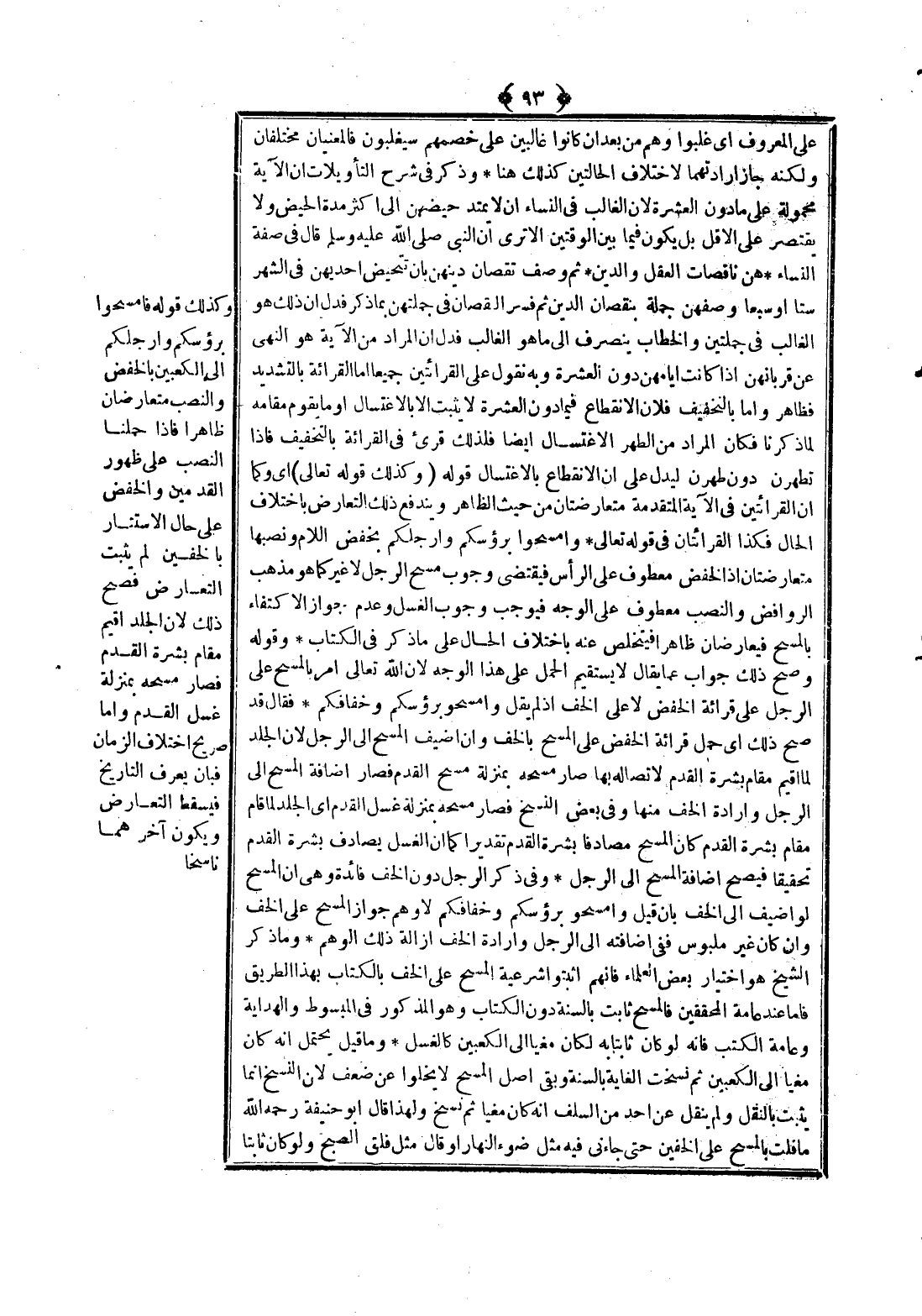 وَمَا قِيلَ يُحْتَمَلُ أَنَّهُ كَانَ مُغَيًّا إلَى الْكَعْبَيْنِ ثُمَّ نُسِخَتْ الْغَايَةُ بِالسُّنَّةِ وَبَقِيَ أَصْلُ الْمَسْحِ لَا يَخْلُو عَنْ ضَعْفٍ؛ لِأَنَّ النَّسْخَ إنَّمَا يَثْبُتُ بِالنَّقْلِ وَلَمْ يُنْقَلْ عَنْ أَحَدٍ مِنْ السَّلَفِ أَنَّهُ كَانَ مُغَيًّا ثُمَّ نُسِخَ، وَلِهَذَا قَالَ أَبُو حَنِيفَةَ - رَحِمَهُ اللَّهُ - مَا قُلْت بِالْمَسْحِ عَلَى الْخُفَّيْنِ حَتَّى جَاءَنِي فِيهِ مِثْلُ ضَوْءِ النَّهَارِ أَوْ قَالَ مِثْلُ فَلَقِ الصُّبْحِ، وَلَوْ كَانَ ثَابِتًا