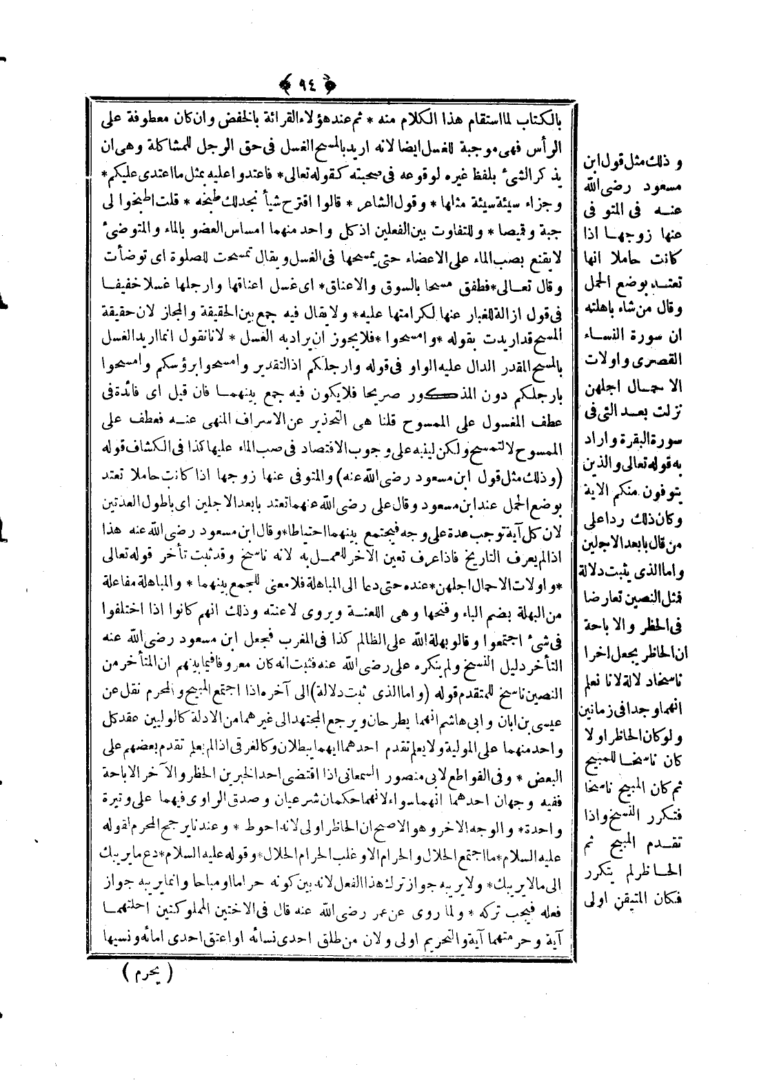 وَلِلتَّفَاوُتِ بَيْنَ الْفِعْلَيْنِ إذْ كُلُّ وَاحِدٍ مِنْهُمَا إمْسَاسُ الْعُضْوِ بِالْمَاءِ وَالْمُتَوَضِّئُ لَا يَقْنَعُ بِصَبِّ الْمَاءِ عَلَى الْأَعْضَاءِ حَتَّى يَمْسَحَهَا فِي الْغَسْلِ وَيُقَالُ تَمَسَّحْت لِلصَّلَاةِ أَيْ تَوَضَّأْت، وَقَالَ تَعَالَى {فَطَفِقَ مَسْحًا بِالسُّوقِ وَالأَعْنَاقِ} [ص: 33] أَيْ غَسَلَ أَعْنَاقَهَا وَأَرْجُلَهَا غَسْلًا خَفِيفًا فِي قَوْلٍ إزَالَةً لِلْغُبَارِ عَنْهَا لِكَرَامَتِهَا عَلَيْهِ، وَلَا يُقَالُ فِيهِ جَمْعٌ بَيْنَ الْحَقِيقَةِ وَالْمَجَازِ؛ لِأَنَّ حَقِيقَةَ الْمَسْحِ قَدْ أُرِيدَتْ بِقَوْلِهِ {وَامْسَحُوا} [المائدة: 6] فَلَا يَجُوزُ أَنْ يُرَادَ بِهِ الْغَسْلُ؛ لِأَنَّا نَقُولُ إنَّمَا أُرِيدَ الْغَسْلُ بِالْمَسْحِ الْمُقَدَّرِ الدَّالِّ عَلَيْهِ الْوَاوُ فِي قَوْلِهِ {وَأَرْجُلَكُمْ} [المائدة: 6] إذْ التَّقْدِيرُ وَامْسَحُوا بِرُءُوسِكُمْ وَامْسَحُوا بِأَرْجُلِكُمْ دُونَ الْمَذْكُورِ صَرِيحًا فَلَا يَكُونُ فِيهِ جَمْعٌ بَيْنَهُمَا فَإِنْ قِيلَ أَيُّ فَائِدَةٍ فِي عَطْفِ الْمَغْسُولِ عَلَى الْمَمْسُوحِ؟ قُلْنَا هِيَ التَّحْذِيرُ عَنْ الْإِسْرَافِ الْمَنْهِيِّ عَنْهُ فَعُطِفَ عَلَى الْمَمْسُوحِ لَا لِتُمْسَحَ وَلَكِنْ لِيُنَبِّهَ عَلَى وُجُوبِ الِاقْتِصَادِ فِي صَبِّ الْمَاءِ عَلَيْهَا كَذَا فِي الْكَشَّافِ قَوْلُهُ (وَذَلِكَ مِثْلُ قَوْلِ ابْنِ مَسْعُودٍ - رَضِيَ اللَّهُ عَنْهُ -) وَالْمُتَوَفَّى عَنْهَا زَوْجُهَا إذَا كَانَتْ حَامِلًا تَعْتَدُّ بِوَضْعِ الْحَمْلِ عِنْدَ ابْنِ مَسْعُودٍ، وَقَالَ عَلِيٌّ - رَضِيَ اللَّهُ عَنْهُ - تَعْتَدُّ بِأَبْعَدِ الْأَجَلَيْنِ أَيْ بِأَطْوَلِ الْعِدَّتَيْنِ؛ لِأَنَّ كُلَّ آيَةٍ تُوجِبُ عِدَّةً عَلَى وَجْهٍ فَيُجْمَعُ بَيْنَهُمَا احْتِيَاطًا، وَقَالَ ابْنُ مَسْعُودٍ - رَضِيَ اللَّهُ عَنْهُ - هَذَا إذَا لَمْ يُعْرَفْ التَّارِيخُ فَإِذَا عُرِفَ تَعَيَّنَ الْآخَرُ لِلْعَمَلِ بِهِ؛ لِأَنَّهُ نَاسِخٌ، وَقَدْ ثَبَتَ تَأَخُّرُ قَوْله تَعَالَى {وَأُولاتُ الأَحْمَالِ أَجَلُهُنَّ} [الطلاق: 4] عِنْدَهُ حَتَّى دَعَا إلَى الْمُبَاهَلَةِ فَلَا مَعْنَى لِلْجَمْعِ بَيْنَهُمَا، وَالْمُبَاهَلَةُ مُفَاعَلَةٌ مِنْ الْبُهْلَةِ بِضَمِّ الْبَاءِ وَفَتْحِهَا وَهِيَ اللَّعْنَةُ وَيُرْوَى لَاعَنْته. وَذَلِكَ أَنَّهُمْ كَانُوا إذَا اخْتَلَفُوا فِي شَيْءٍ اجْتَمَعُوا وَقَالُوا بُهْلَةُ اللَّهِ عَلَى الظَّالِمِ كَذَا فِي الْمُغْرِبِ فَجَعَلَ ابْنُ مَسْعُودٍ - رَضِيَ اللَّهُ عَنْهُ - التَّأَخُّرَ دَلِيلَ النَّسْخِ وَلَمْ يُنْكِرْهُ عَلِيٌّ - رَضِيَ اللَّهُ عَنْهُ - فَثَبَتَ أَنَّهُ كَانَ مَعْرُوفًا فِيمَا بَيْنَهُمْ أَنَّ الْمُتَأَخِّرَ مِنْ النَّصَّيْنِ نَاسِخٌ لِلْمُتَقَدِّمِ، قَوْلُهُ (وَأَمَّا الَّذِي ثَبَتَ دَلَالَةً) إلَى آخِرِهِ إذَا اجْتَمَعَ الْمُبِيحُ وَالْمُحَرِّمُ نُقِلَ عَنْ عِيسَى بْنِ أَبَانَ وَأَبِي هَاشِمٍ أَنَّهُمَا يُطْرَحَانِ وَيَرْجِعُ الْمُجْتَهِدُ إلَى غَيْرِهِمَا مِنْ الْأَدِلَّةِ كَالْوَلِيَّيْنِ عَقَدَ كُلُّ وَاحِدٍ مِنْهُمَا عَلَى الْمُوَلِّيَةِ وَلَا يُعْلَمُ تَقَدُّمُ أَحَدِهِمَا أَنَّهُمَا يَبْطُلَانِ وَكَالْغَرْقَى بَعْضُهُمْ عَلَى الْبَعْضِ، وَفِي الْقَوَاطِعِ لِأَبِي مَنْصُورٍ السَّمْعَانِيِّ إذَا اقْتَضَى أَحَدُ الْخَبَرَيْنِ الْحَظْرَ وَالْآخَرُ الْإِبَاحَةَ فَفِيهِ وَجْهَانِ أَحَدُهُمَا أَنَّهُمَا سَوَاءٌ؛ لِأَنَّهُمَا حُكْمَانِ شَرْعِيَّانِ وَصَدَقَ الرَّاوِي فِيهِمَا عَلَى وَتِيرَةٍ وَاحِدَةٍ، وَالْوَجْهُ الْآخَرُ وَهُوَ الْأَصَحُّ أَنَّ الْحَاظِرَ أَوْلَى؛ لِأَنَّهُ أَحْوَطُ، وَعِنْدَنَا يُرَجَّحُ الْمُحَرِّمُ لِقَوْلِهِ - عَلَيْهِ السَّلَامُ - «مَا 