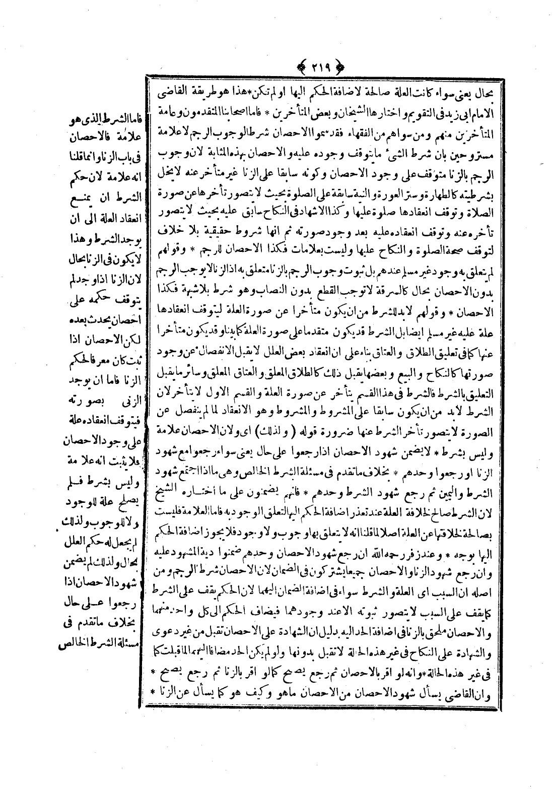 ـــــــــــــــــــــــــــــQبِحَالٍ يَعْنِي سَوَاءٌ كَانَتْ الْعِلَّةُ صَالِحَةً لِإِضَافَةِ الْحُكْمِ إلَيْهَا أَوْ لَمْ تَكُنْ هَذَا هُوَ طَرِيقَةُ الْقَاضِي الْإِمَامِ أَبِي زَيْدٍ فِي التَّقْوِيمِ وَاخْتَارَهَا الشَّيْخَانِ وَبَعْضُ الْمُتَأَخِّرِينَ فَأَمَّا أَصْحَابُنَا الْمُتَقَدِّمُونَ وَعَامَّةُ الْمُتَأَخِّرِينَ مِنْهُمْ وَمَنْ سِوَاهُمْ مِنْ الْفُقَهَاءِ فَقَدْ سَمَّوْا الْإِحْصَانَ شَرْطًا لِوُجُوبِ الرَّجْمِ لَا عَلَامَةً مُسْتَرْوِحِينَ بِأَنَّ شَرْطَ الشَّيْءِ مَا يَتَوَقَّفُ وُجُودُهُ عَلَيْهِ وَالْإِحْصَانُ بِهَذِهِ الْمَثَابَةِ؛ لِأَنَّ وُجُوبَ الرَّجْمِ بِالزِّنَا مُتَوَقِّفٌ عَلَى وُجُودِ الْإِحْصَانِ وَكَوْنُهُ سَابِقًا عَلَى الزِّنَا غَيْرَ مُتَأَخِّرٍ عَنْهُ لَا يُخِلُّ بِشَرْطِيَّتِهِ كَالطَّهَارَةِ وَسَتْرِ الْعَوْرَةِ وَالنِّيَّةُ سَابِقَةٌ عَلَى الصَّلَاةِ بِحَيْثُ لَا يُتَصَوَّرُ تَأَخُّرُهَا عَنْ صُورَةِ الصَّلَاةِ وَتَوَقَّفَ انْعِقَادُهَا صَلَاةً عَلَيْهَا وَكَذَا الْإِشْهَادُ فِي النِّكَاحِ سَابِقٌ عَلَيْهِ بِحَيْثُ لَا يُتَصَوَّرُ تَأَخُّرُهُ عَنْهُ وَتَوَقَّفَ انْعِقَادُهُ عَلَيْهِ بَعْدَ وُجُودِ صُورَتِهِ ثُمَّ إنَّهَا شُرُوطٌ حَقِيقِيَّةٌ بِلَا خِلَافٍ لِتَوَقُّفِ صِحَّةِ الصَّلَاةِ وَالنِّكَاحِ عَلَيْهَا وَلَيْسَتْ بِعَلَامَاتٍ فَكَذَا الْإِحْصَانُ لِلرَّجْمِ.